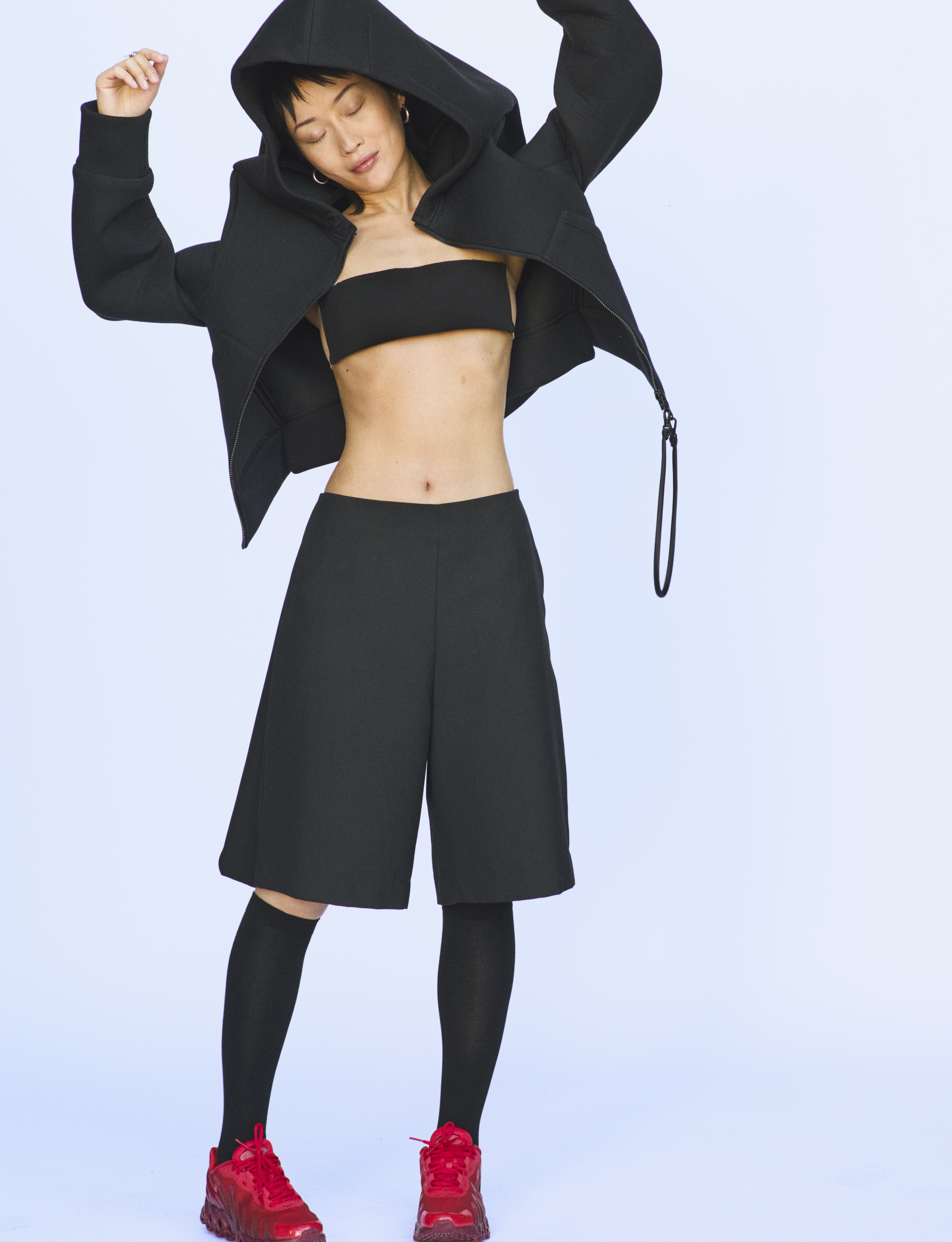 Cora wears hoodie and bra COURRÈGES, shorts AXEL ARIGATO, socks DORE DORE, jewellery talent’s own and shoes NIKE Dn8