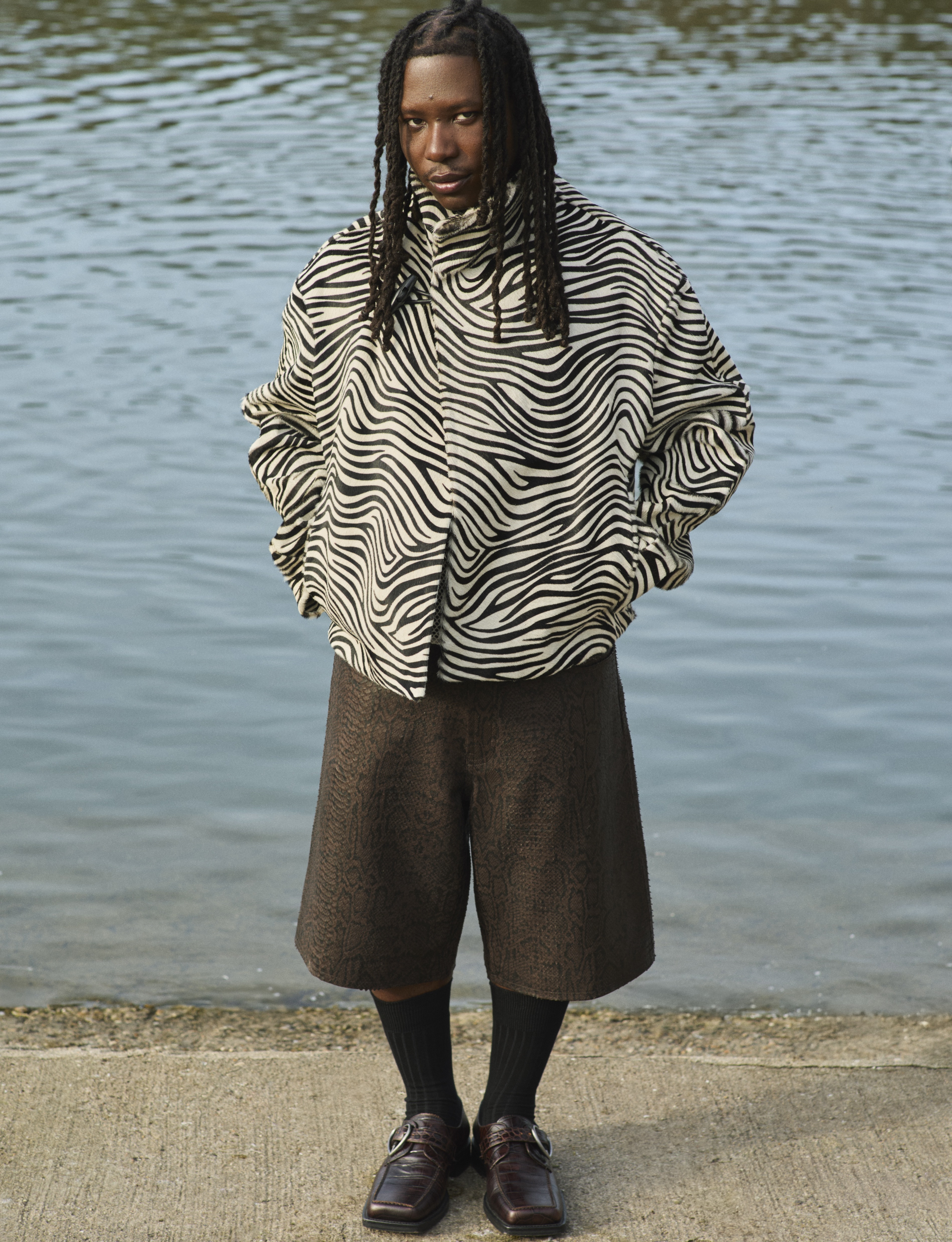 Renz wears jacket JACQUEMUS, shorts SUPREME, socks PANTHERELLA and shoes MARTINE ROSE