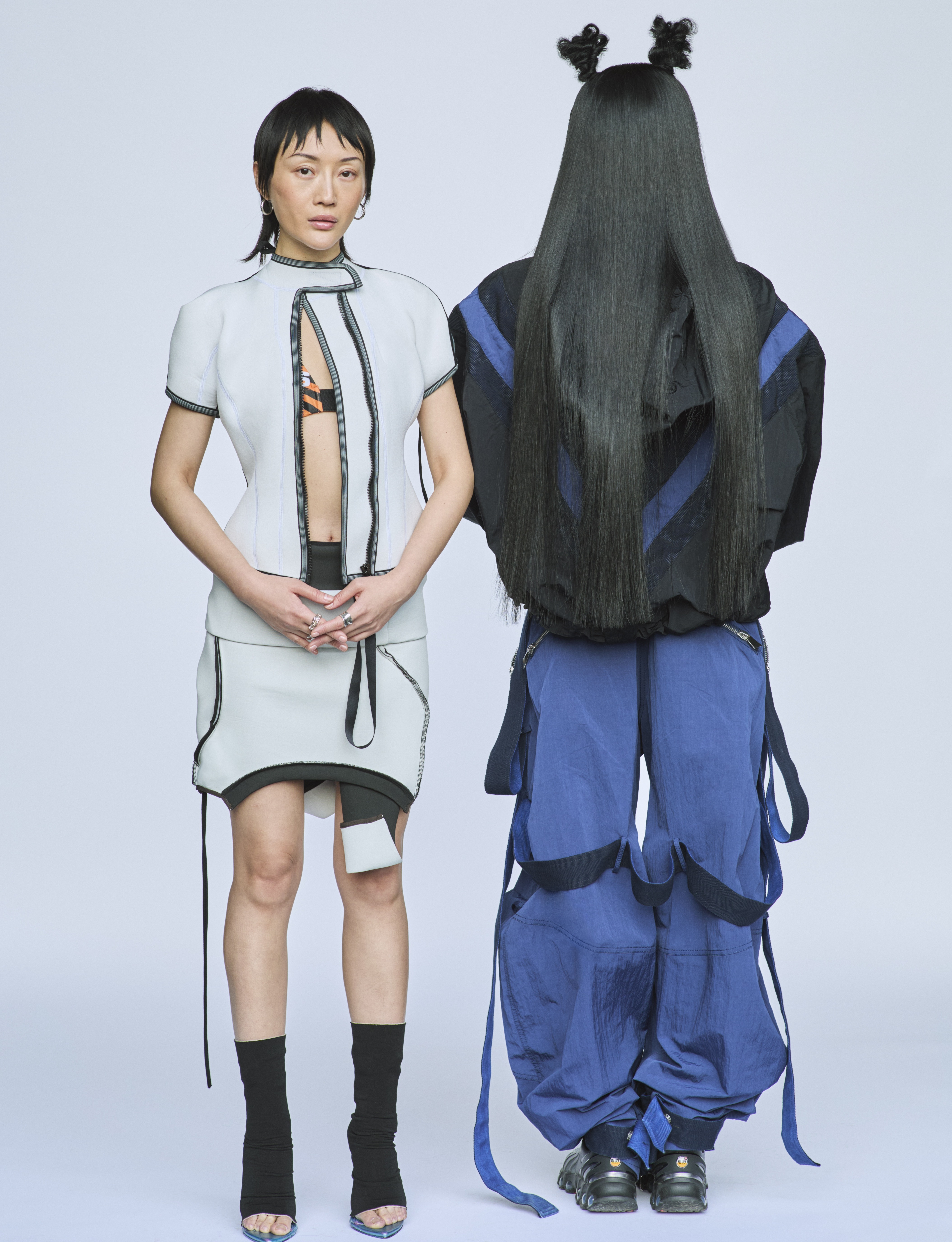 Cora wears top, bra, skirt and shoes OTTOLINGER; Chy wears jacket and trousers THE ATTICO and shoes NIKE Dn8