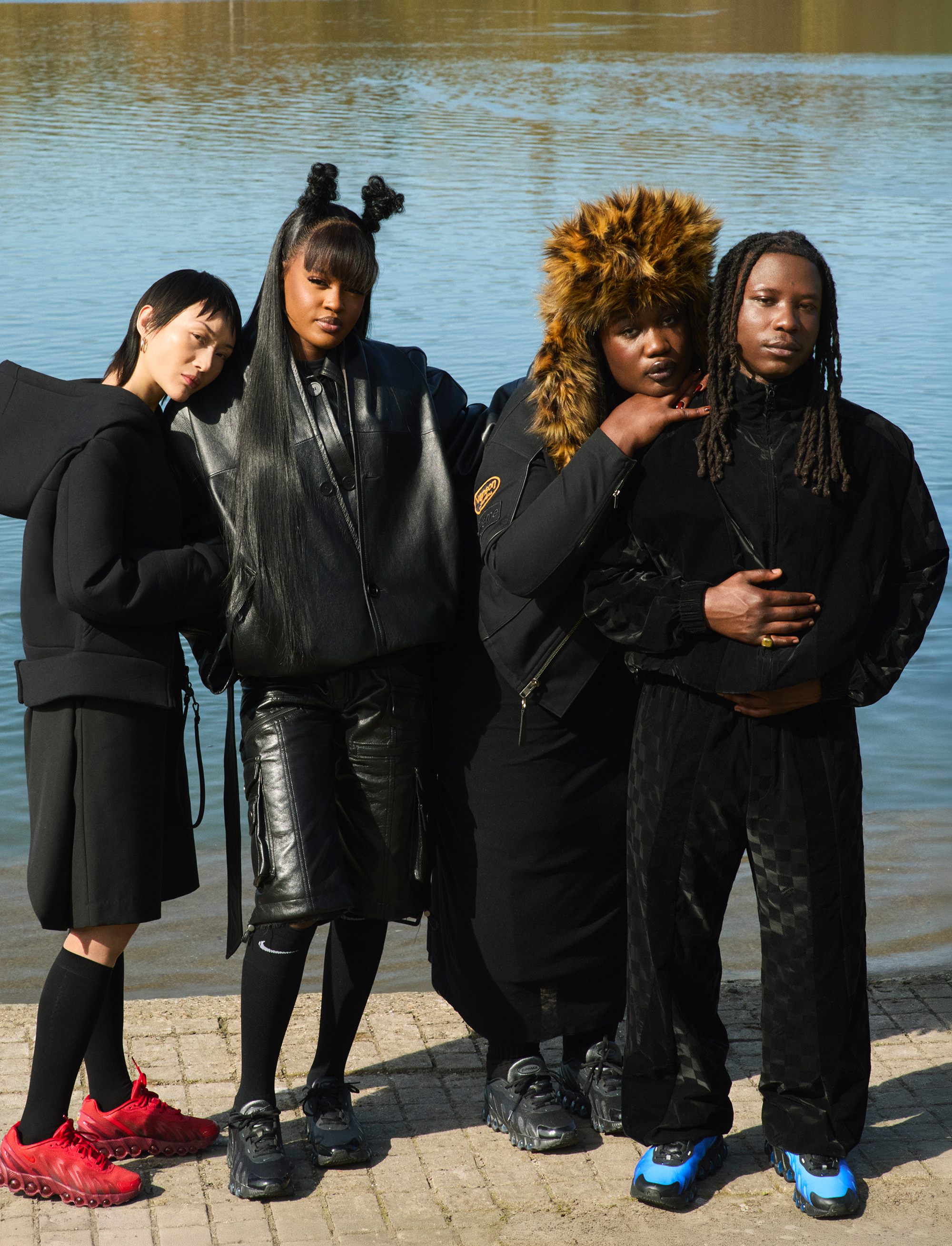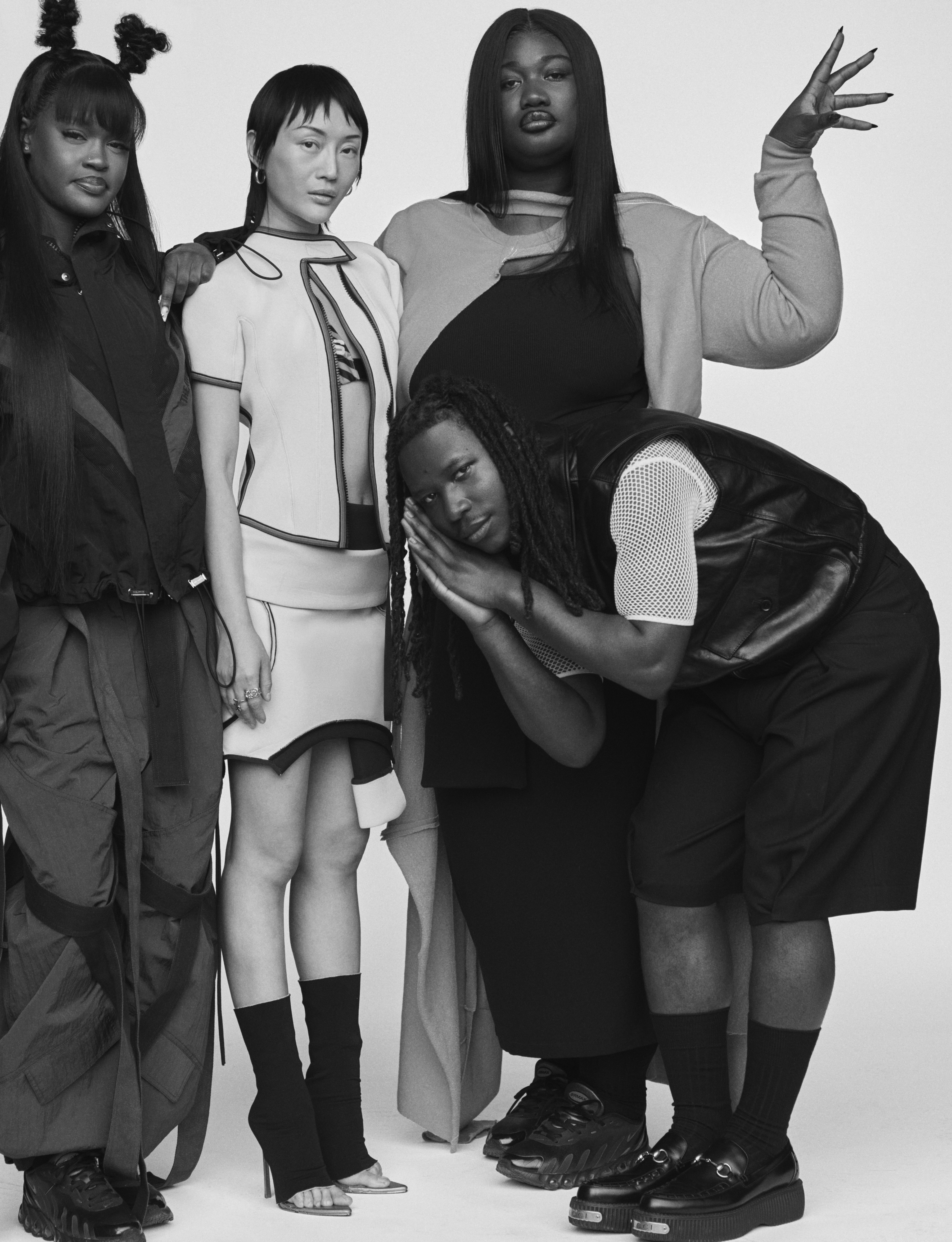 Chy wears jacket and trousers THE ATTICO and shoes NIKE Dn8; Cora wears top, bra, skirt and shoes OTTOLINGER; Crystallmess wears top OTTOLINGER, dress SKIMS, socks FALKE and shoes NIKE Dn8; Renz wears jacket and T‑shirt BALLY, shorts CASABLANCA, socks PANTHERELLA and shoes GUCCI