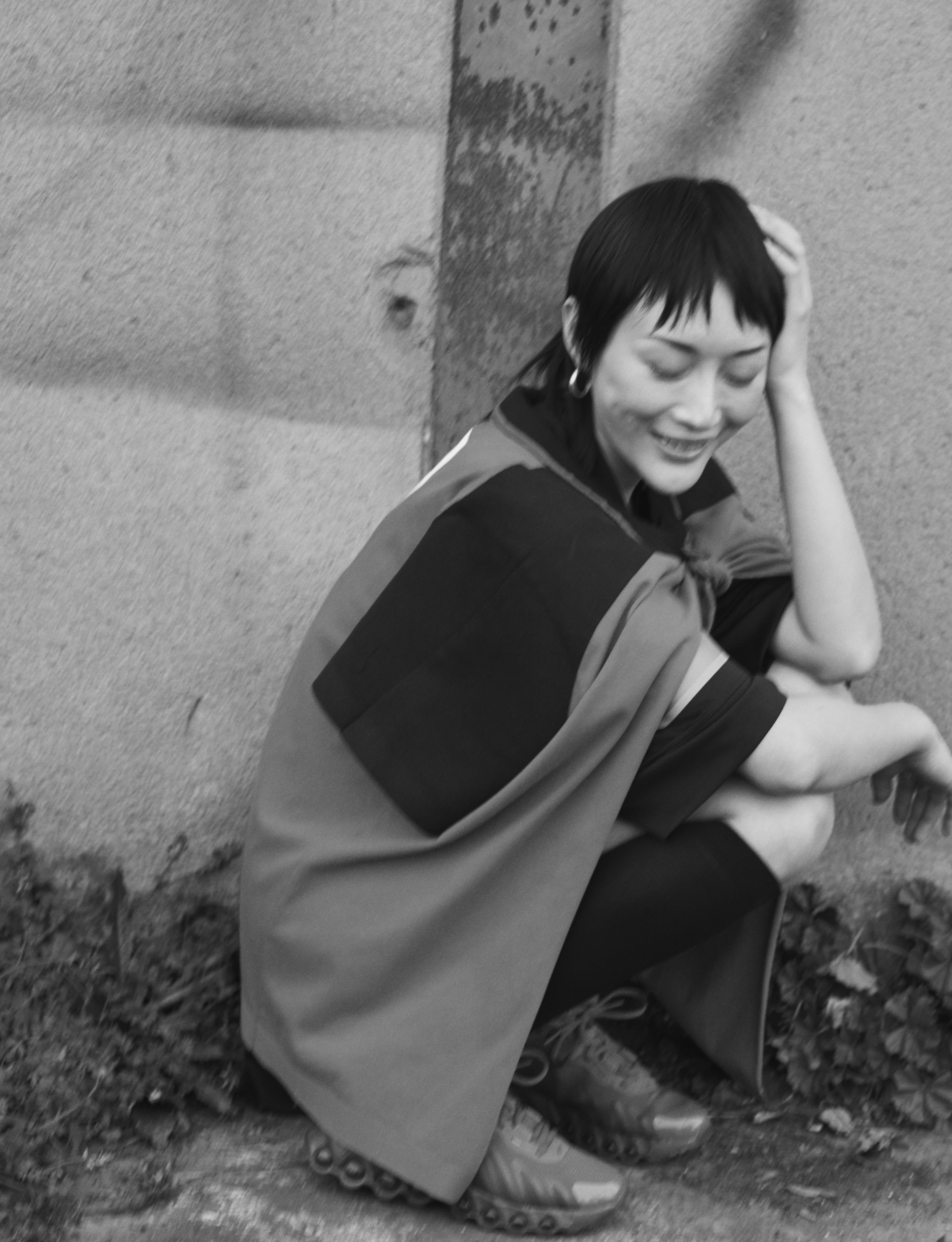Cora wears cape MARNI, socks DORE DORE and shoes NIKE Dn8