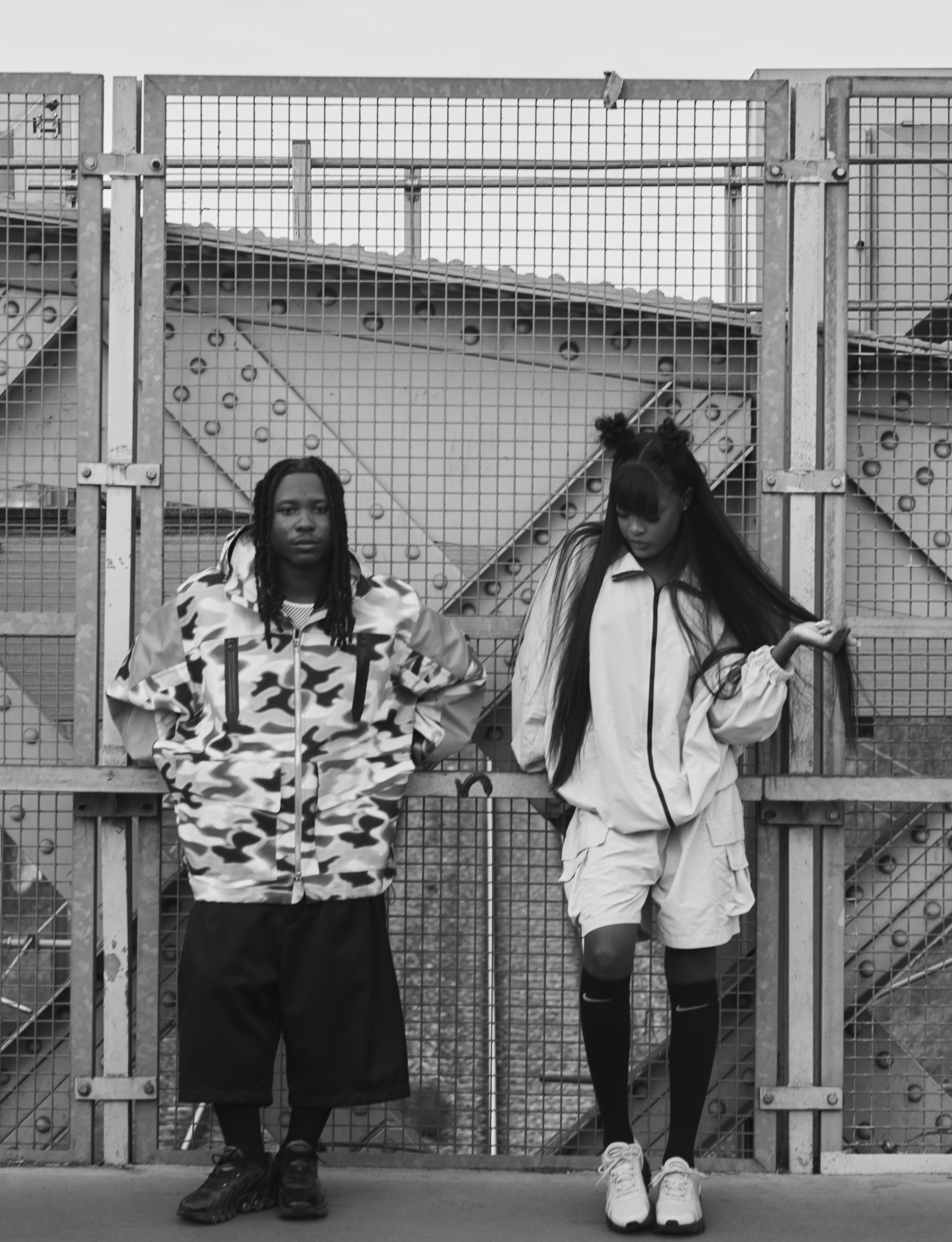 Renz wears jacket BLUMARBLE, T‑shirt BALLY, shorts WILLY CHAVARRIA, socks PANTHERELLA and shoes NIKE Dn8; Chy wears jacket and shorts ABRA, socks NIKE and shoes NIKE Dn8