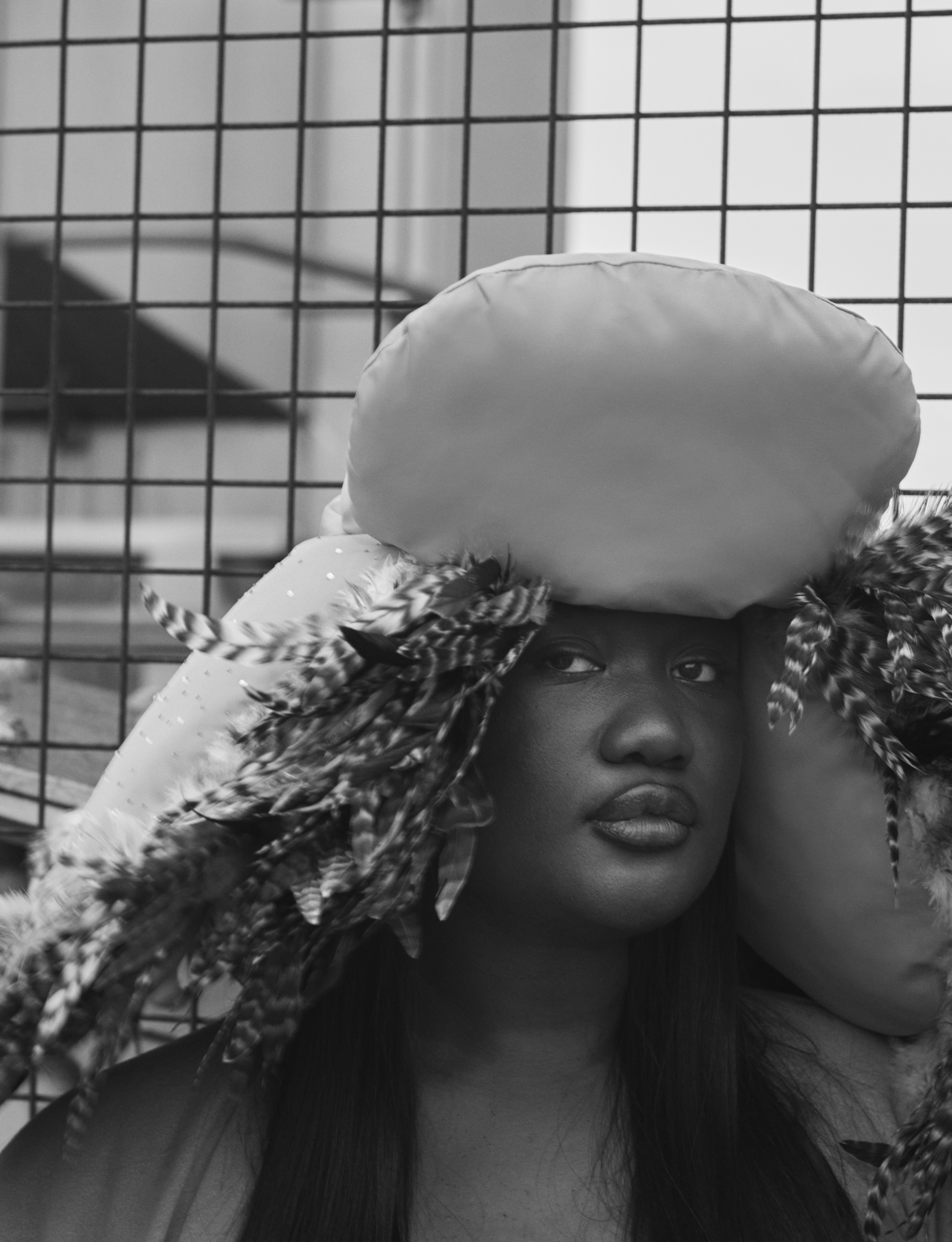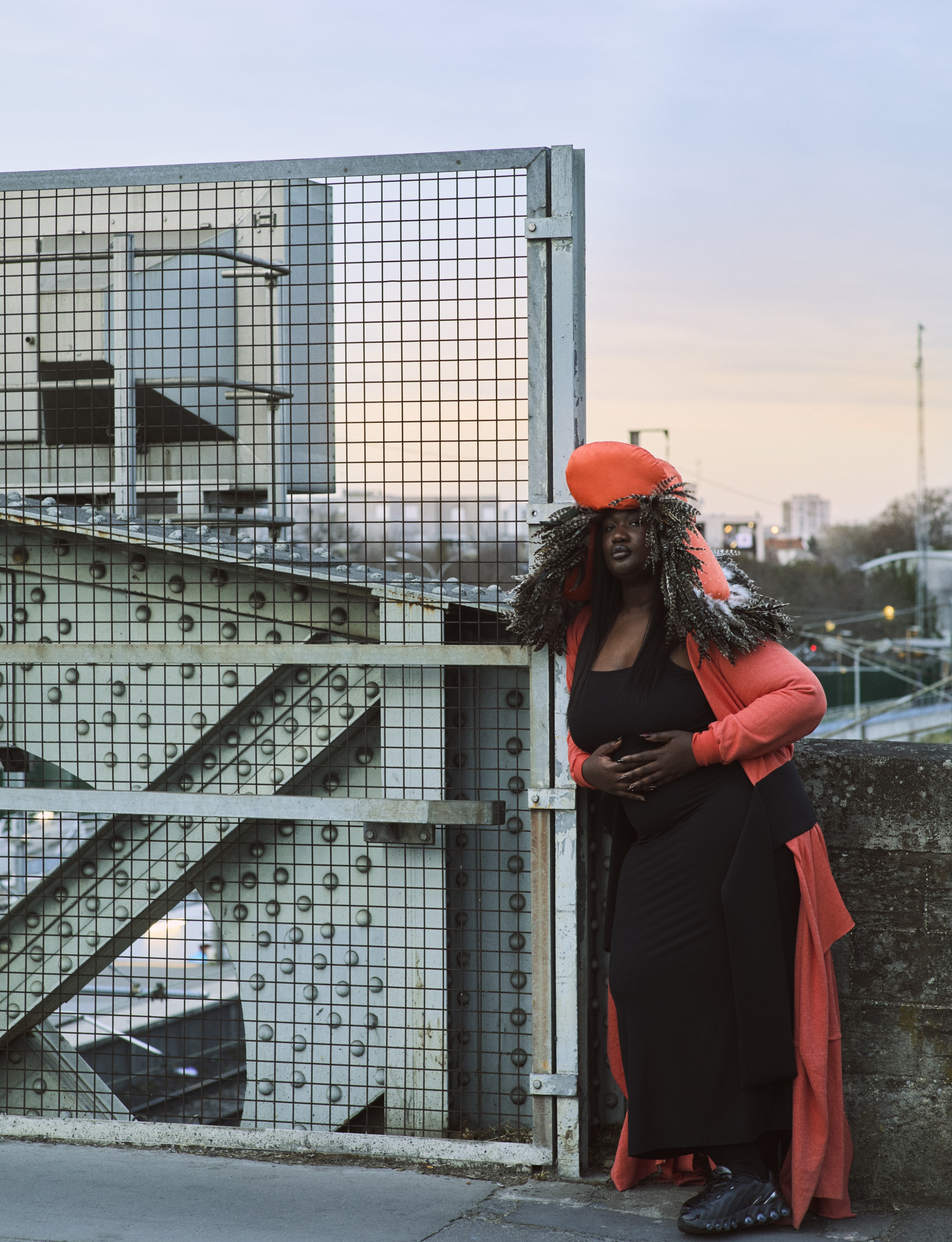 Crystallmess wears jacket OTTOLINGER, dress SKIMS, hat BLUEMARBLE and shoes NIKE Dn8
