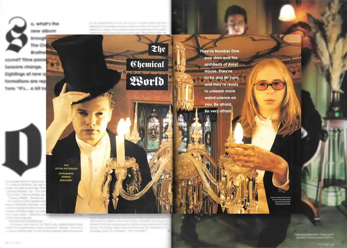 “Yeah,” says Tom and clangs on a stray keyboard. “Our own personal choices on drugs are private, between us,” states Ed. “Bands characterise themselves by cocaine and Ecstasy and I think it takes something away. Yeah, we’re called The Chemical Brothers (small grin)… When we had to change it we used to think it was pretty stupid, actually, like The Beastie Boys will always be The Beastie Boys… I kind of like it now. But… it’s not like we’re denying anything, but (exasperated) young people have died, it’s knocked a lot of the wind out of its sails, taken away the celebratory feeling and it’s become a different thing. But, y’know, you should just be free to do what you wanna do.”