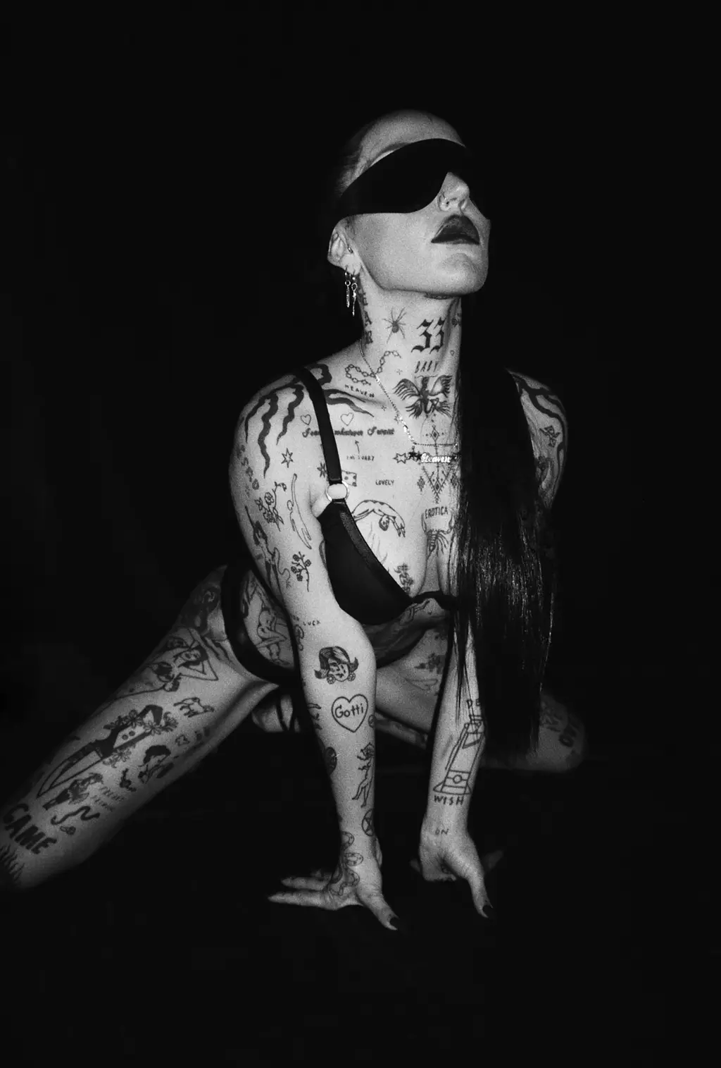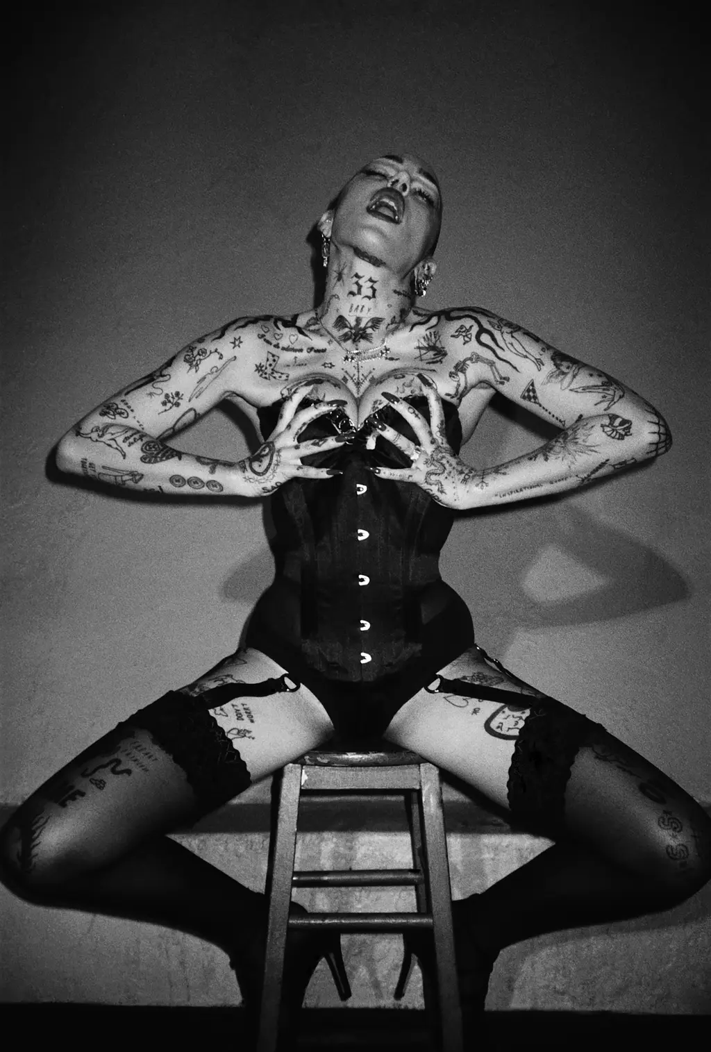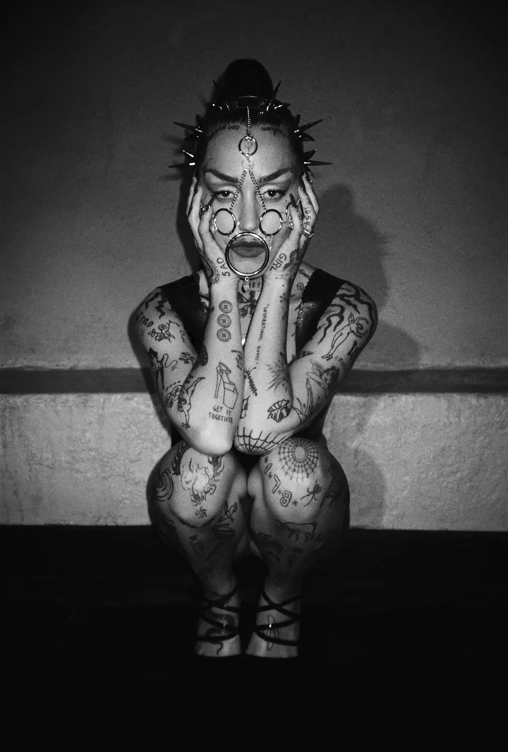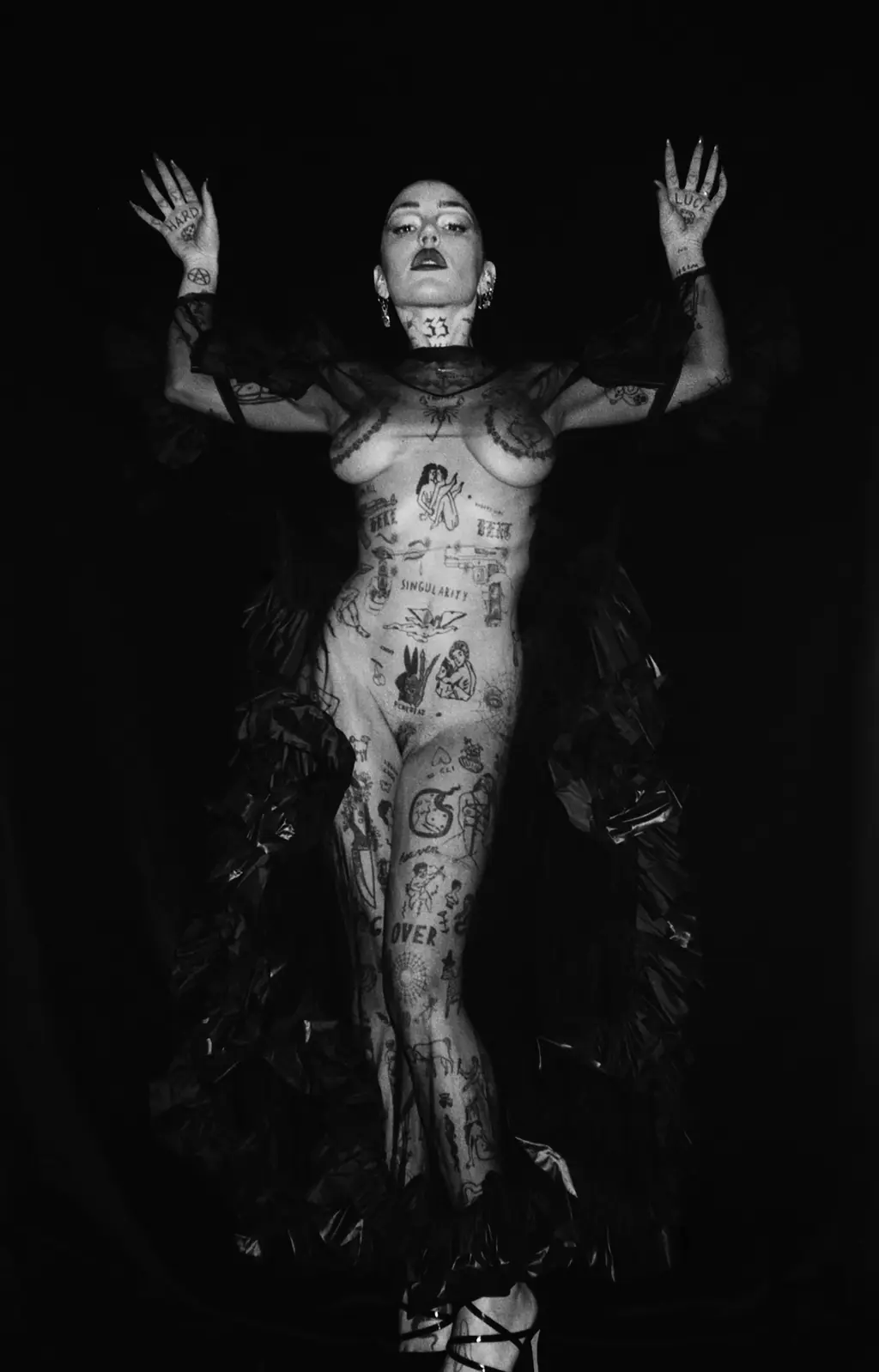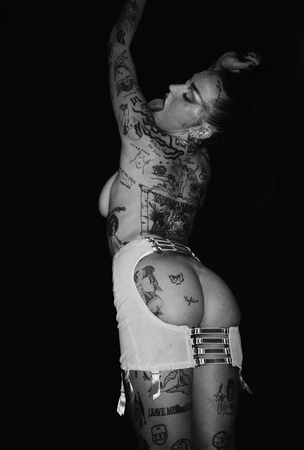 Finland’s aesthetic is similarly stamped across Brooke’s photo shoot for The Face, improvised last-minute alongside long-term collaborator Matt King. “I actually had a shoot booked with [a different] magazine,” she explains, “but they sent this ultra-racist mood board, which was abusive to animals. They had a set-up of me with a real, severed pig’s head between my legs, and they wanted me to tattoo it.” Everyone in her team agreed the premise was “vile and disgusting”; and they decided to not show up, so Brooke took the pre-arranged team to make magic on their own terms. “The space was like an ice-cold underground lair,” she laughs, “but I’d rather shoot there than promote that imagery.”