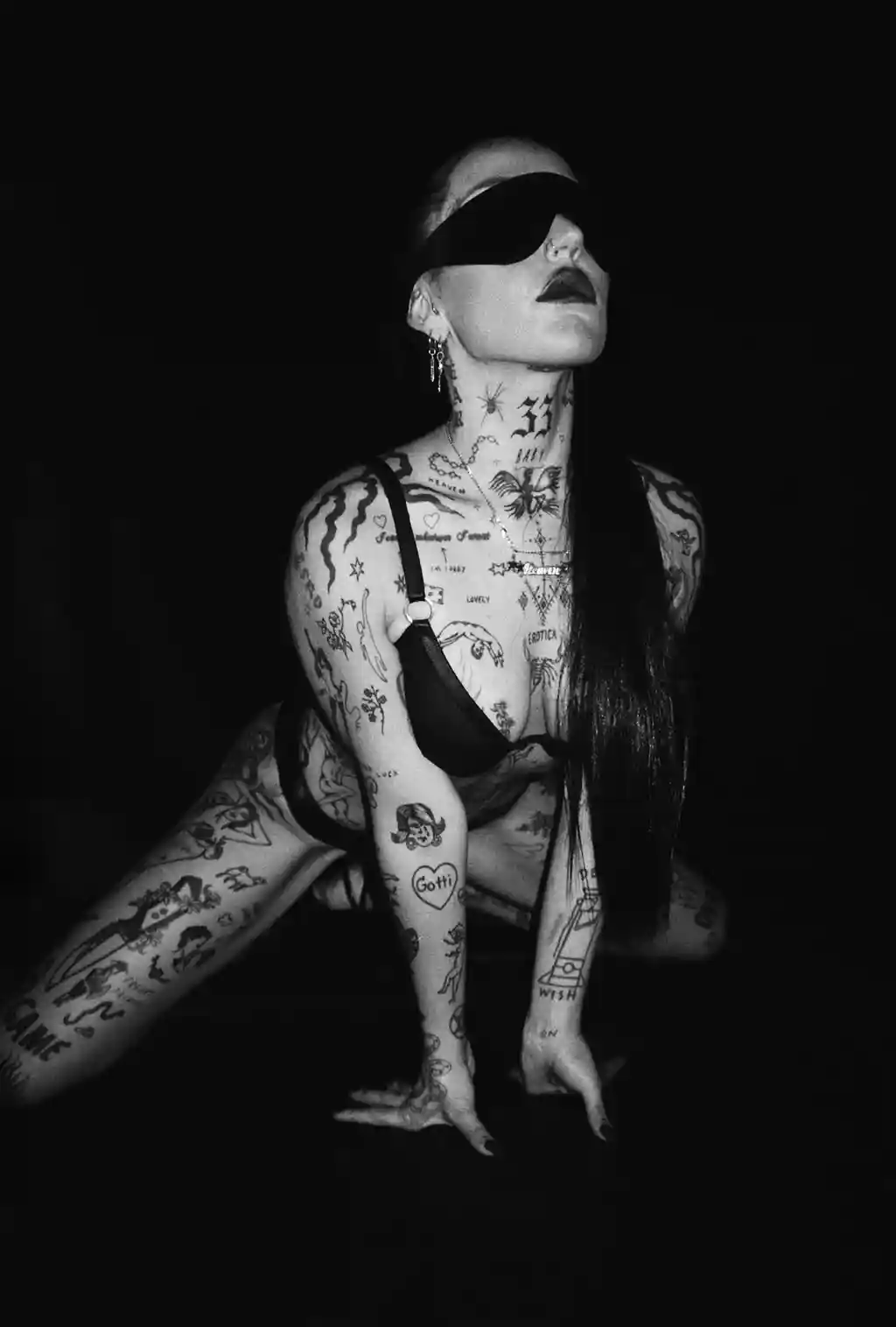 Clothing credits: Spanking Girdle by Sian Hoffman (The Model Traitor Collection); Sheer Ruffle Dress by Roberts Wood; Corset by Sian Hoffman (The Model Traitor Collection); Leather Blindfold by Fleet; IlyaBra and Zip Thong Set by Savannah Lingerie; Leather Ilona Bustier by R&M Leathers; Metal Mask by Ekaterina Videva; Leather Multi Buckle Corset by Fleet Ilya; Mesh Tank Bodysuit by Savannah Lingerie; Leather Diabolik Bodysuit by R&M Leathers; Shoes & Stockings stylist’s own; Jewellery Brooke’s own