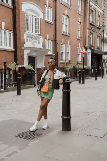 Tapping acrylics on her phone, Laelo Black scrolls for tracks to pepper into our conversation. She drops hits from South Africa as we discuss her personal style, giving a full picture of who and what she stands for as a creative. Clad in a black and white leather jacket, and a lime green mini – complete with candy-floss pink piping – she’s teamed her peppy ensemble with a set of snakeskin-effect Nike NOCTA Hot Step sneakers in pink quartz.