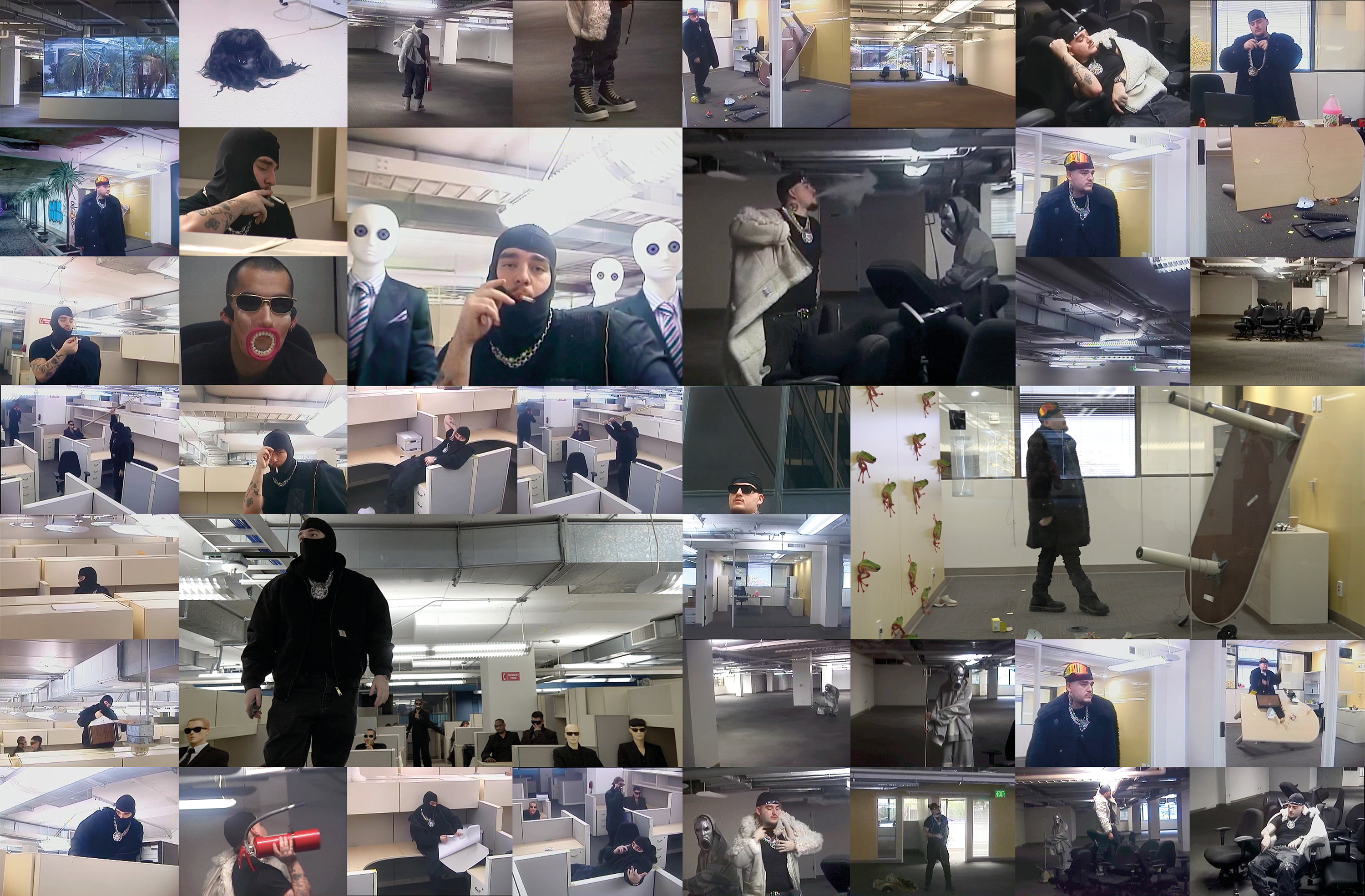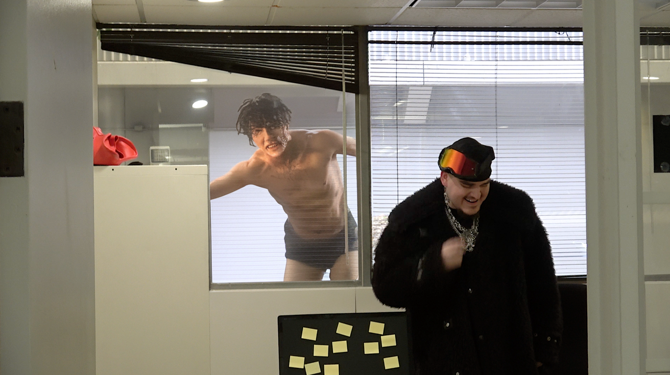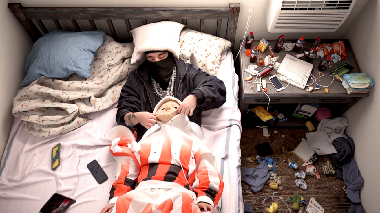 Yeat wears jacket CARHARTT WIP and T‑shirt, balaclava and jewellery talent’s own. Jester wears hoodie and trousers ANONYMOUS CLUB