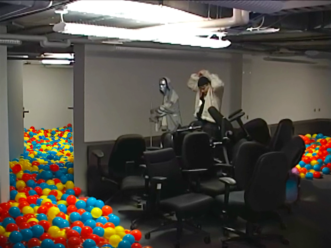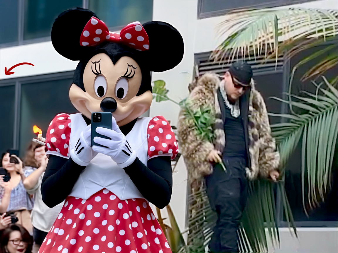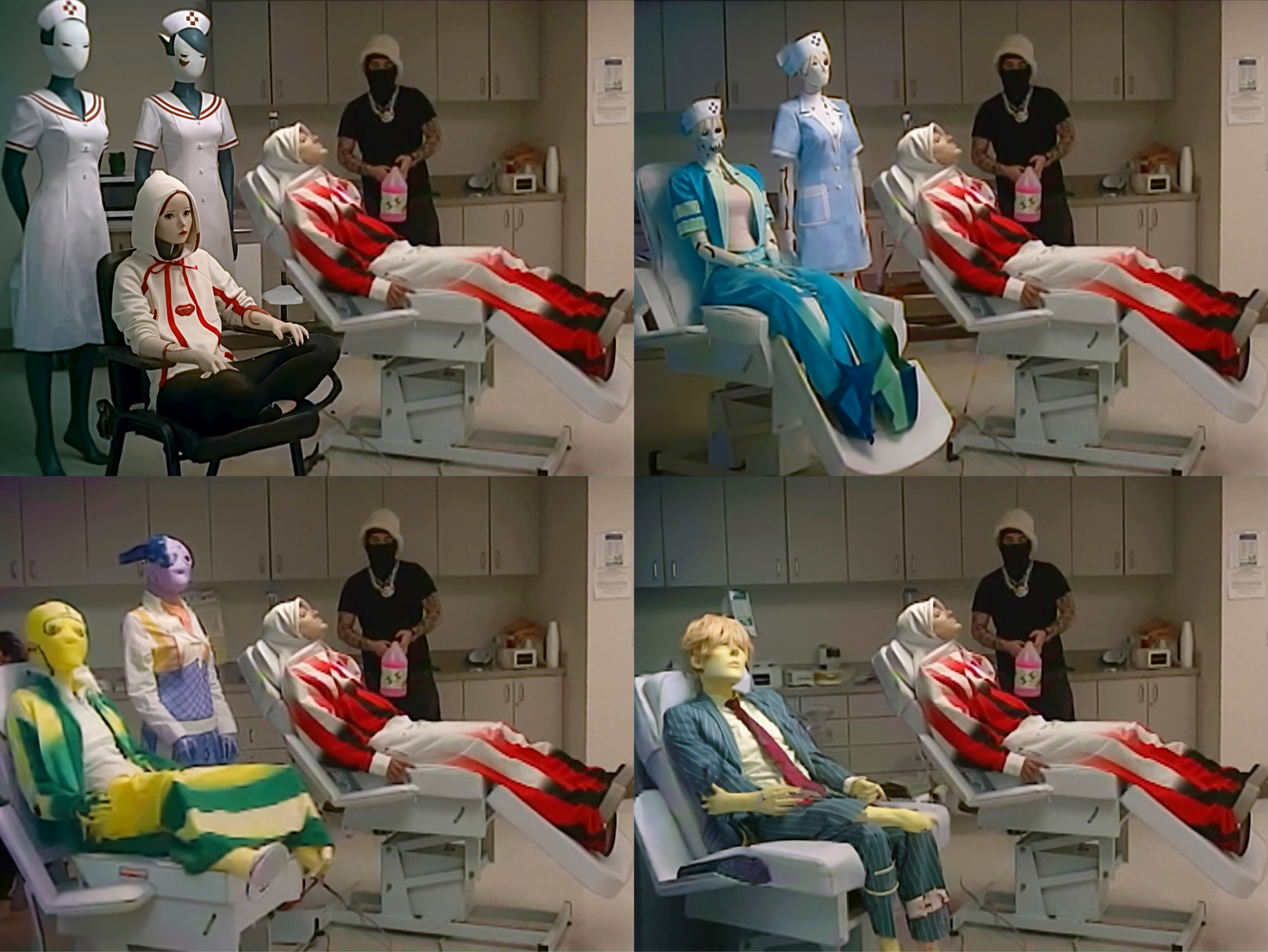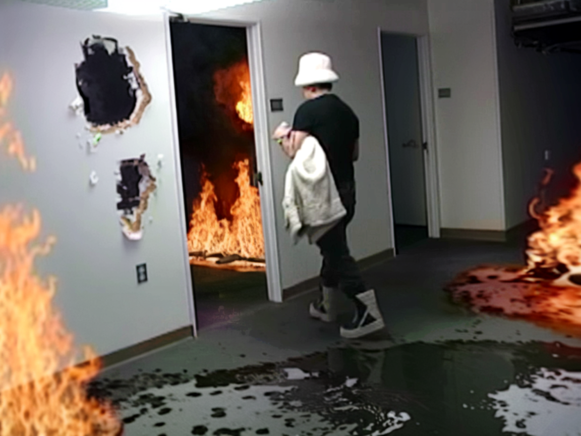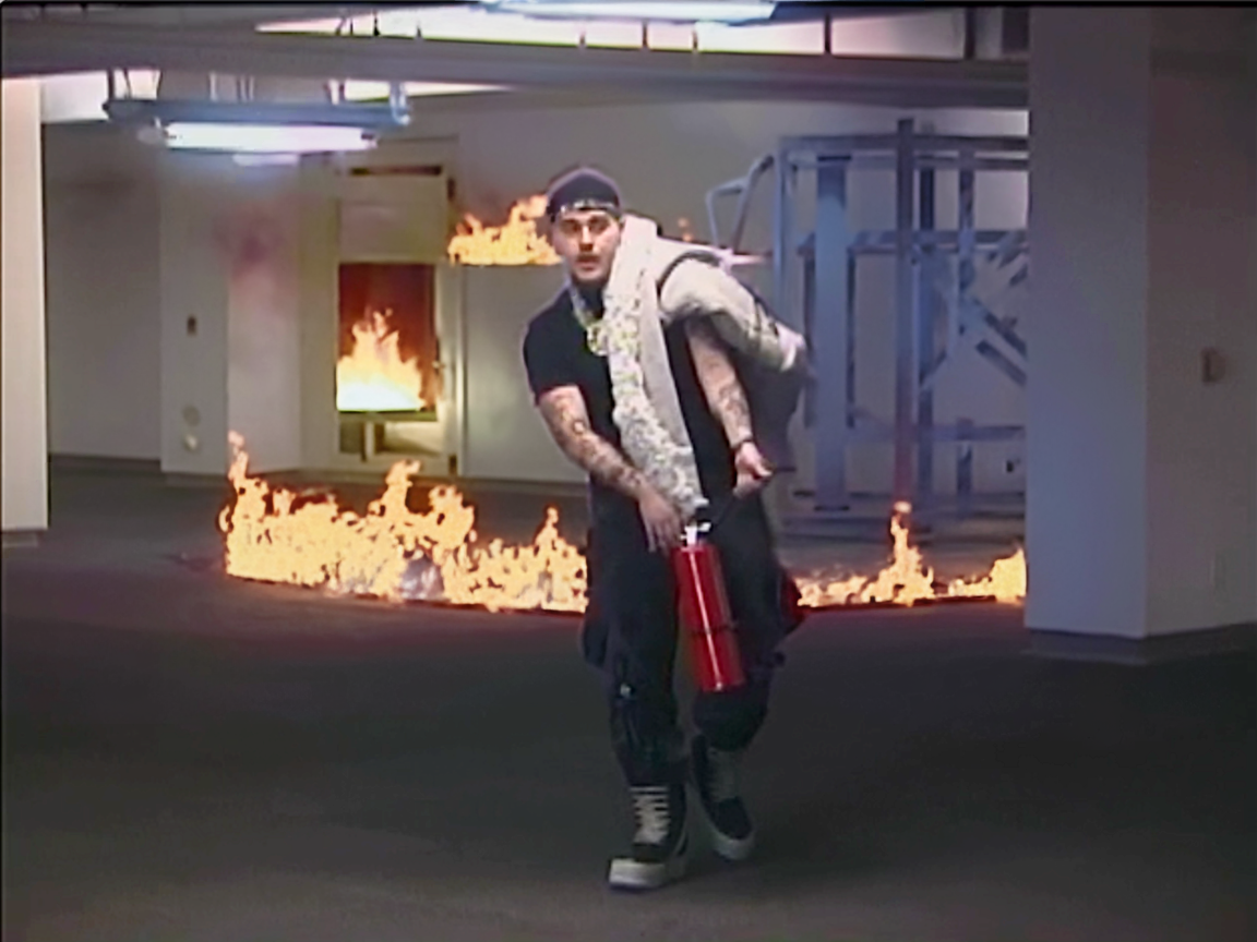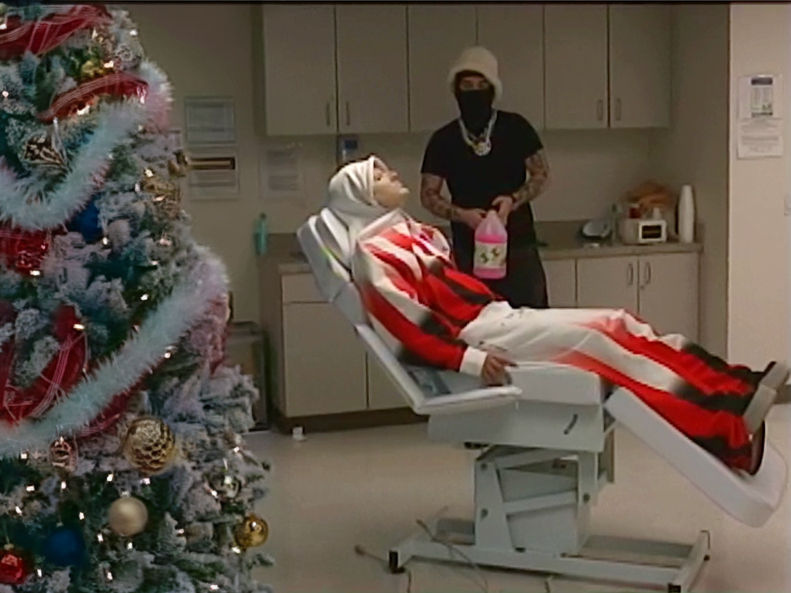 The rest of the pre-show is pure goof-off, like we’re seshing at Yeat’s crib. He giddily plays me an AI-generated clip of him shooting himself in the face with a gun, spewing gory blood everywhere. Swaggering in front of the mirror like De Niro in Taxi Driver, he suits up with a skull-themed Rick Owens balaclava over his face. The Francophones in the room teach him how to say “this is a movie” in French.