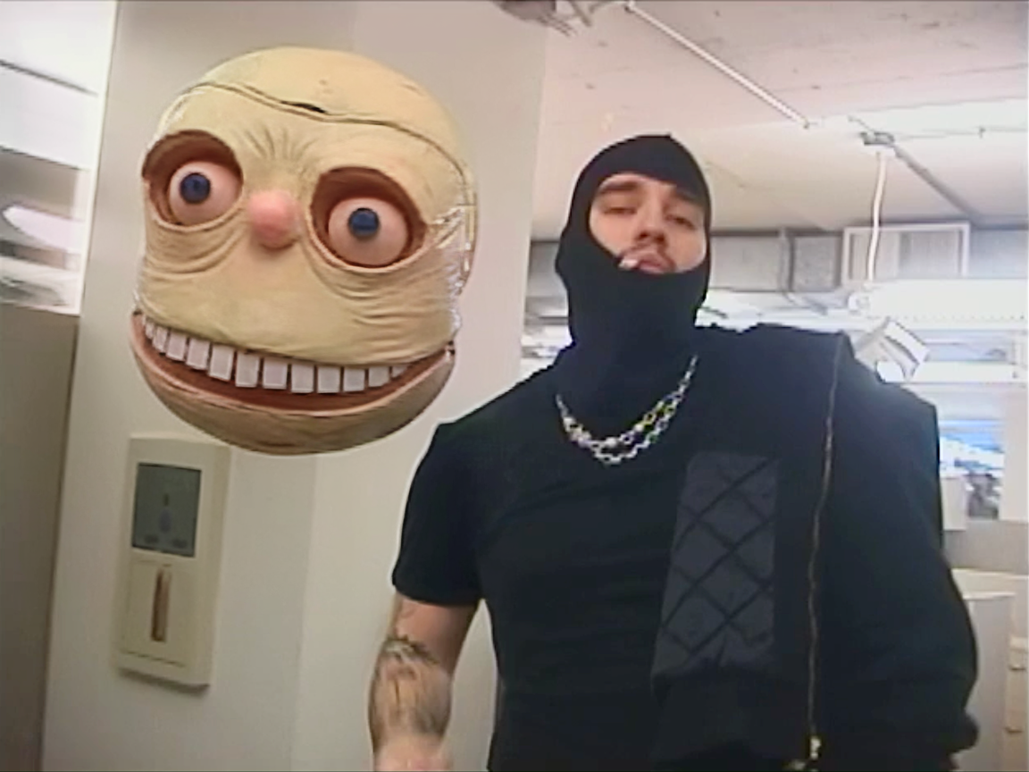 Yeat wears jacket ACNE STUDIOS, T‑shirt, balaclava and jewellery talent’s own and mask stylist’s own