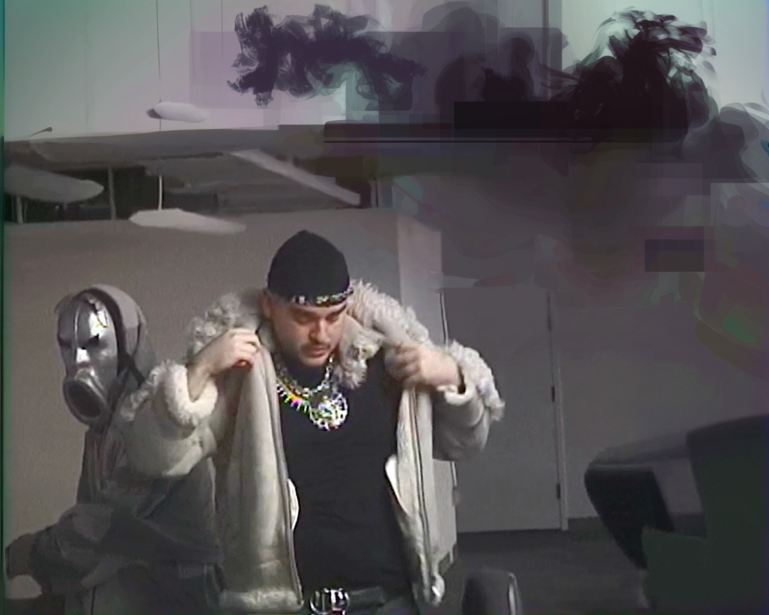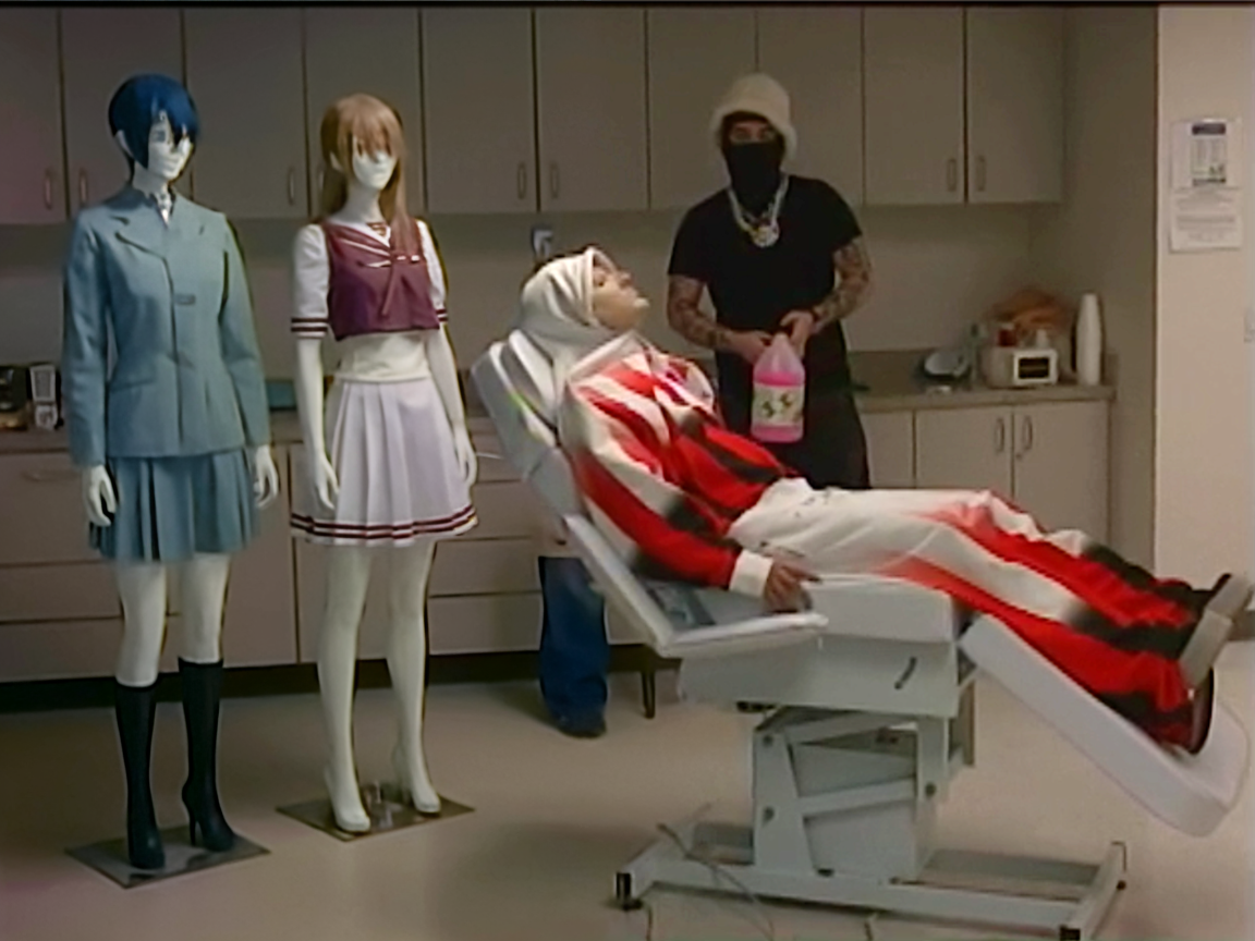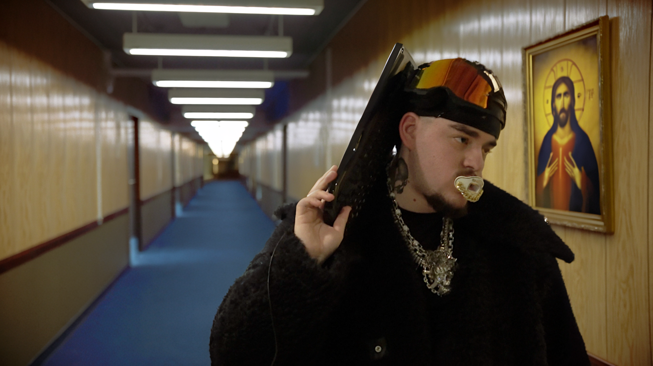 Yeat wears jacket DIESEL and T‑shirt, balaclava and jewellery talent’s own Jester (background) wears hoodie and stole ANONYMOUS CLUB
