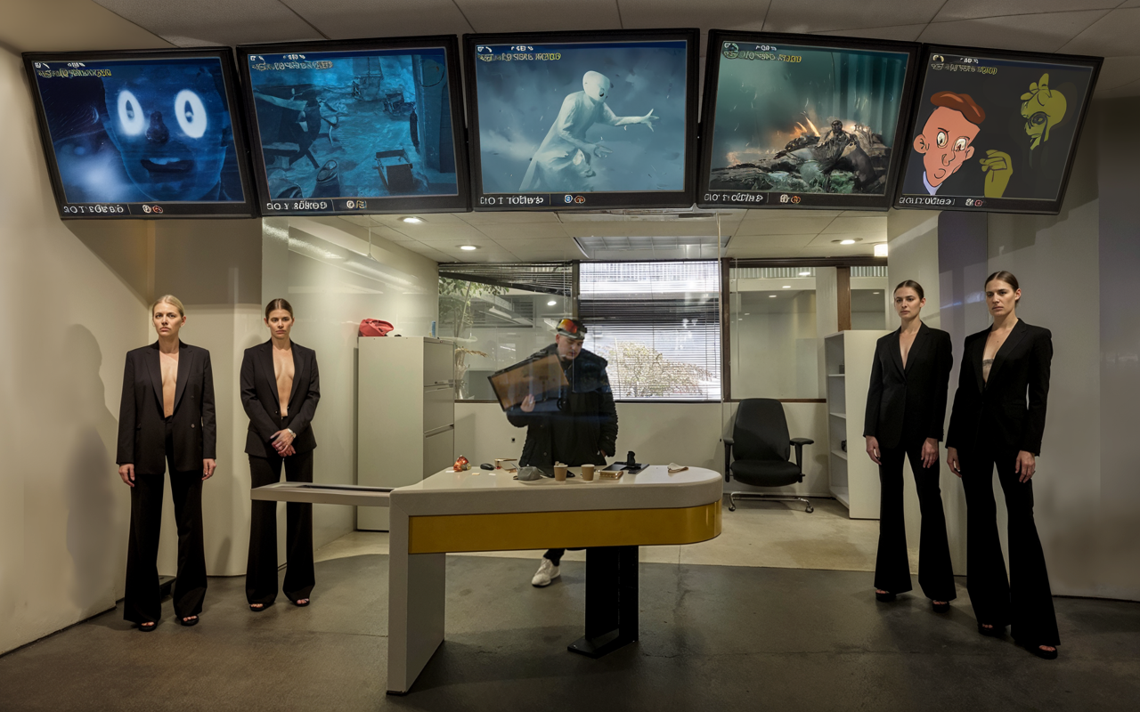 Yeat wears T‑shirt, trousers, hat and jewellery talent’s own Jester (middleground) wears hoodie and trousers ANONYMOUS CLUB and shoes RICK OWENS