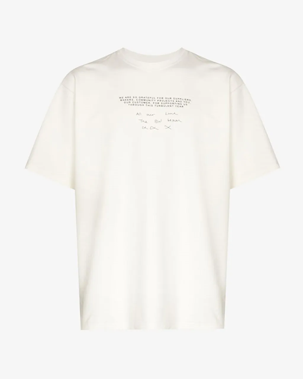 What are you grateful for this year? The return of raves? Getting out of your overdraft? Simply staying alive? Today, our favourite one-stop shop, Browns, has launched a sexy range of exclusive T-shirts designed by Martine Rose, JW Anderson, Robyn Lynch, Bethany Williams and Phipps, tasked with designing a message of gratitude. Featuring a “Keep looking up” mantra, a drawing from Rose’s children and a salute to Lynch’s mum’s super cool Mallorca T-shirt from her first gals holiday aged 18, there’s only one way to wear one of these: with sheer Gra-T-tude.