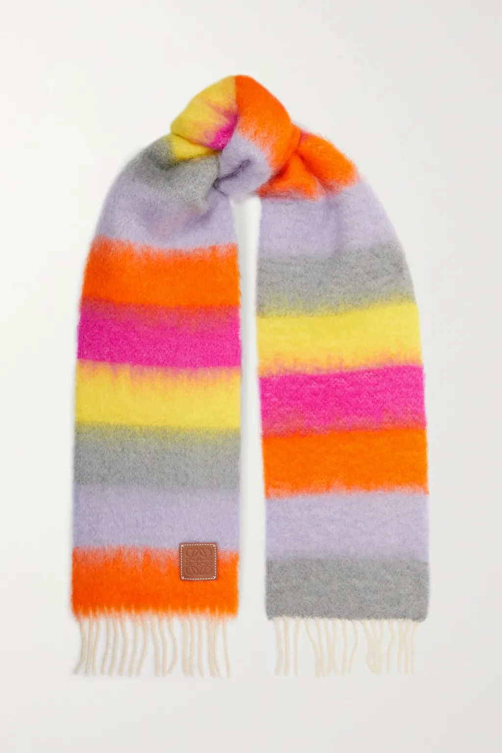 LOEWE Leather-trimmed Fringed Striped Mohair-blend Scarf