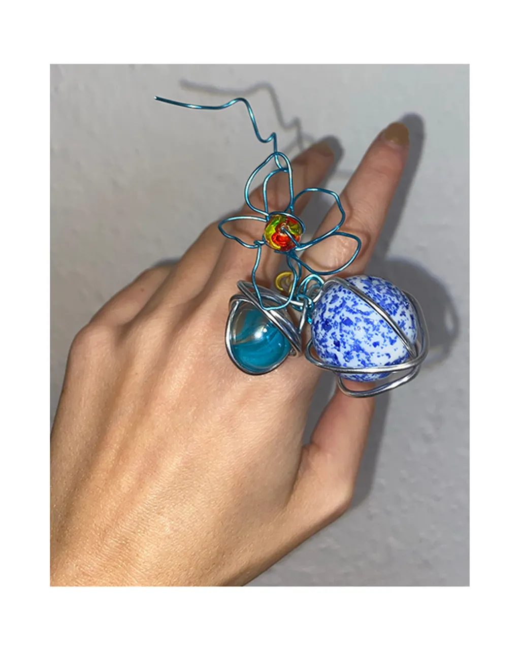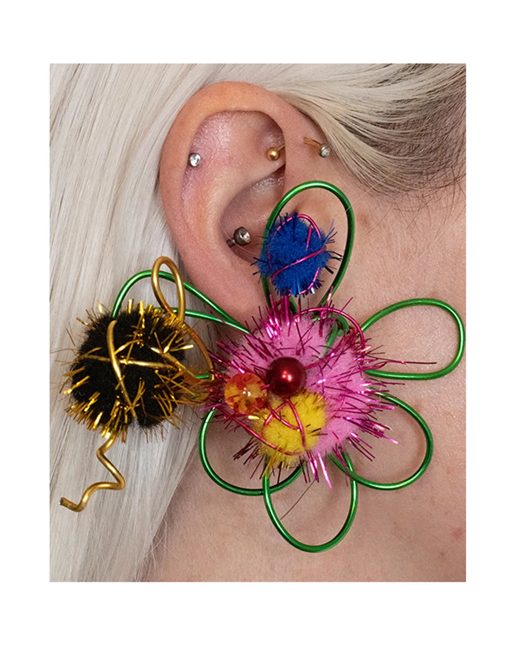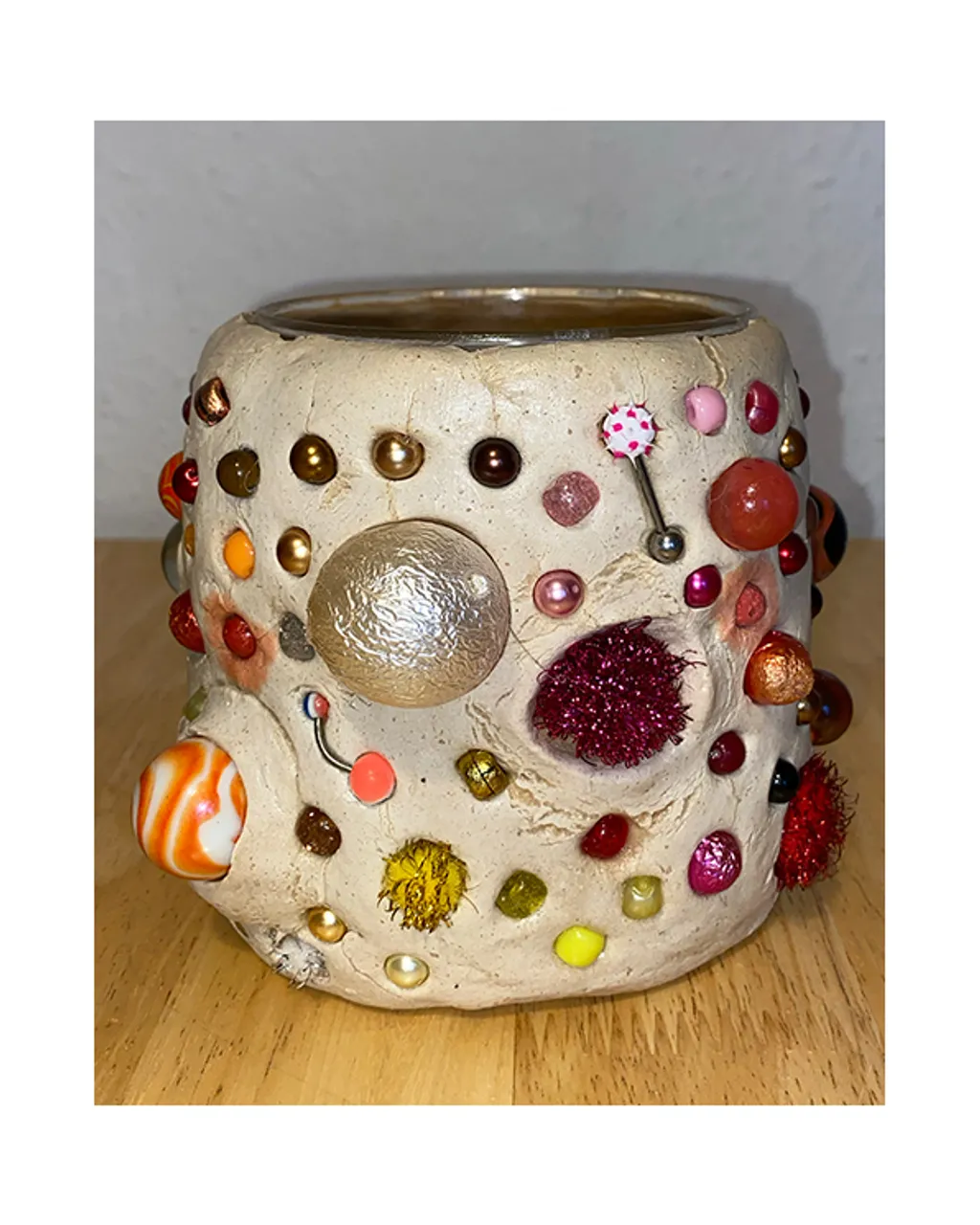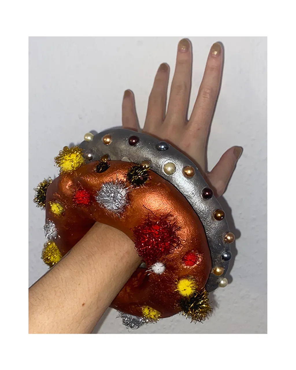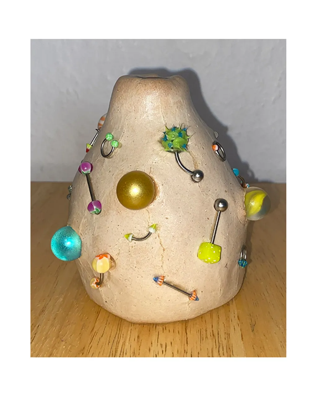 Entitled “I lost my marbles, but found a clown nose”, it includes a healthy mix of funky objects and wearables, all embellished with marbles, pom poms, lava beads and odd bits and pieces Shipton has collected over the years.