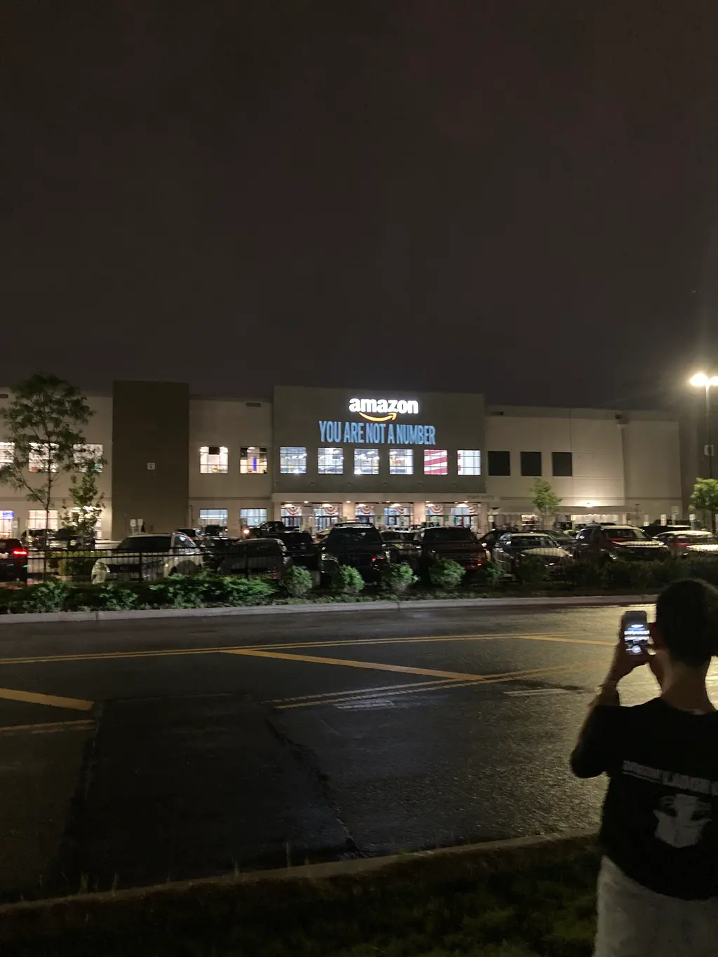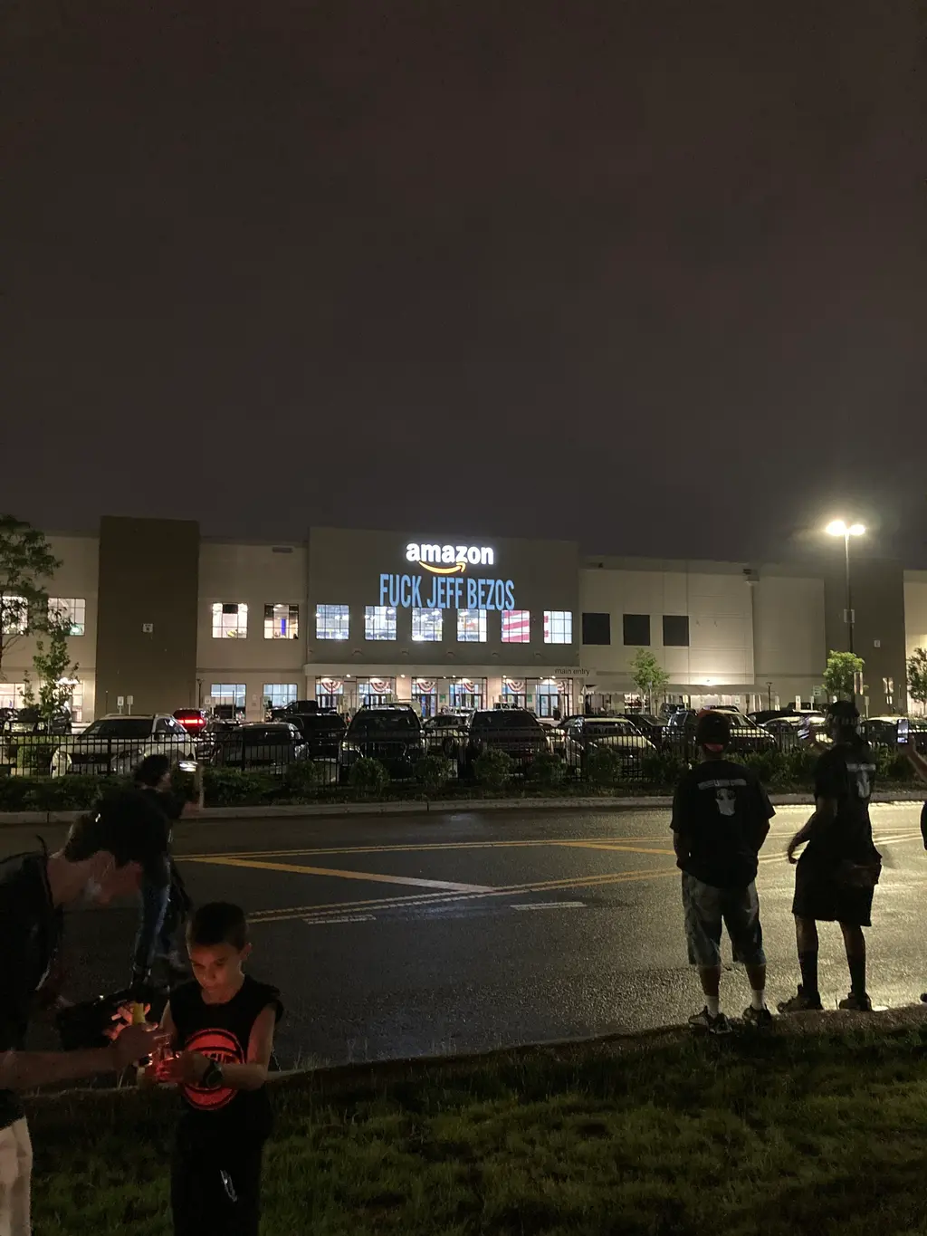 As the evening and a chilly rain both start to fall outside of JFK8, Smalls and the ALU make good on that more confrontational approach. They use a mounted projector to show a myriad of phrases on the front of the warehouse, right below the omnipotent Amazon logo. These range from statements of affirmation, such as “YOU ARE NOT A ROBOT” and “YOU DESERVE A UNION”, to the more blunt “FUCK JEFF BEZOS”. They use the projector to once again honour Poushawn Brown and, eventually, the 20 or so remaining ALU members bust out in chants both specific to their struggle (“Tax Jeff Bezos”) and more universally progressive (“We keep us safe”).