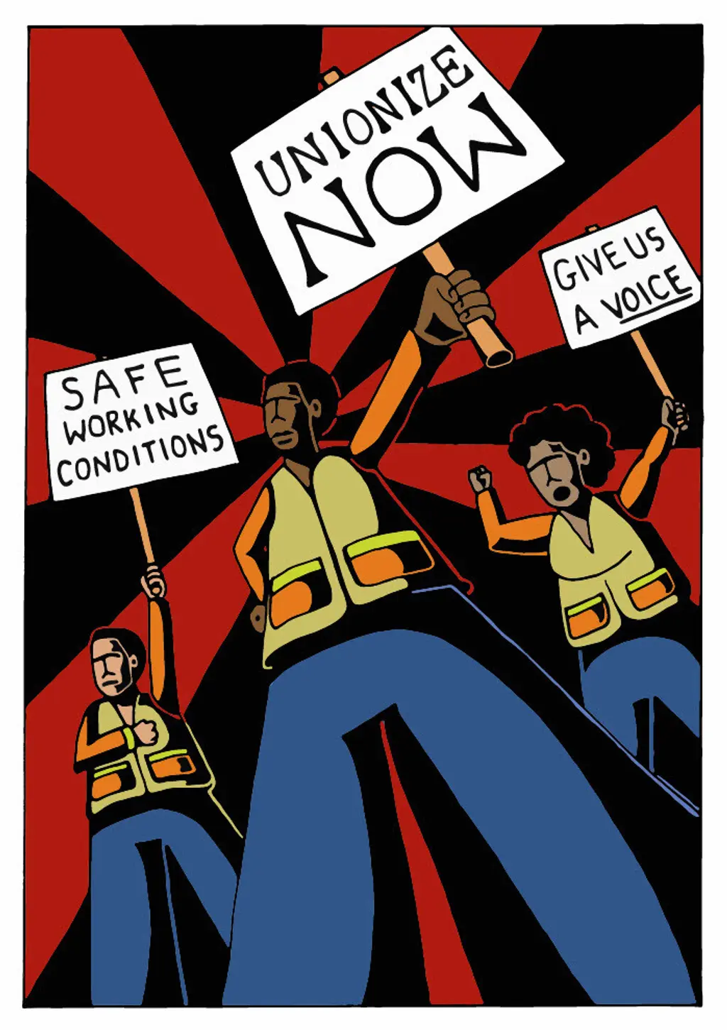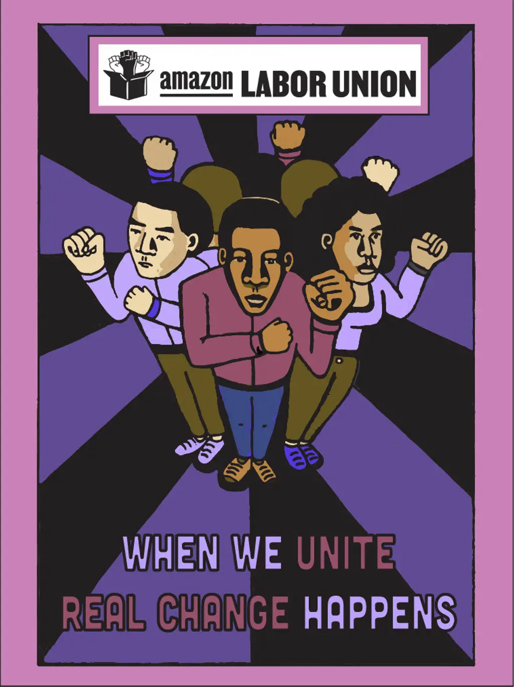 At the June 19 organising drive, several posters are hung on the fencing that were designed by ALU volunteers. They invoke the imagery of the WPA Federal Art Project, part of the United States’ successful New Deal programme, which aimed to help struggling citizens in the wake of the Great Depression and shine a light on the company’s many Black and brown employees.