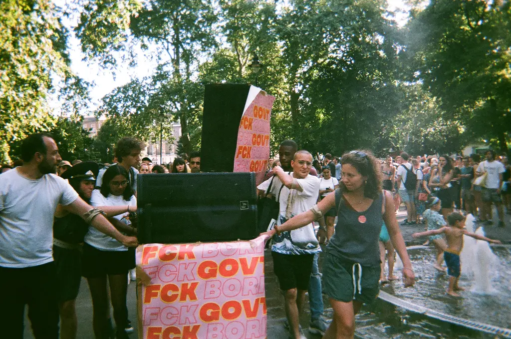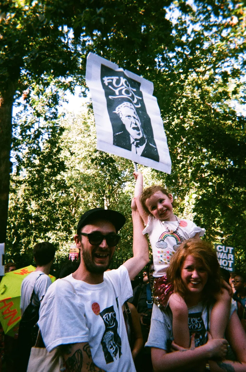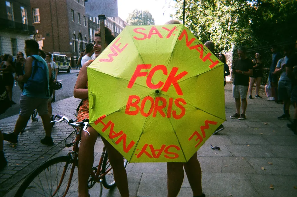 And noise there was. The protest, which began at 5.30pm in Russell Square, saw protestors march through London towards Downing Street chanting “Fuck Boris”, handing out zines, and throwing out free anti-BJ T‑shirts.