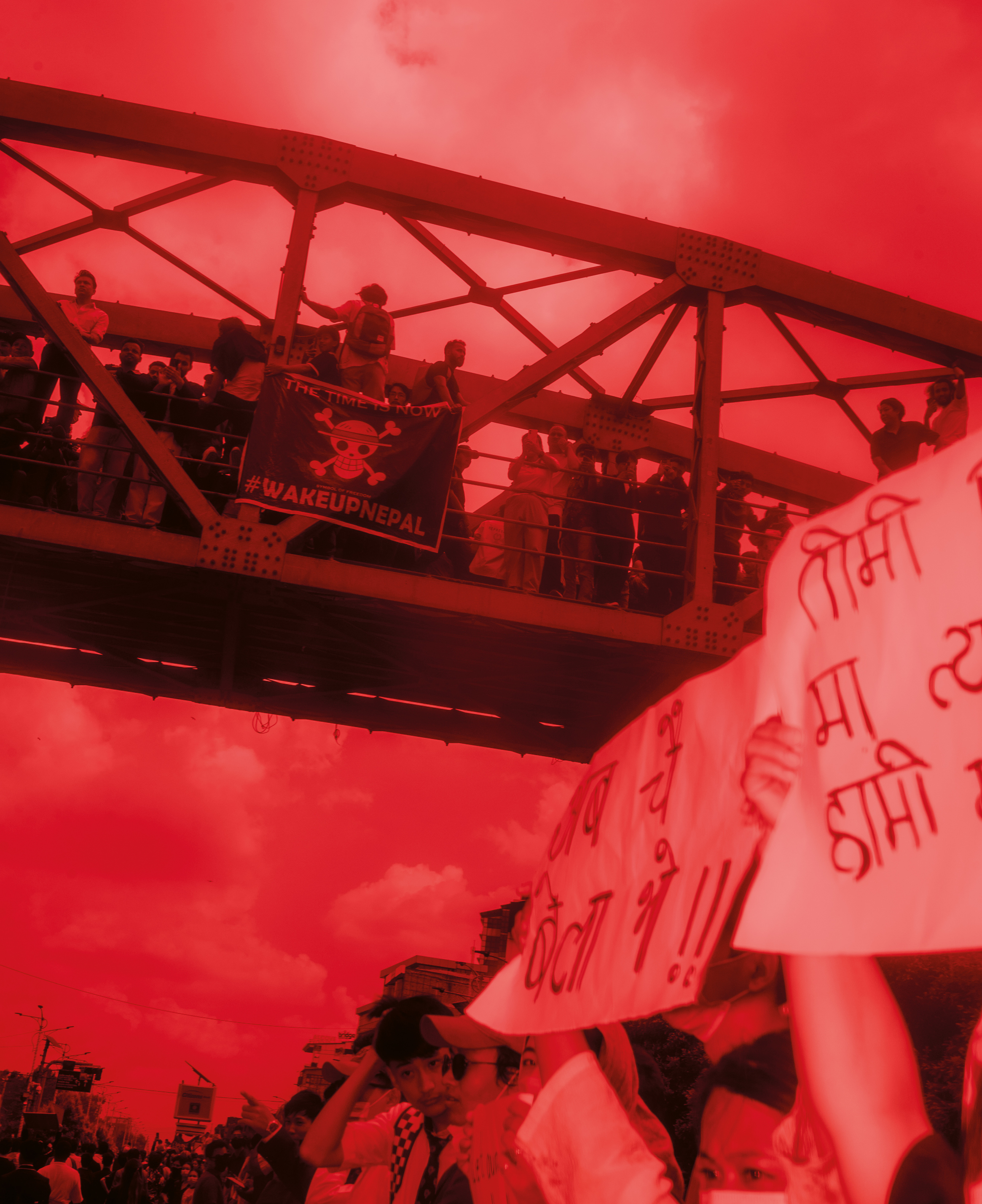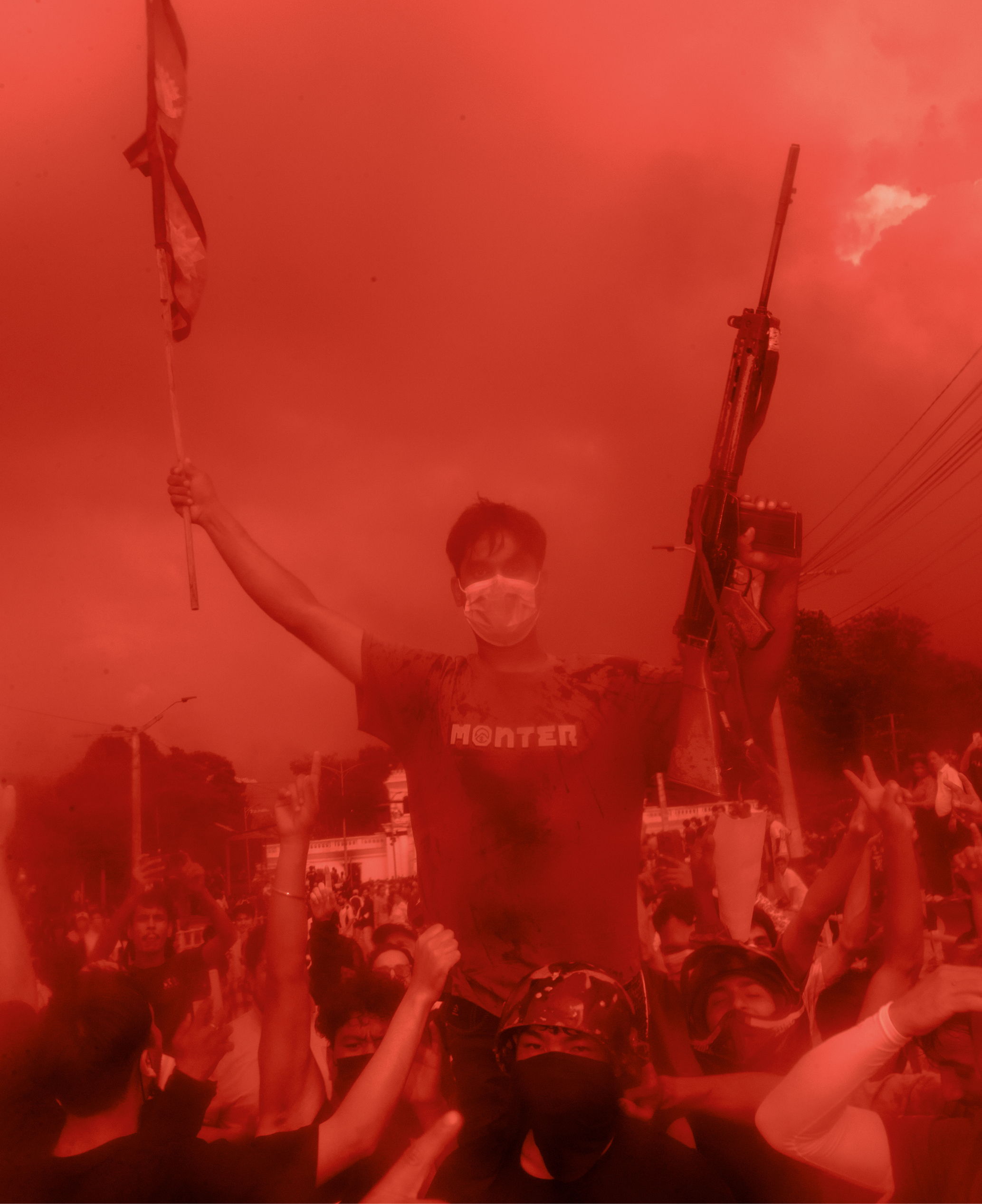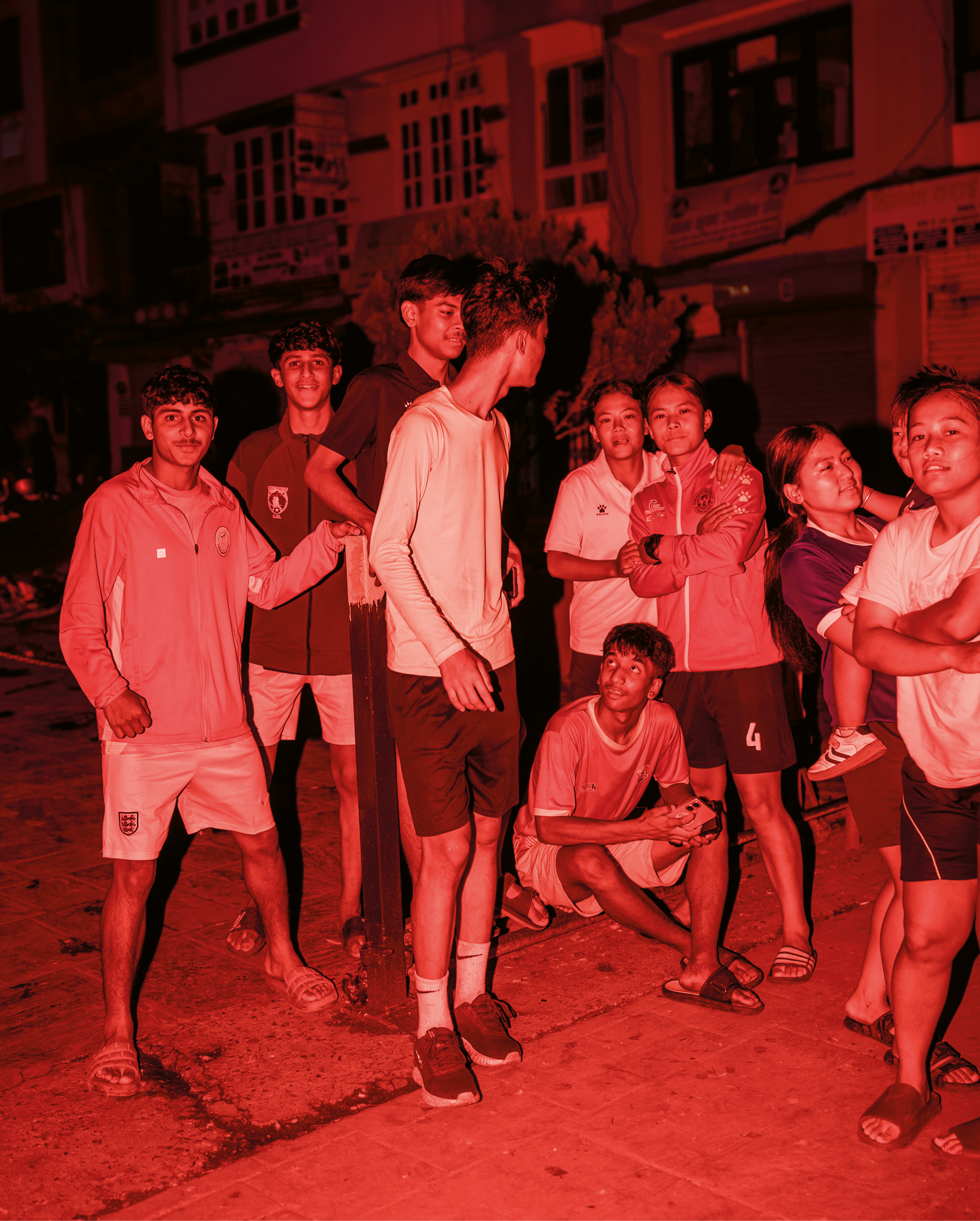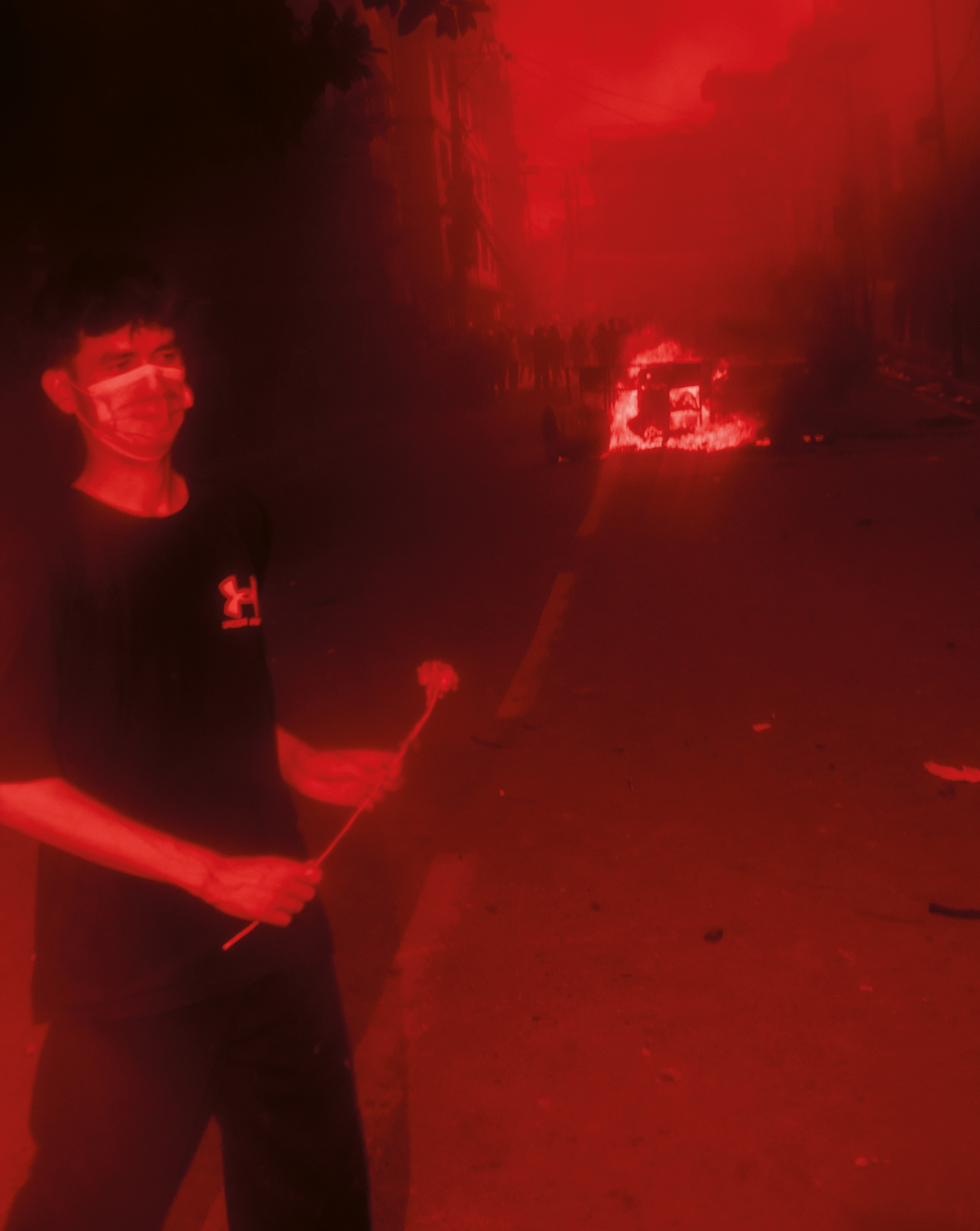 The passion I saw from the Nepali youth that week is partly why I decided to tint my images red. It also symbolically reflects the government’s use of excessive force and the blood on their hands. I was conscious, too, of trying to preserve my subjects’ anonymity.
