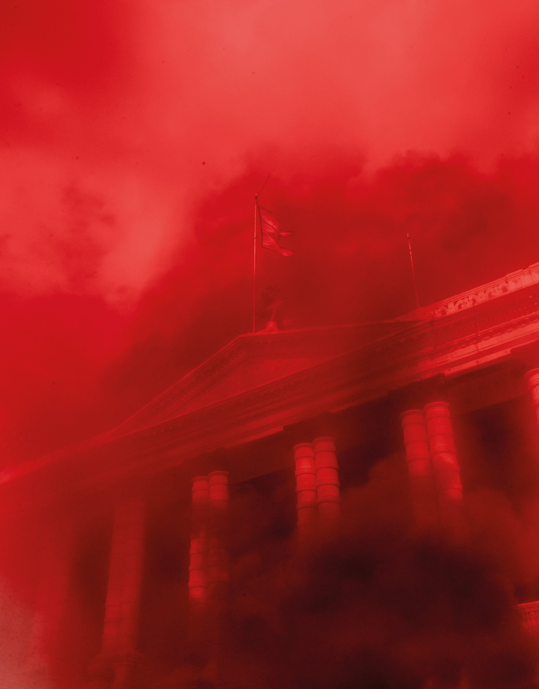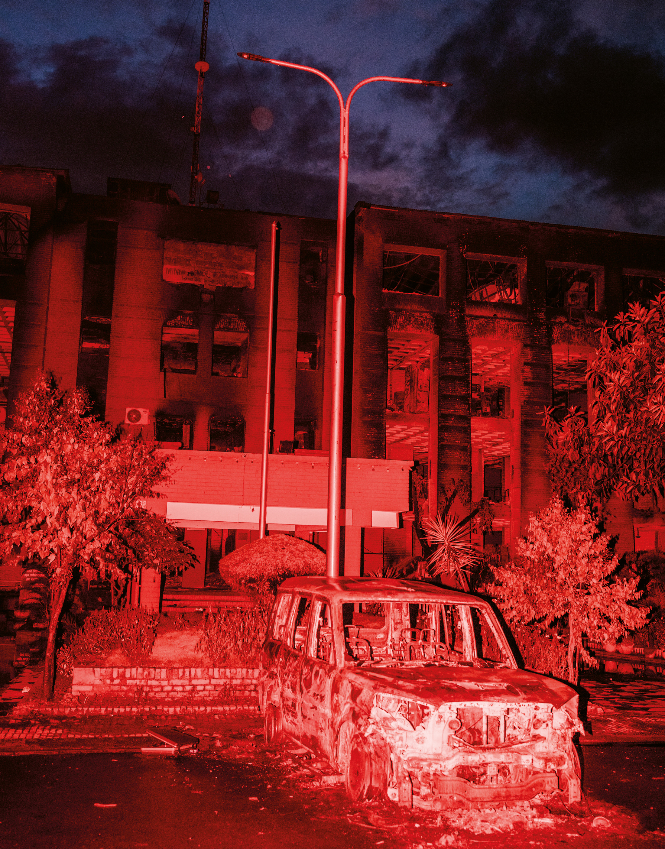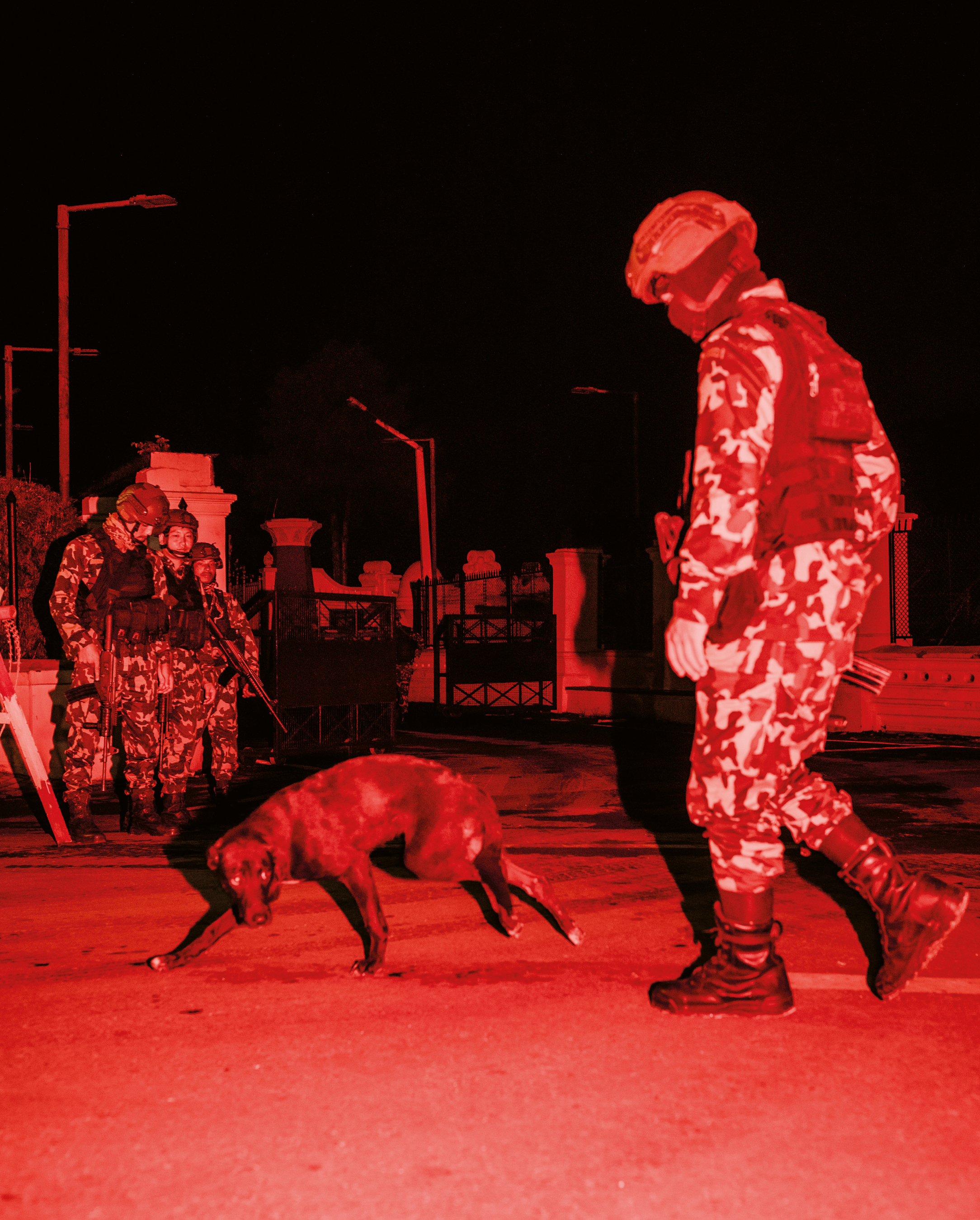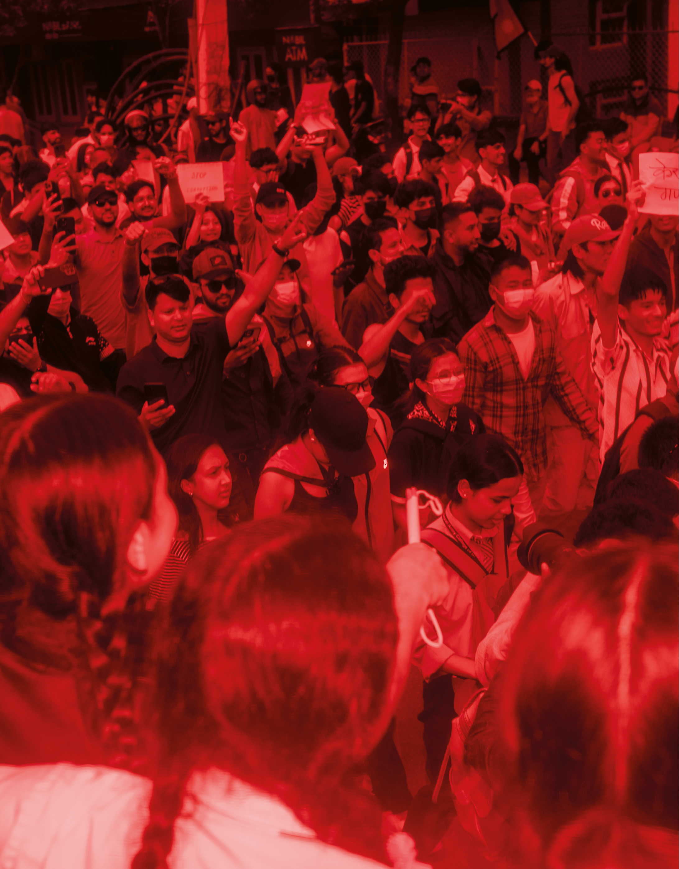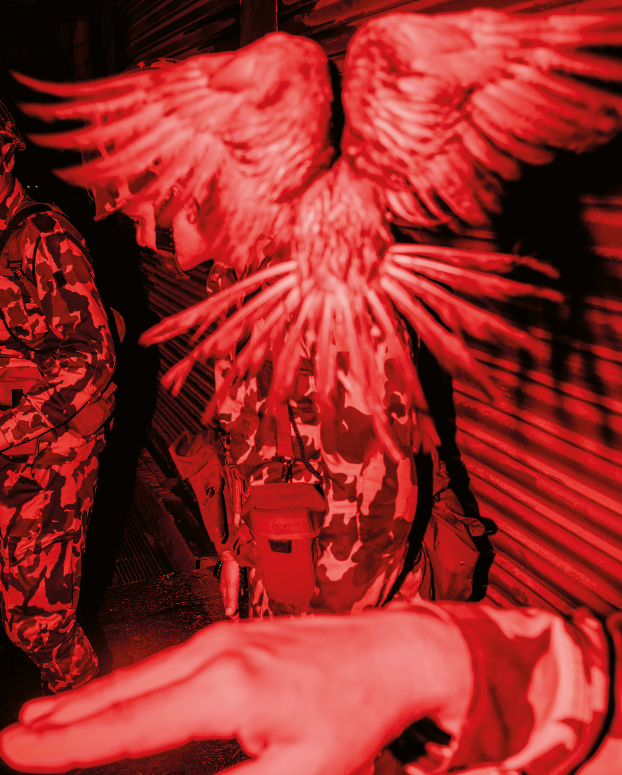 The passion I saw from the Nepali youth that week is partly why I decided to tint my images red. It also symbolically reflects the government’s use of excessive force and the blood on their hands. I was conscious, too, of trying to preserve my subjects’ anonymity.
