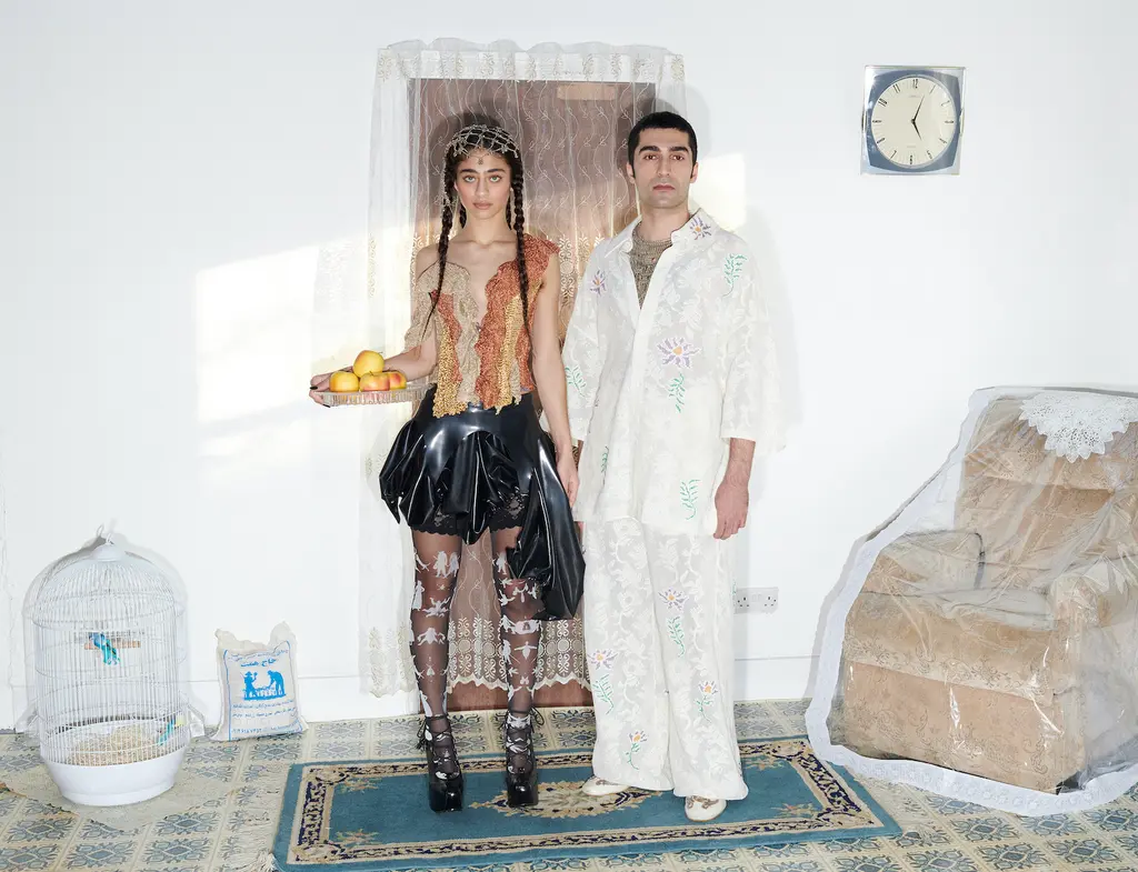 (Left to right) Deba wears top, skirt and tights ANDREAS KRONTHALER FOR VIVIENNE WESTWOOD, shoes VIVIENNE WESTWOOD and headdress CONTEMPORARY WARDROBE. Kasra wears top and trousers LOUIS VUITTON, shoes THE NATIONAL THEATRE and necklace PEBBLE LONDON