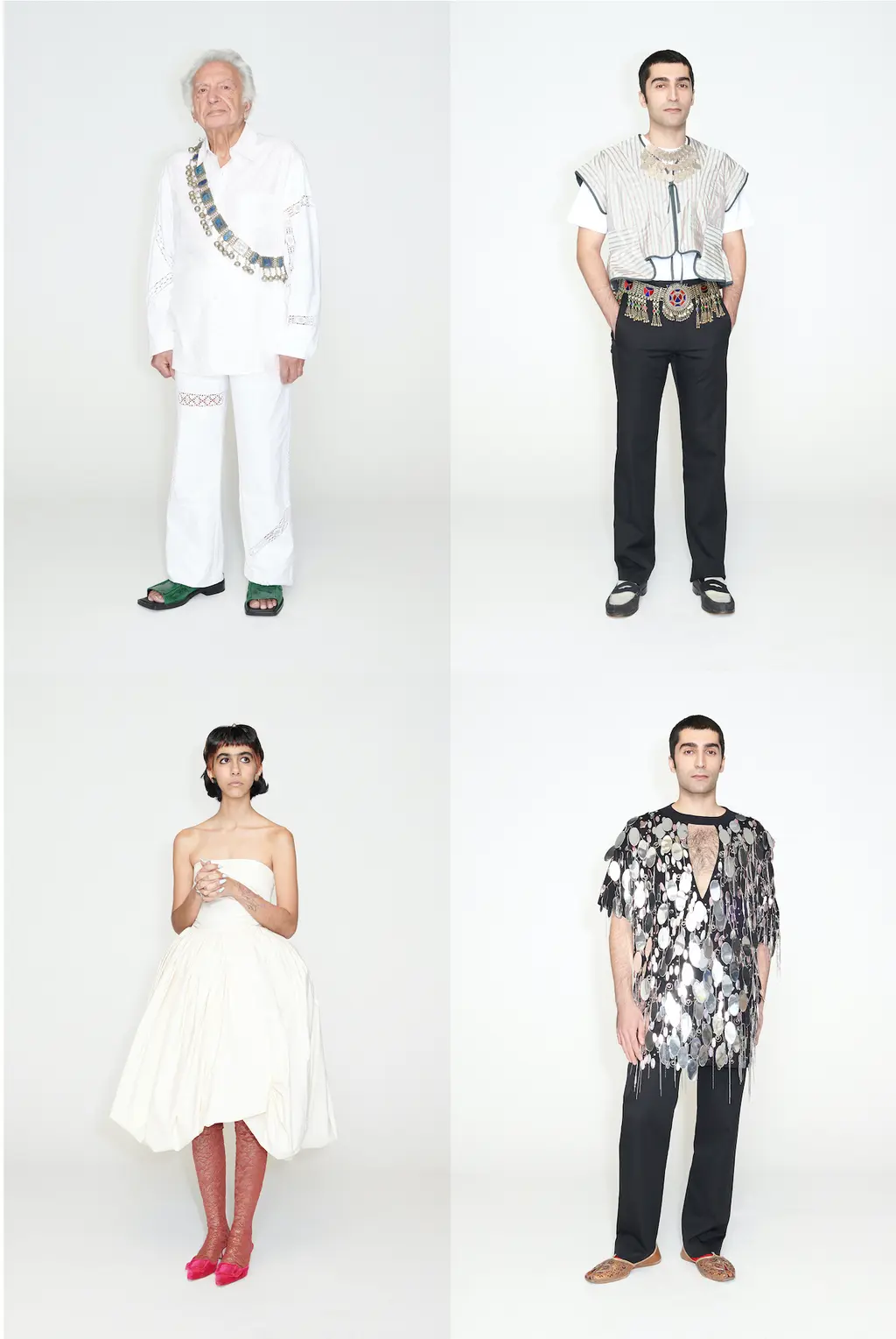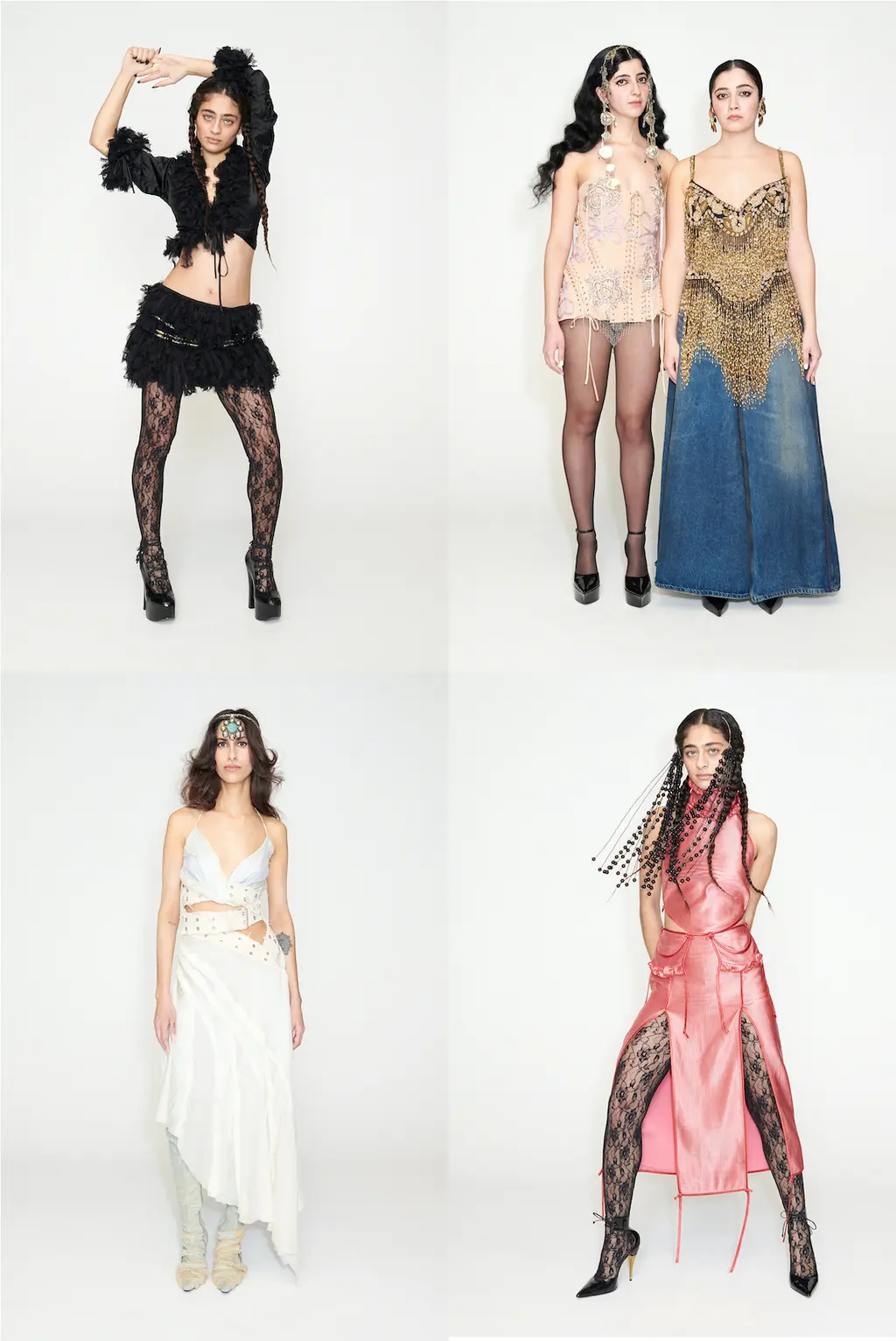 (Top to bottom) Deba wears top, skirt, shoes and headdress GUCCI and tights JONATHAN ASTON. Joanne wears top, skirt, belt and shoes DIESEL and headdress ARCHIVE AT RELLIK. Kasra wears dress THE ATTICO, trousers MARTINE ROSE and shoes THE NATIONAL THEATRE. Tasalla wears dress MOLLY GODDARD, tutu (worn underneath) ARCHIVE AT RELLIK, tights LOUIS VUITTON and shoes MANOLO BLAHNIK. Hannah wears top and mini skirt ARCHIVE AT THE ARC, skirt (worn underneath) Y/PROJECT, earrings AREA and shoes GIVENCHY. Roxanna wears corset MATTY BOVAN, underwear ARCHIVE AT THE ARC, earrings SUSAN CAPLAN, tights FALKE and shoes BLUMARINE. Deba wears shirt, skirt and shoes VERSACE, tights JONATHAN ASTON and belt ARCHIVE AT RELLIK. Kasra wears waistcoat ANDREAS KRONTHALER FOR VIVIENNE WESTWOOD, t‑shirt CARHARTT WIP, trousers MARTINE ROSE, necklace PEBBLE LONDON and shoes and belt CONTEMPORARY WARDROBE, Victors wears shirt and trousers MARINE SERRE, shoes MARTINE ROSE and chain CONTEMPORARY WARDROBE