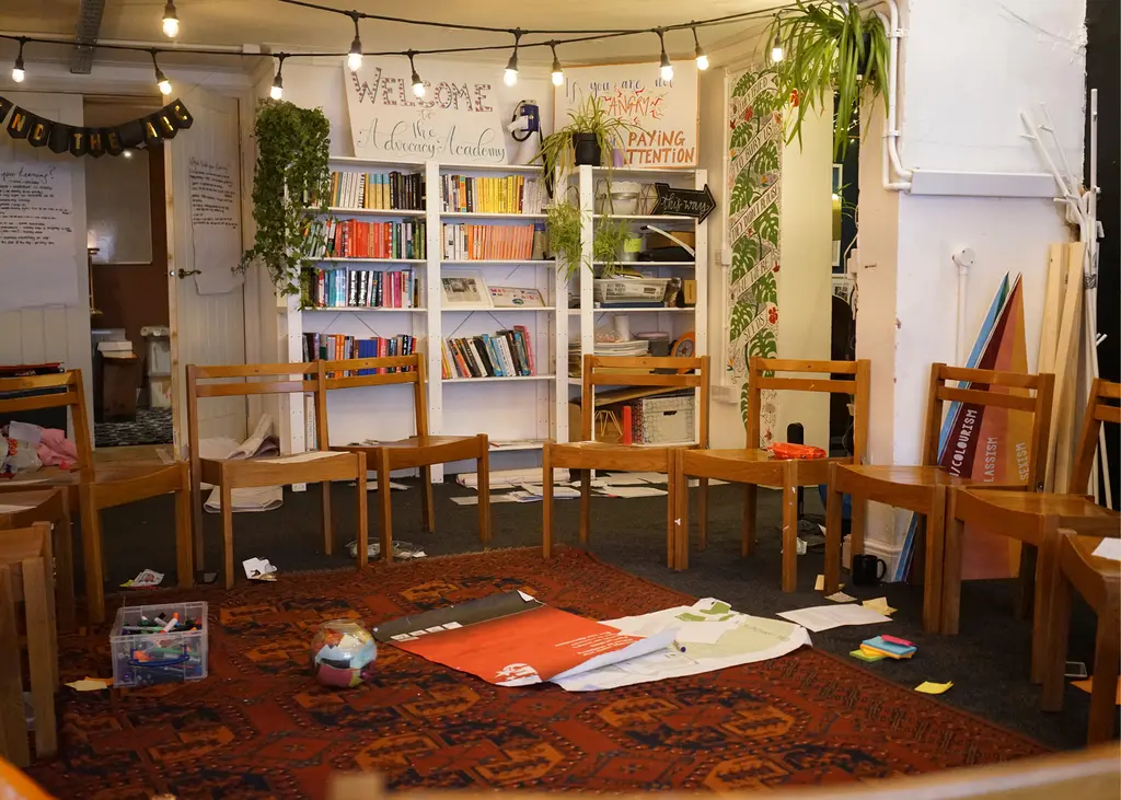 I arrive at the academy on a hot day in July, where alumni from its recent graduating class are gathered to train as “changemakers” – mentors for the academy’s next intake. The space feels like a nursery for political disruptors. There are cubby holes for shoes, pegged-up Polaroids of its young activists strung along the walls, bookshelves with Civil Rights tomes and Zadie Smith novels, brightly coloured notice boards plastered with activist slogans, and a houseplant called Greta.