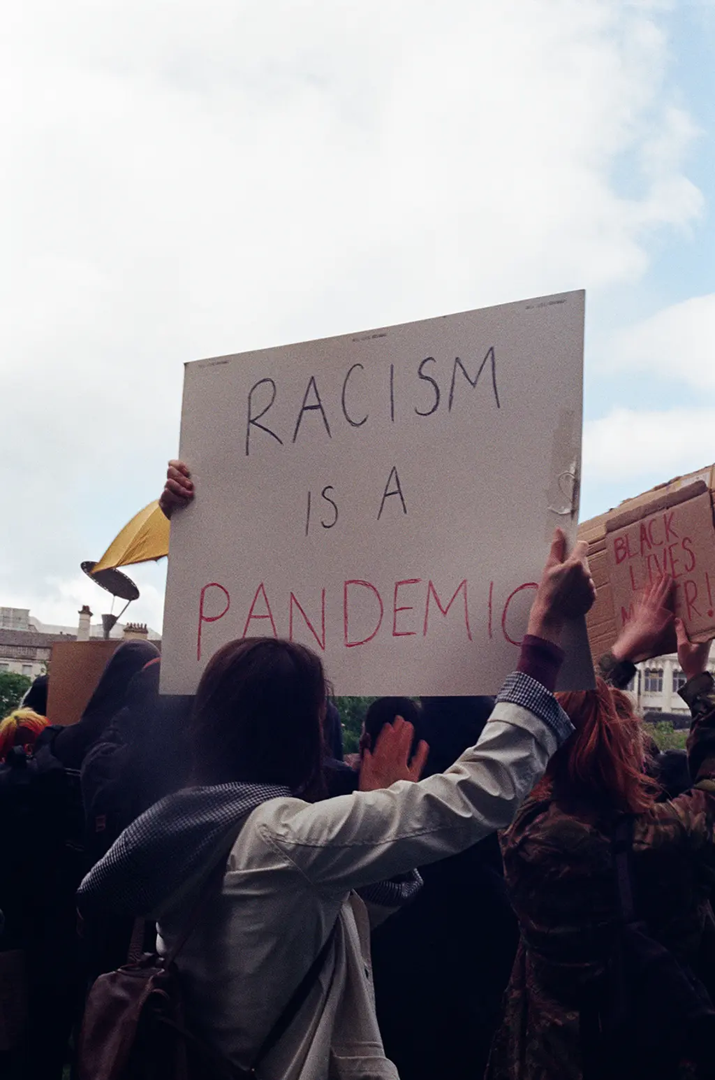 It goes without saying that these mass gatherings come, to many, as alarming during a global pandemic but that is exactly the point – to alarm people. Another placard read, “Second wave of epidemic? How about [the] four hundredth wave of racism?”.