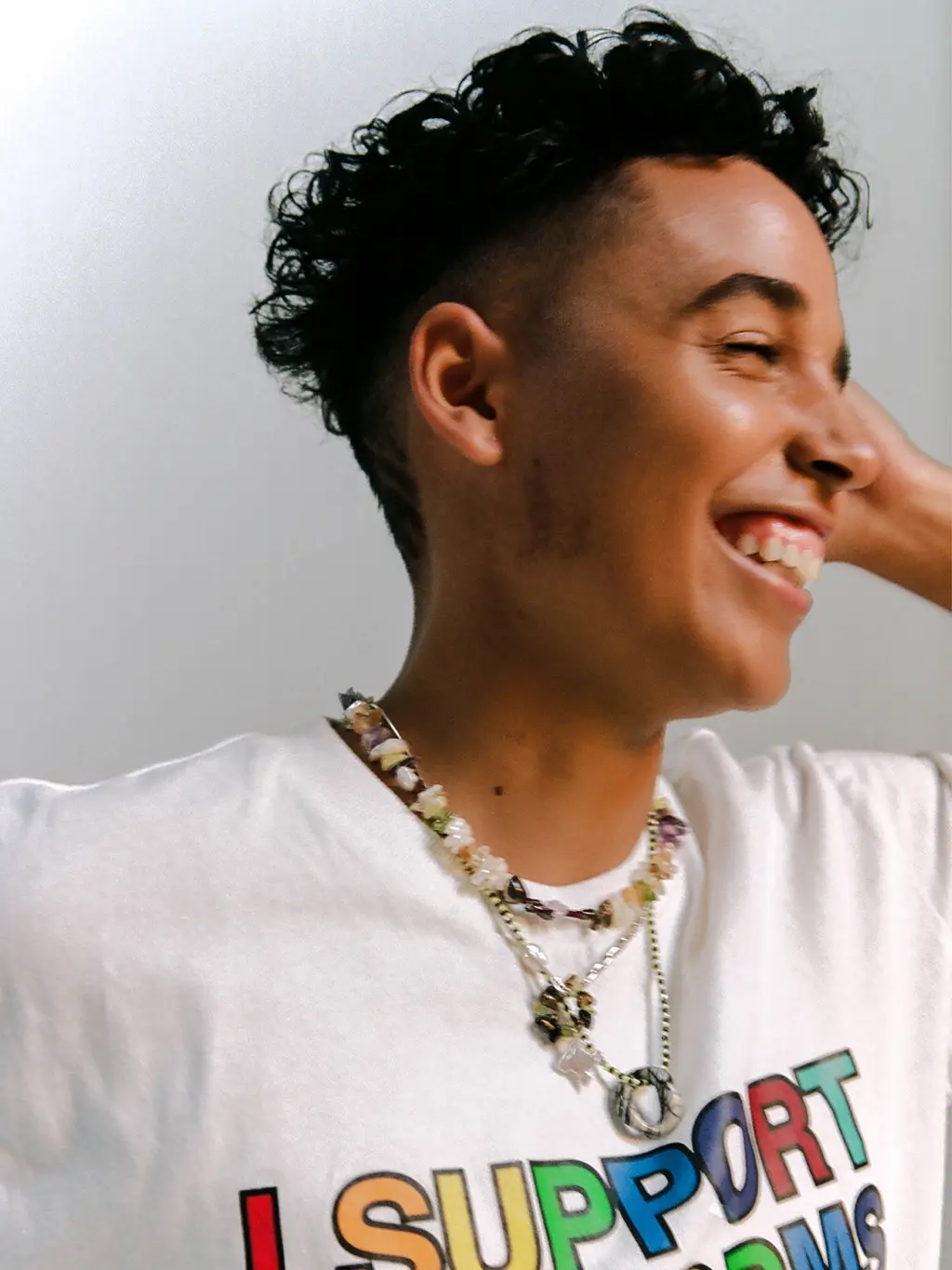“For queer people, fashion has always been used as a [powerful] tool,” says McNally. “It’s like a safety and a way that we really get to show our gender expression. It’s not just clothing.” The bold logo rainbow belt and crisp white slogan tees emblazoned with the words “I Support All Forms of Love” encourage others to be more open-minded.