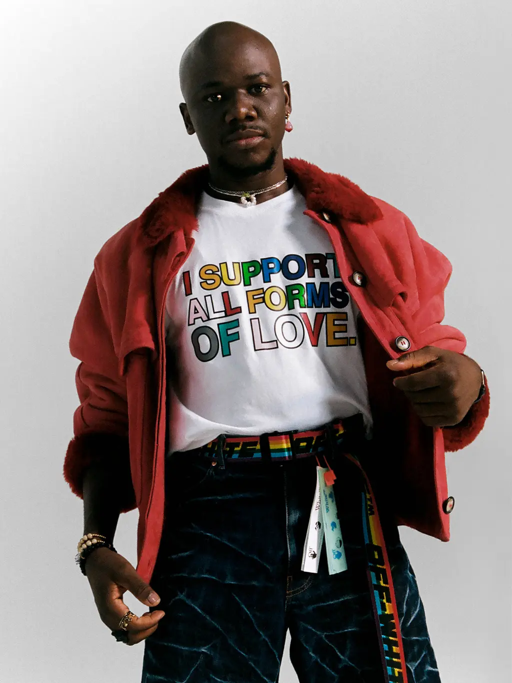 Still in 2021, some are still fighting to survive and thrive. The “I Support All Forms of Love” Pride capsule collection is a demonstration of commitment, from Off-White™ c/o Virgil Abloh and myself, to creating societal change through fashion, arts and culture. In honour of LGBTQIA+ History Month, the Pride capsule will feature special edition merchandise to raise awareness about LGBTQIA+ history, uplift diverse Black LGBTQIA+-identified activists contributing to social change and raise funds to support the Black LGBTQIA+ Migrant Project. We are committed to seeing a world where a statement like “I Support All Forms of Love” is a transformative, and dominant frame of thinking, one where LGBTQIA+ people of all races and genders across the globe are centred, supported and affirmed.”