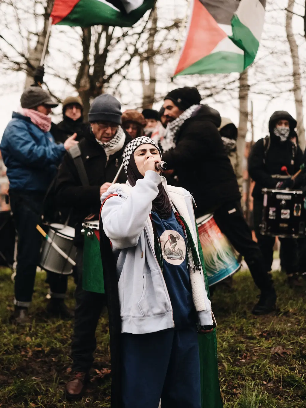 I speak to Audrey Corno, the co-founder of Prisoners4Palestine (an essential resource for those following the case) who previously served two months on remand for her alleged part in occupying the rooftop of GRiD Defence Systems, a military hardware manufacturer accused by Palestine Action of supplying for Elbit Systems. “We consider the trial the second part of the action,” she shouts over solidarity chants and drum beats, referring to the general role that a court case can play in a direct action (in this case, the break-in at Elbit). “An opportunity to hold whatever or whoever you’re challenging accountable in court.”