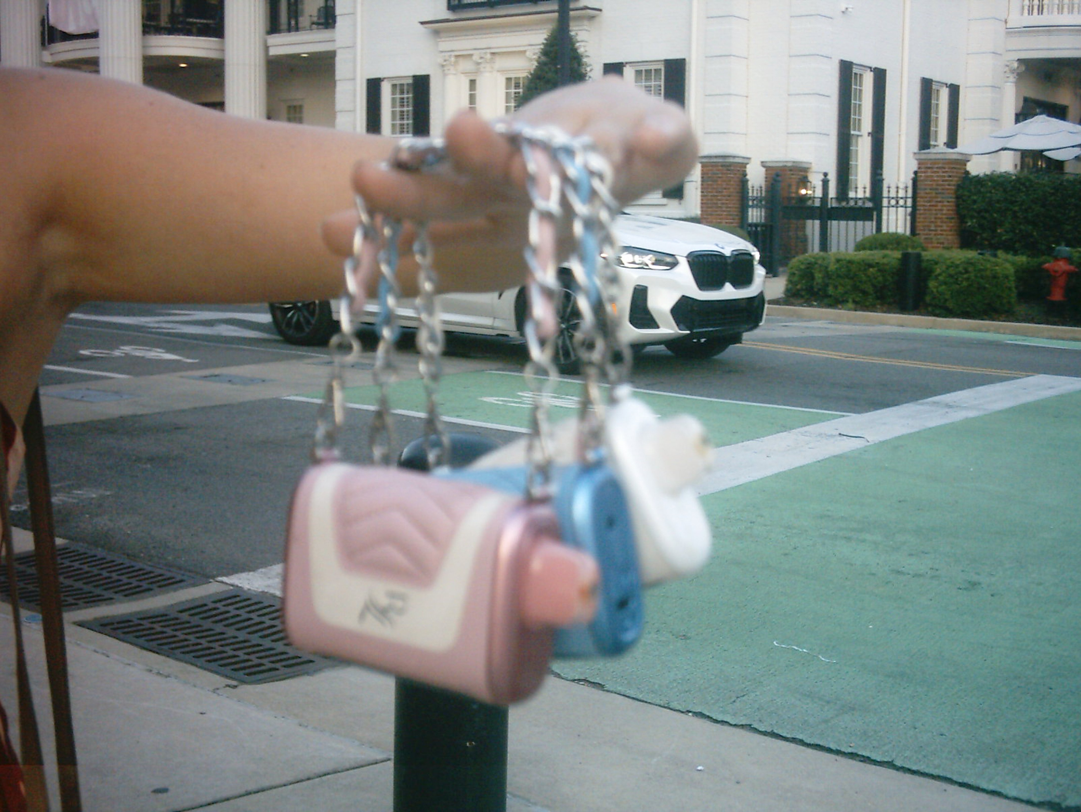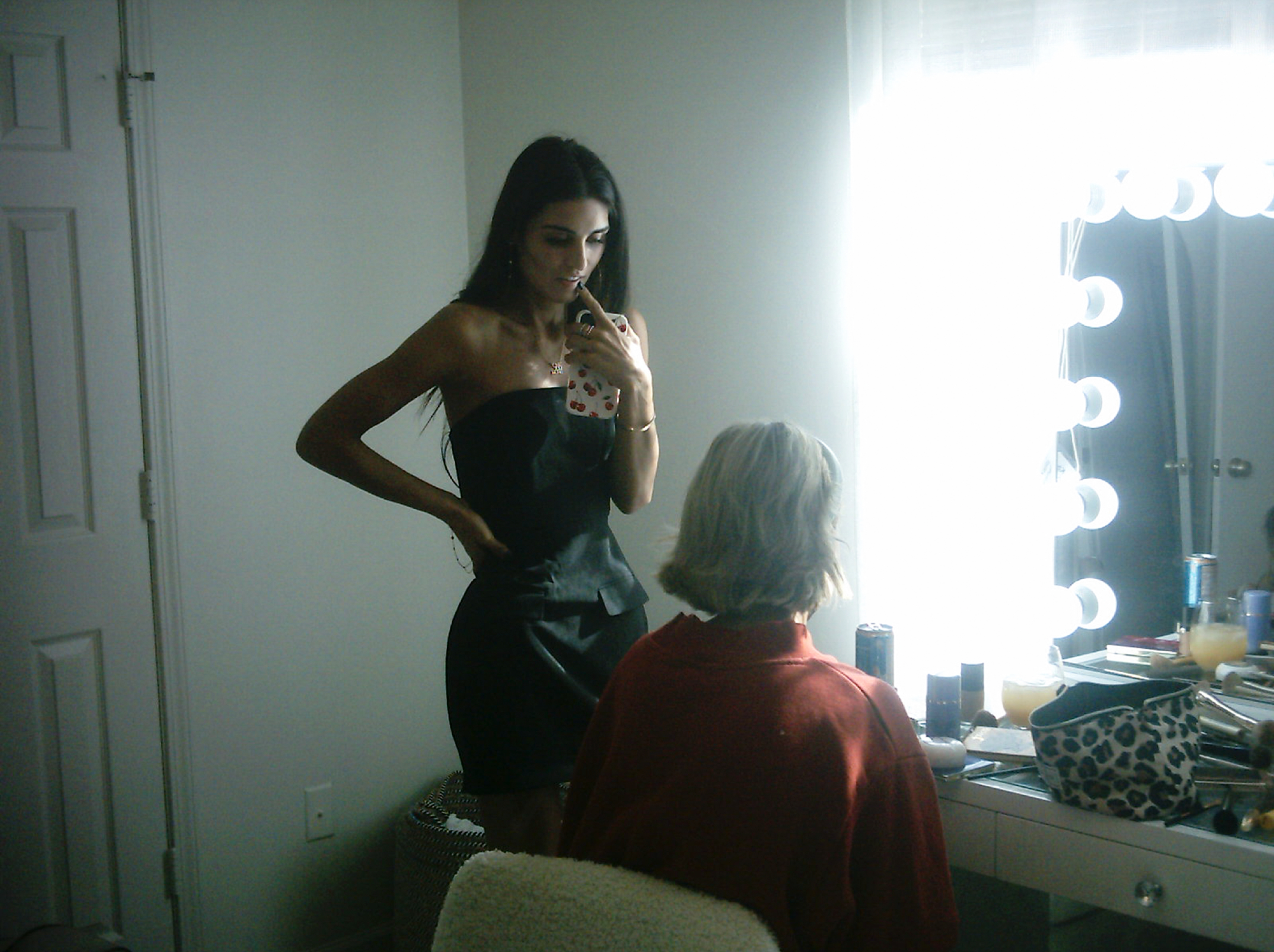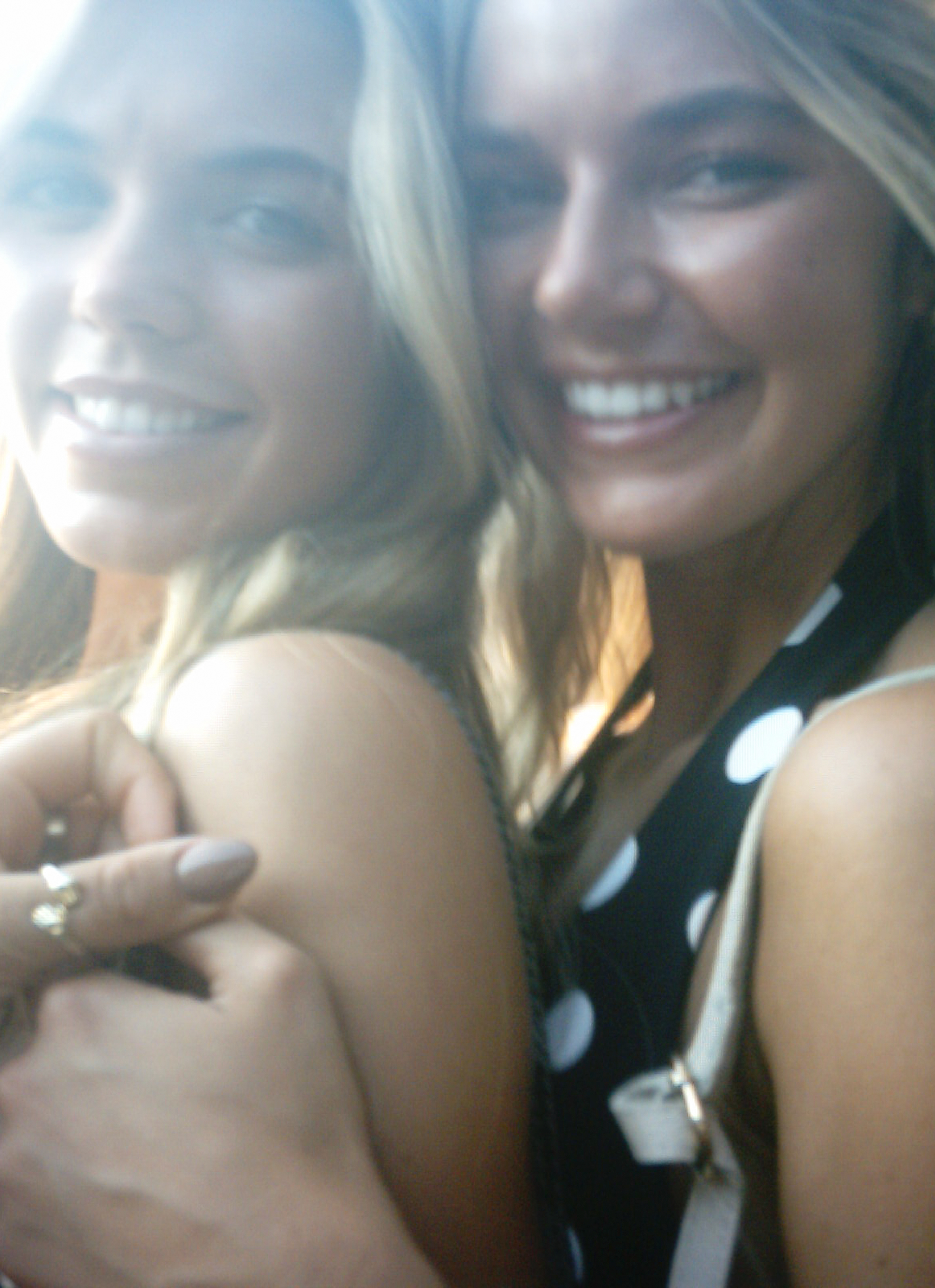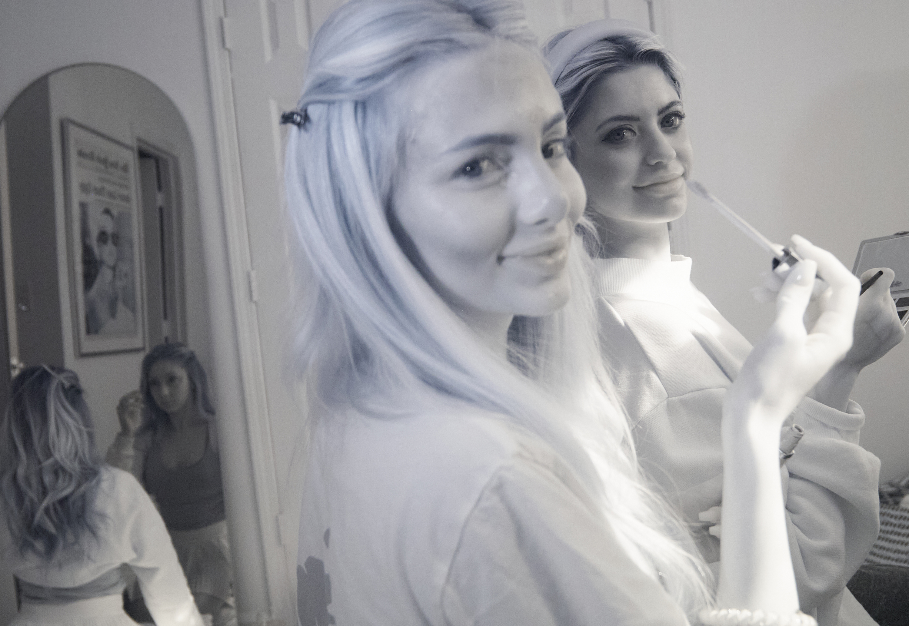The next morning, I ring Izzy’s doorbell twice before she answers, overnight tan still smudged on her face and hands. Kylan and Izzy planned to start getting ready at 7am for the 11am game kick-off, but they both overslept after getting in at 2.30am from drinking downtown. Izzy shows us to her glam room upstairs. At its centre is a long smart mirror vanity that features a digital display of the temperature, among other figures. There’s a shelf lined with designer bags and shoes, tiny pairs of Louboutins and a mini pink Hermès Kelly decorated with charms. “Last night I was drinking Don Julio, this morning I’m acting a foolio!” Kylan proclaims as she marches in, saddled with bags of clothes and make-up.