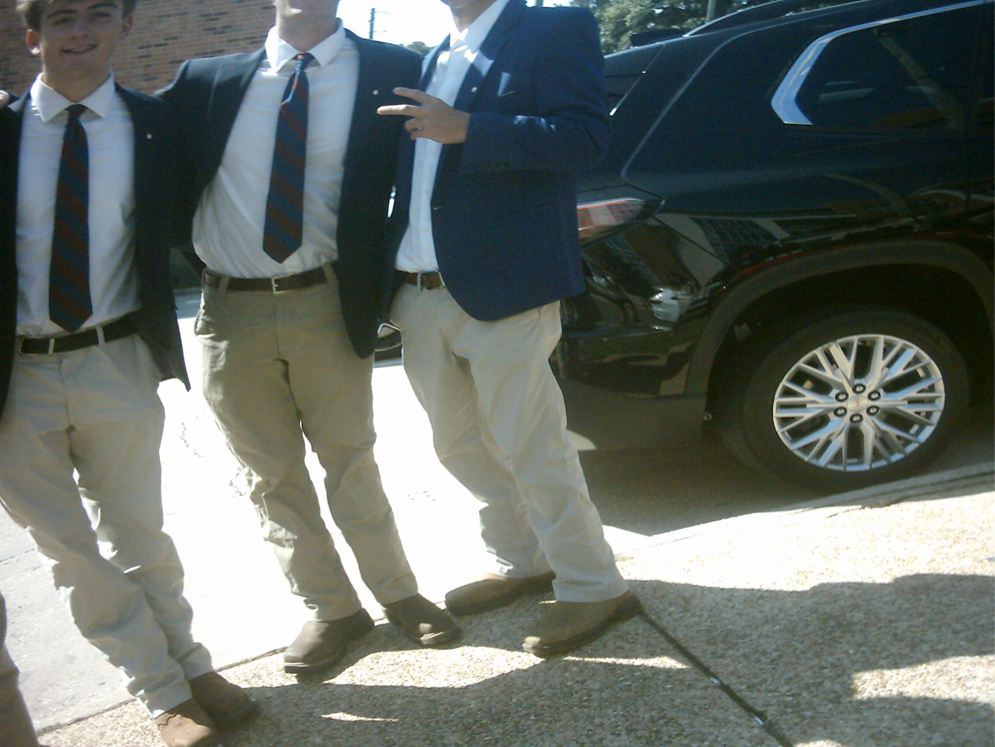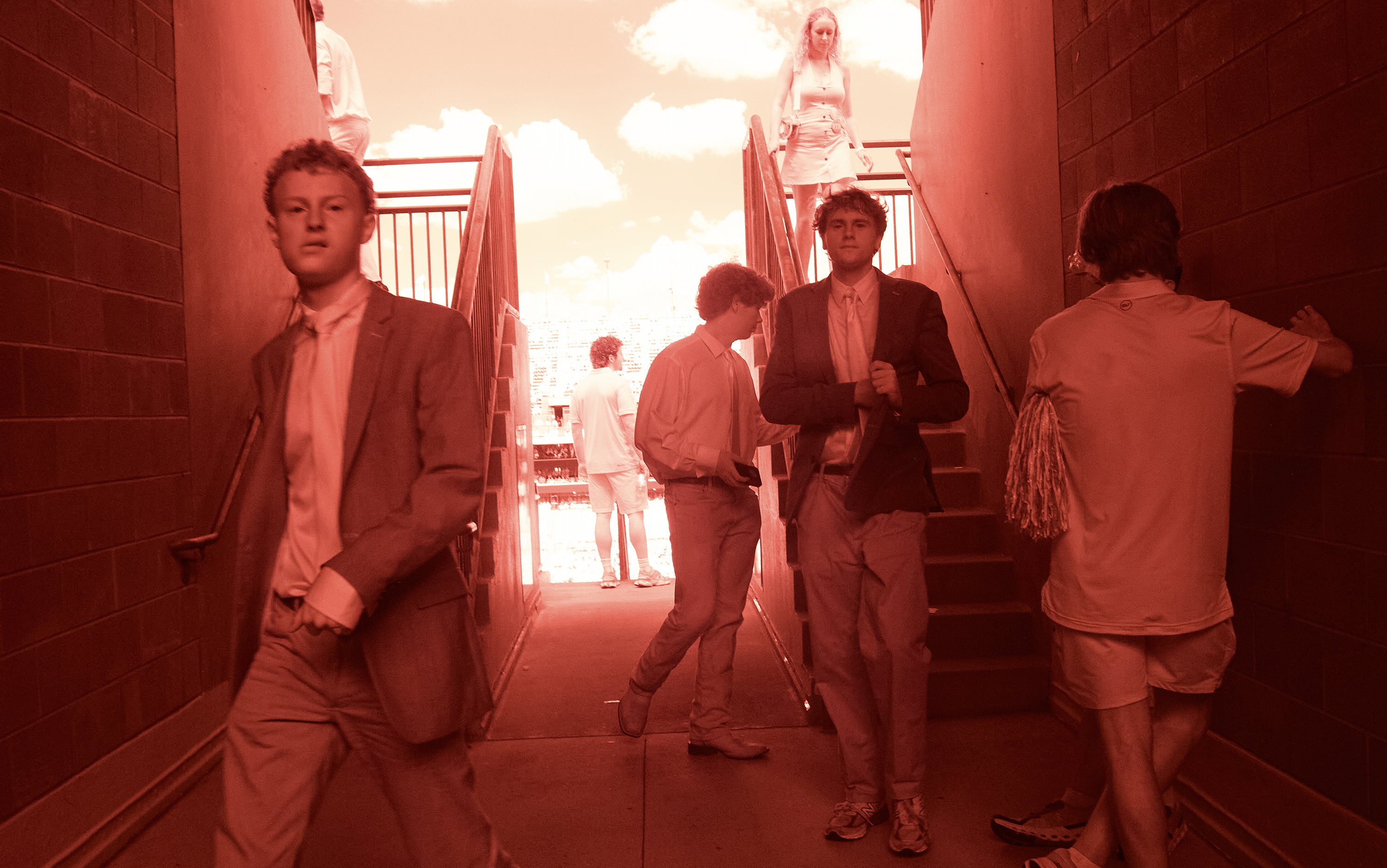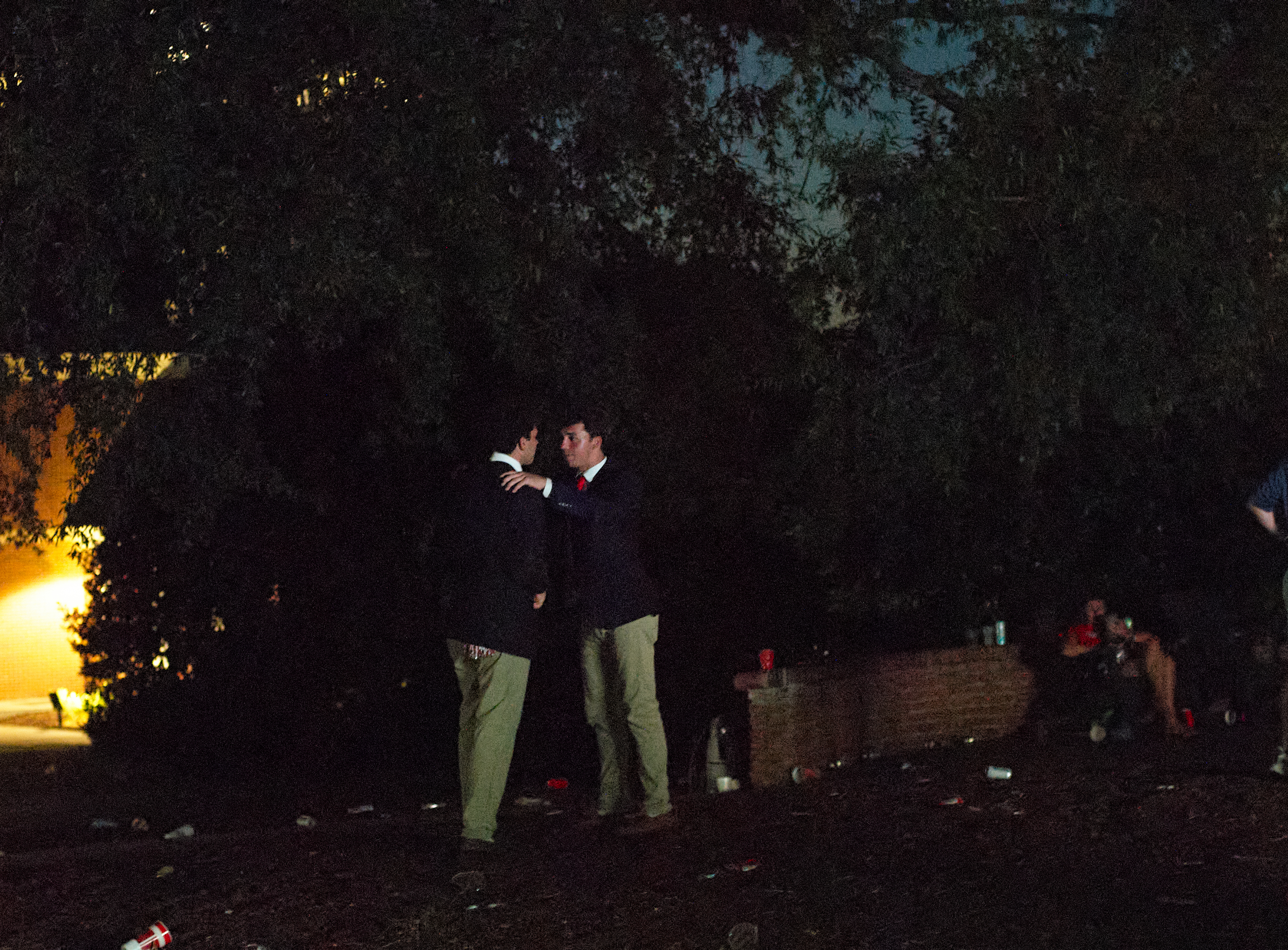 I approach two boys in blazers and red ties, the required game day uniform for pledges – recruits who have accepted a fraternity’s invitation but have not yet been fully initiated – to ask where I should go out tonight.