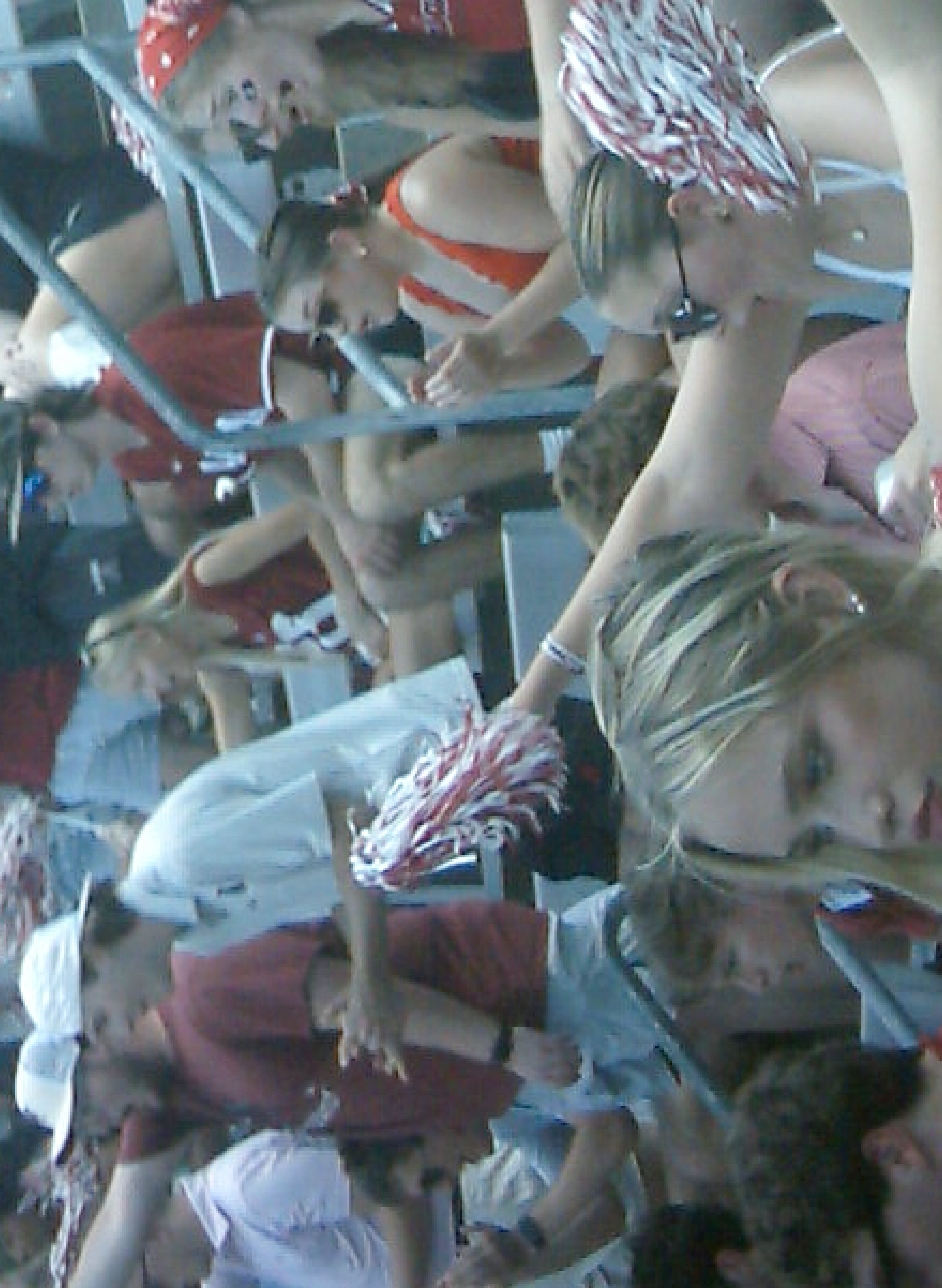 I have a cheap seat in the upper bowl, the tip-top of the stadium reserved for freshmen and fans on a budget. This high, the heat and the tribal energy of new arrivals create the atmosphere of a bustling market in a desert country. Pledges in identical blazers and white shirts move up and down stairs like ants carrying leaves. Skinny boys slosh around with trays of lemonade. A ball of crumpled aluminium thuds off my shoulder.