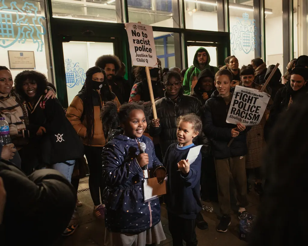 Blocking off the road in front of the police station, speakers at the demo included youth workers, activists and children who urged that the school’s teachers be held to account. “We are disgusted, and it was wrong. She didn’t deserve that. She’s still going through the pain and the trauma of it all,” one said. “It shouldn’t happen to any child, no matter what their race is. It should never happen again,” said another.
