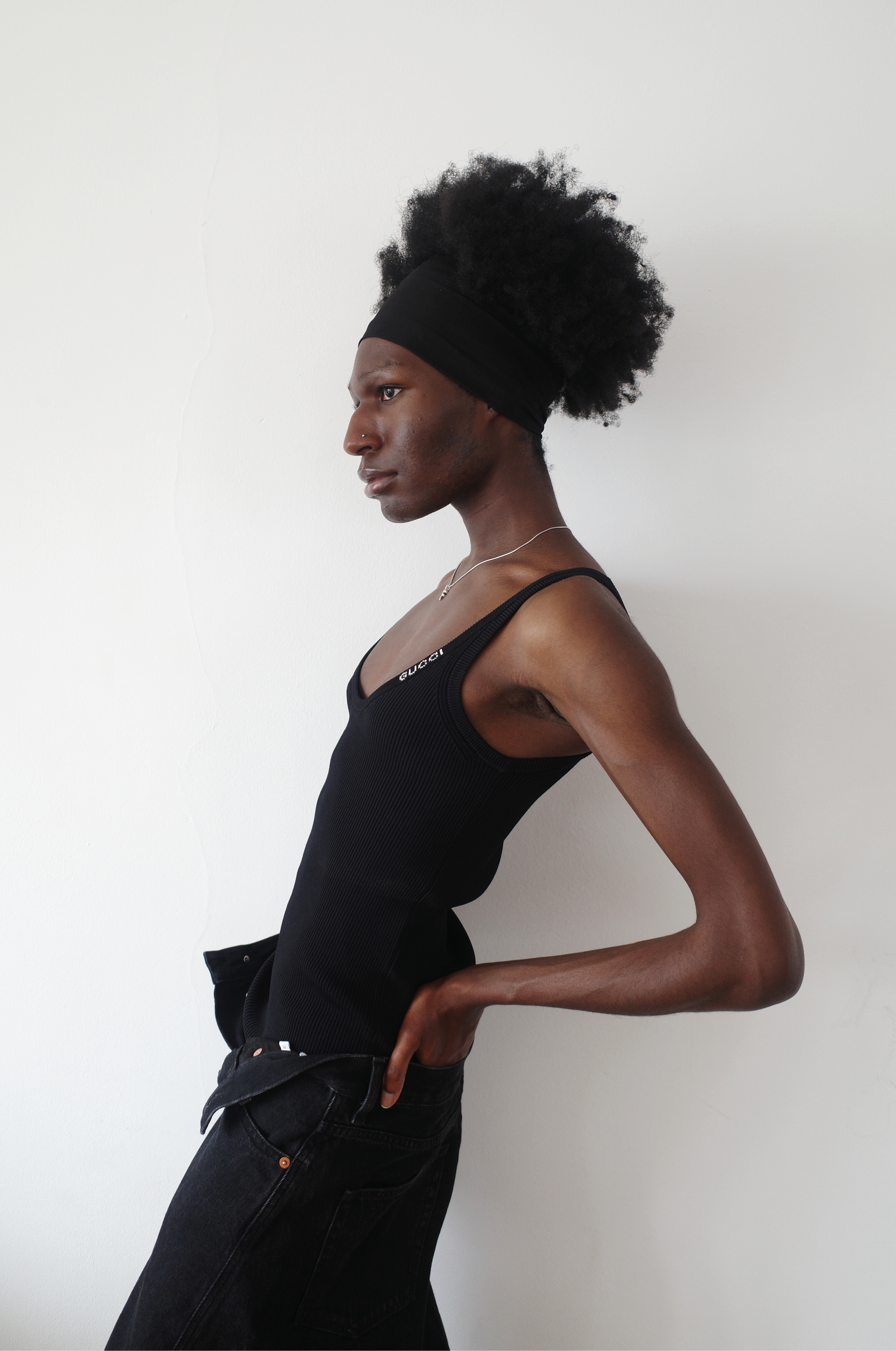Fari wears top and trousers GUCCI and headband and necklace talent’s own
