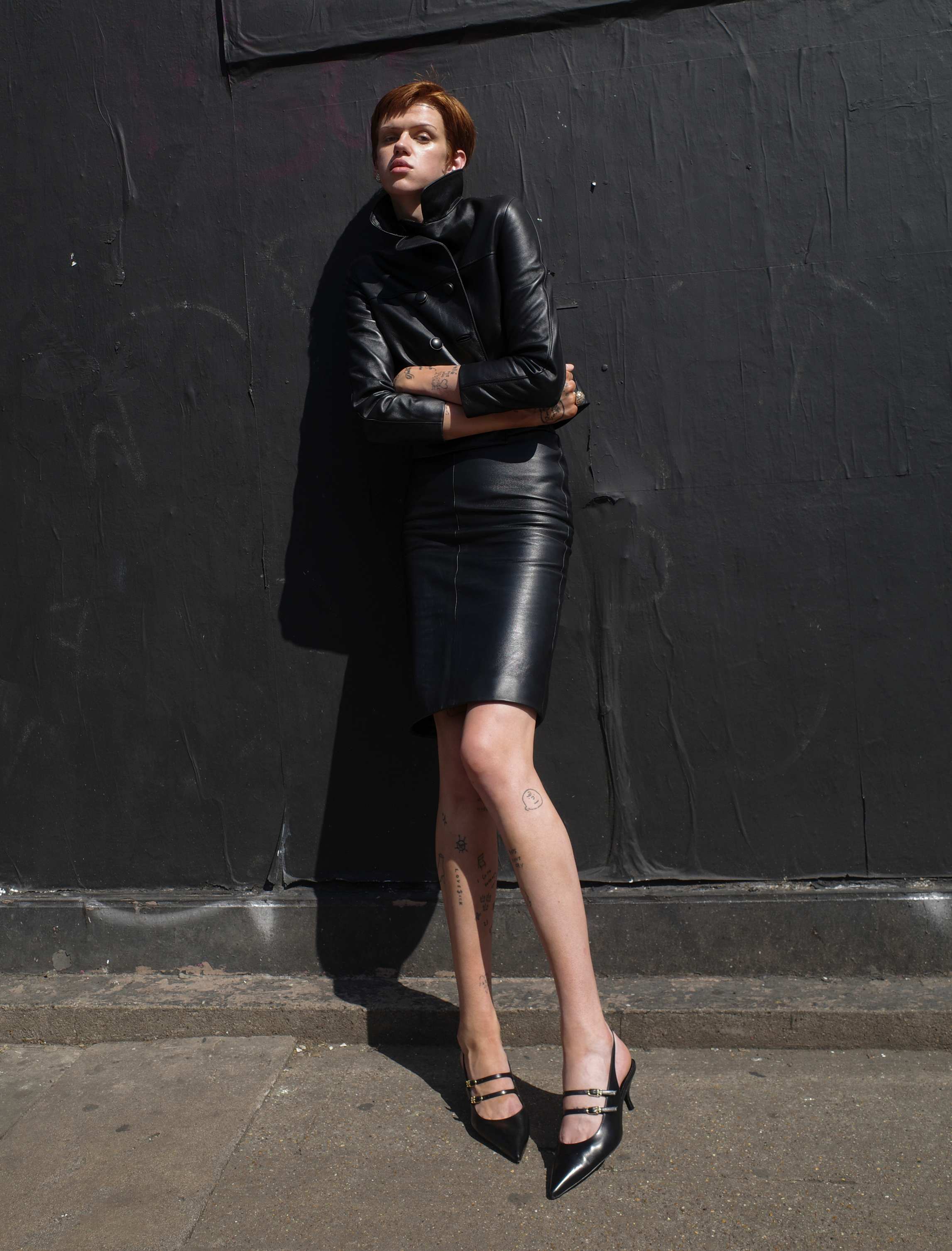 Theo wears bodysuit LOUIS VUITTON, tights CALZEDONIA and shoes JIMMY CHOO