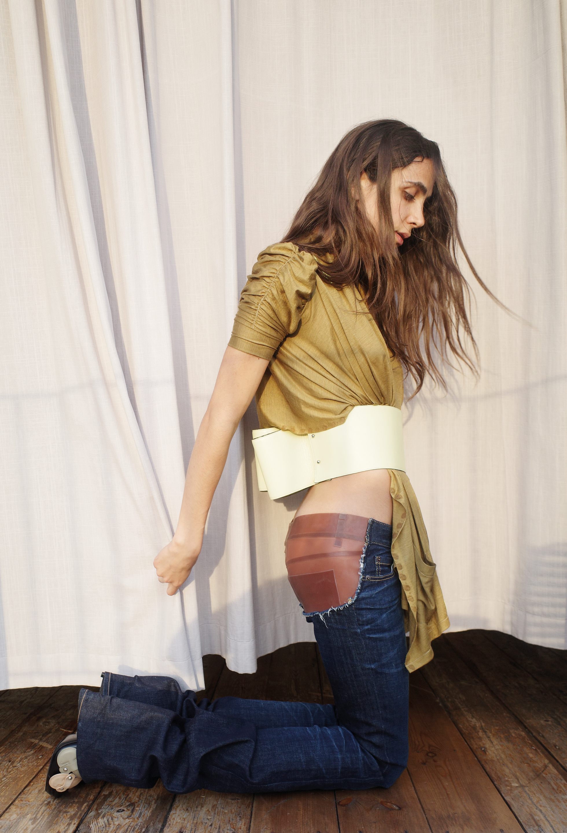 Morena wears top and belt AXEL SANDAGER, trousers DSQUARED2 and shoes LOUIS VUITTON