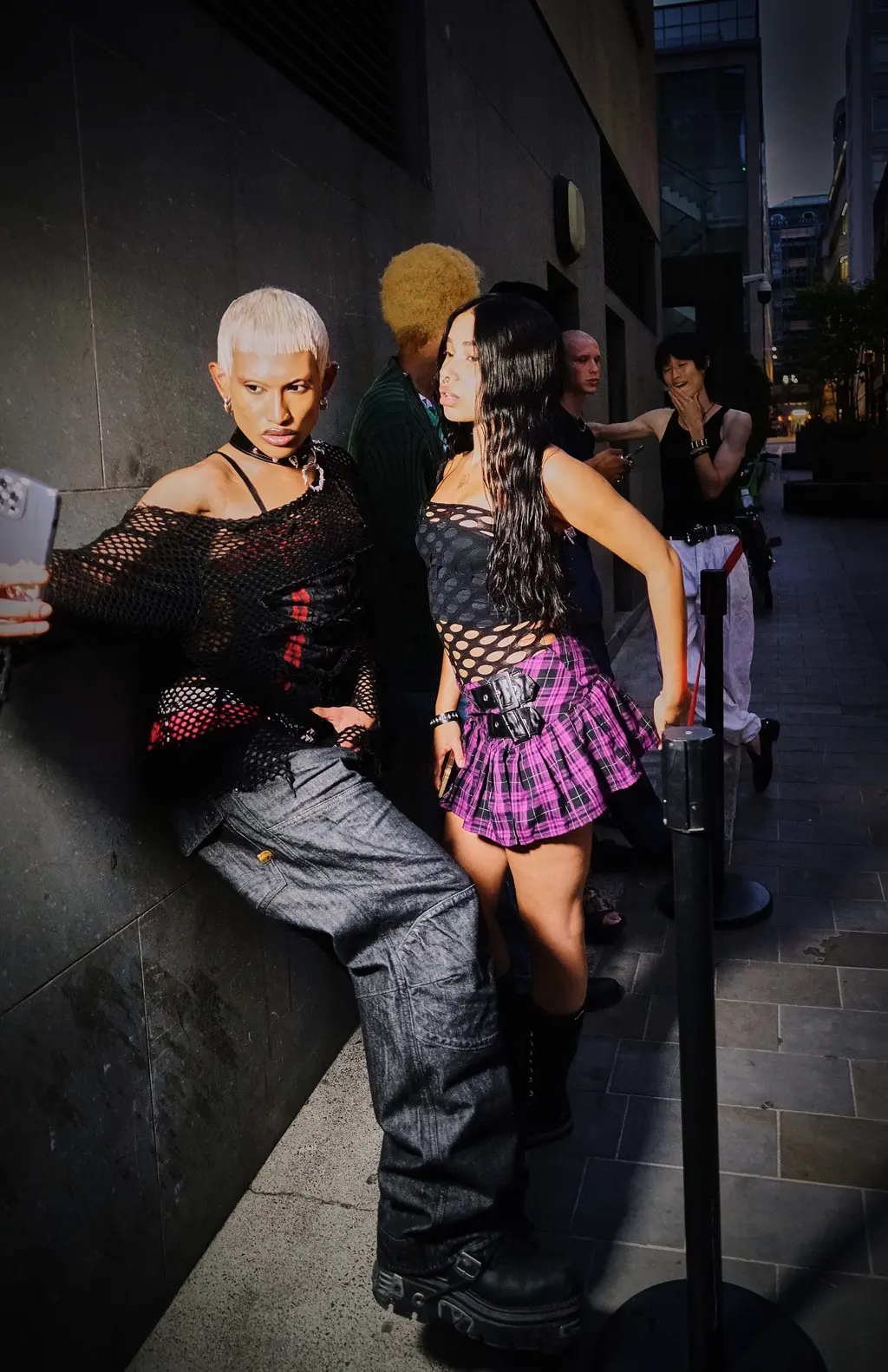 Key fashion signifiers: Face paint, fishnets, side fringes and multi-coloured highlights