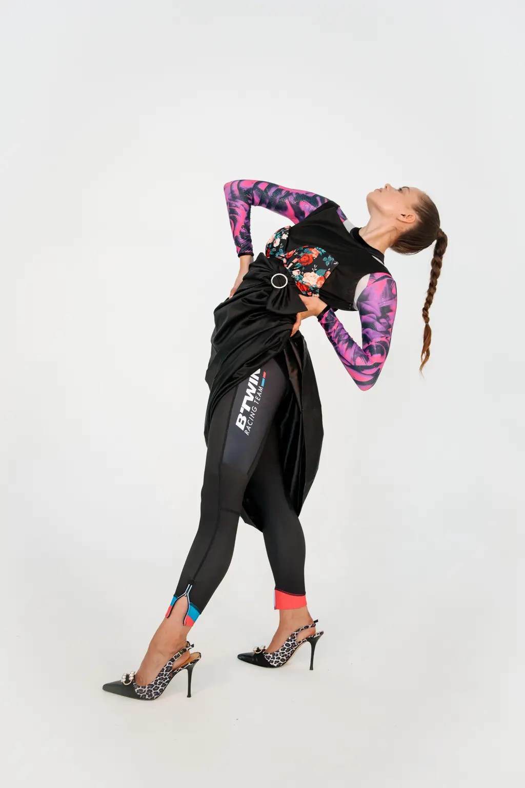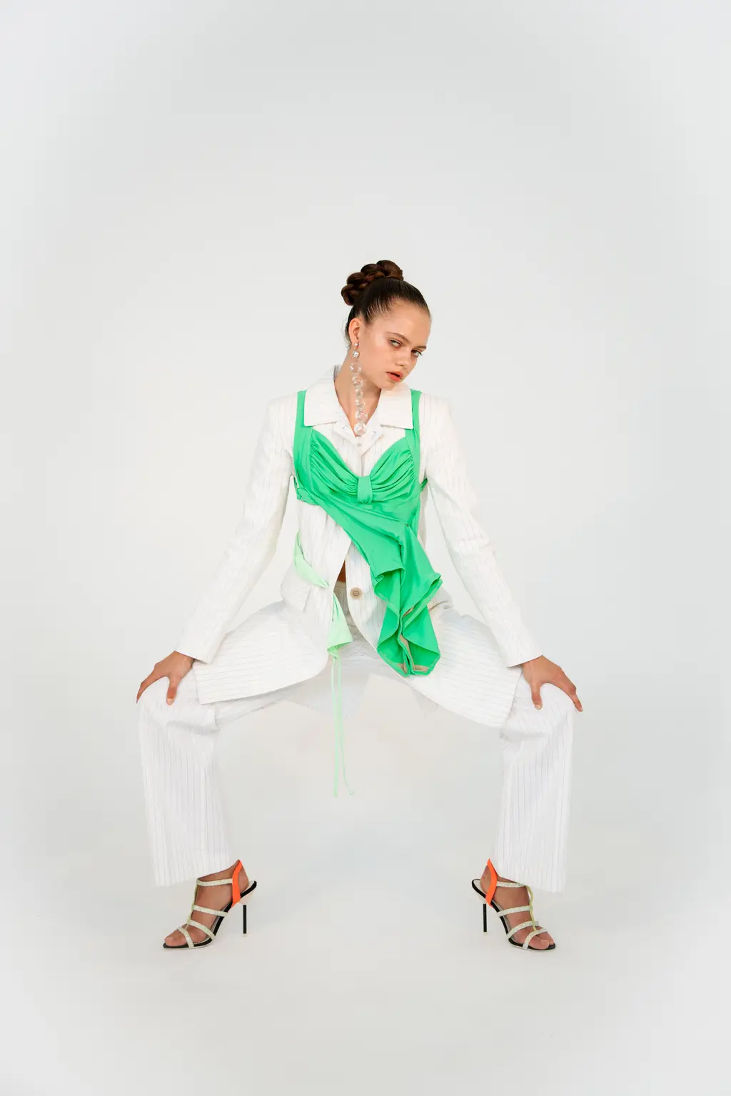 With 3am Eternal though, Price’s designs have become more abstract. More colour, more layering – think emerald green crop tops worn over clean white shirts – power dressing staples worn with sport-tech materials from contemporary brands like Prada, Escada and Sportmax. Despite the fact that the pieces are all up-cycled, the siblings “worked on the collection in the same way we would work on any collection,” says Price. “We put together a line-up, did a range plan, selected our colour palette, and decided fabrics. Then rather than making each piece from scratch, we sourced existing pieces we felt we could adapt.”