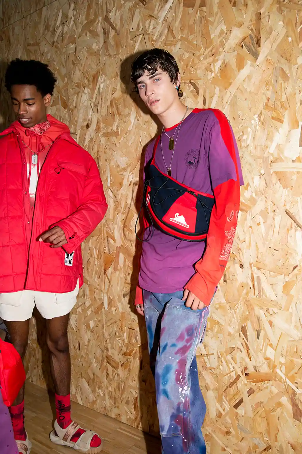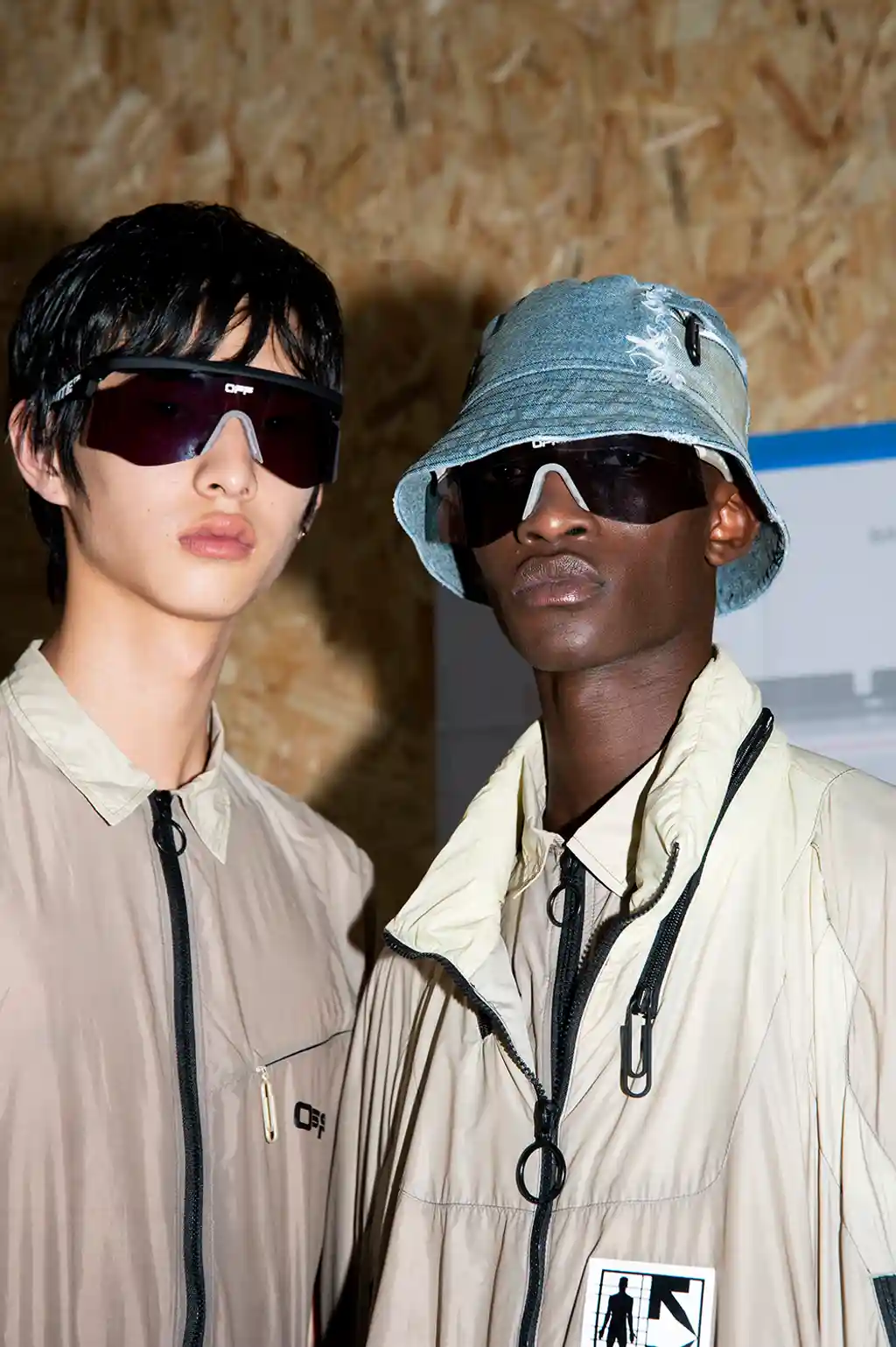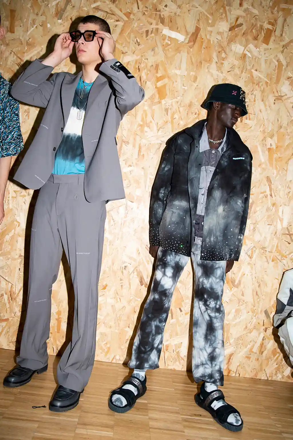 A melange of vibrant colours and prints, Virgil’s SS20 Off-White collection is bold, expressive and optimistic. Inky tie-dyes, doodle-like graphics, graffiti prints, and paint splattered fabrics are central to the collection, seen peeping beneath oversized suits and printed on two-piece suits (complete with branded patches on the left jacket sleeve) and dresses (the two that featured in the runway collection). Stand out looks include a black denim tie-dye co-ord decorated with a diamanté jacket hem, a washed-out bamboo and floral print cropped bomber and a cream cable knit sweatshirt and shorts combination.