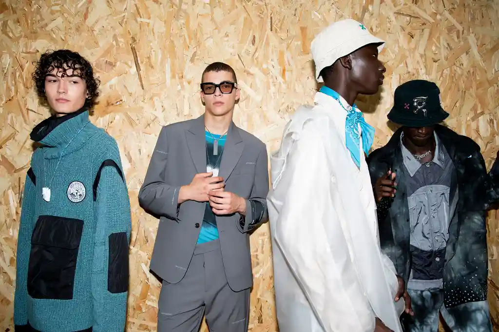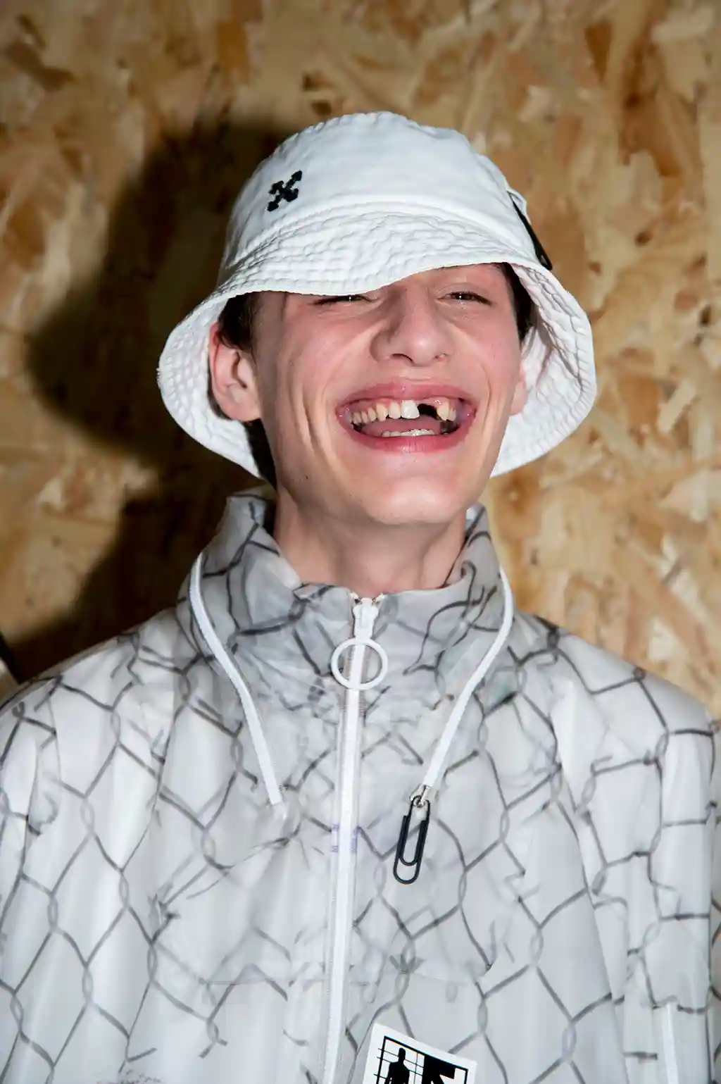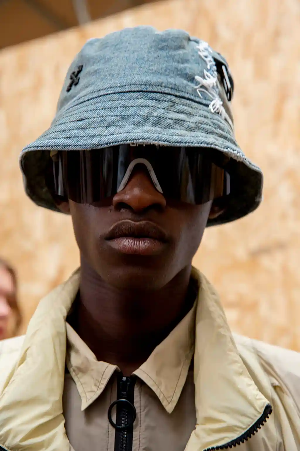 A melange of vibrant colours and prints, Virgil’s SS20 Off-White collection is bold, expressive and optimistic. Inky tie-dyes, doodle-like graphics, graffiti prints, and paint splattered fabrics are central to the collection, seen peeping beneath oversized suits and printed on two-piece suits (complete with branded patches on the left jacket sleeve) and dresses (the two that featured in the runway collection). Stand out looks include a black denim tie-dye co-ord decorated with a diamanté jacket hem, a washed-out bamboo and floral print cropped bomber and a cream cable knit sweatshirt and shorts combination.