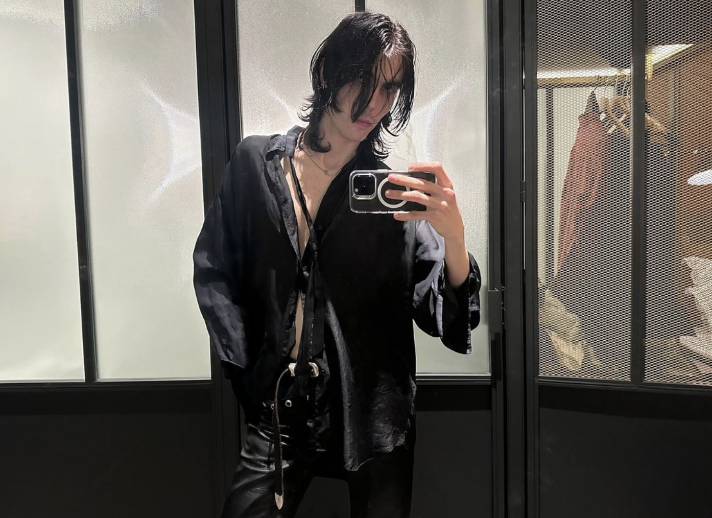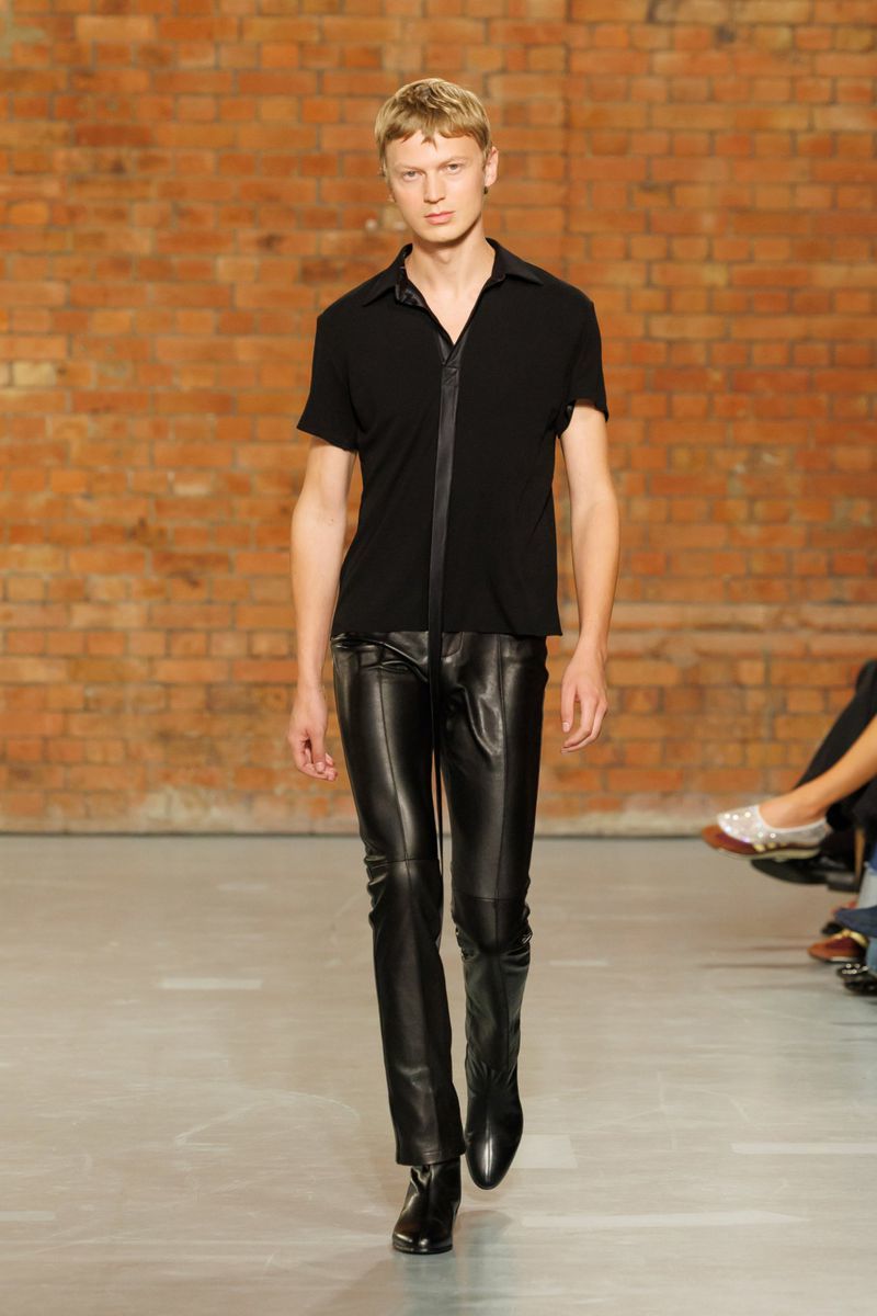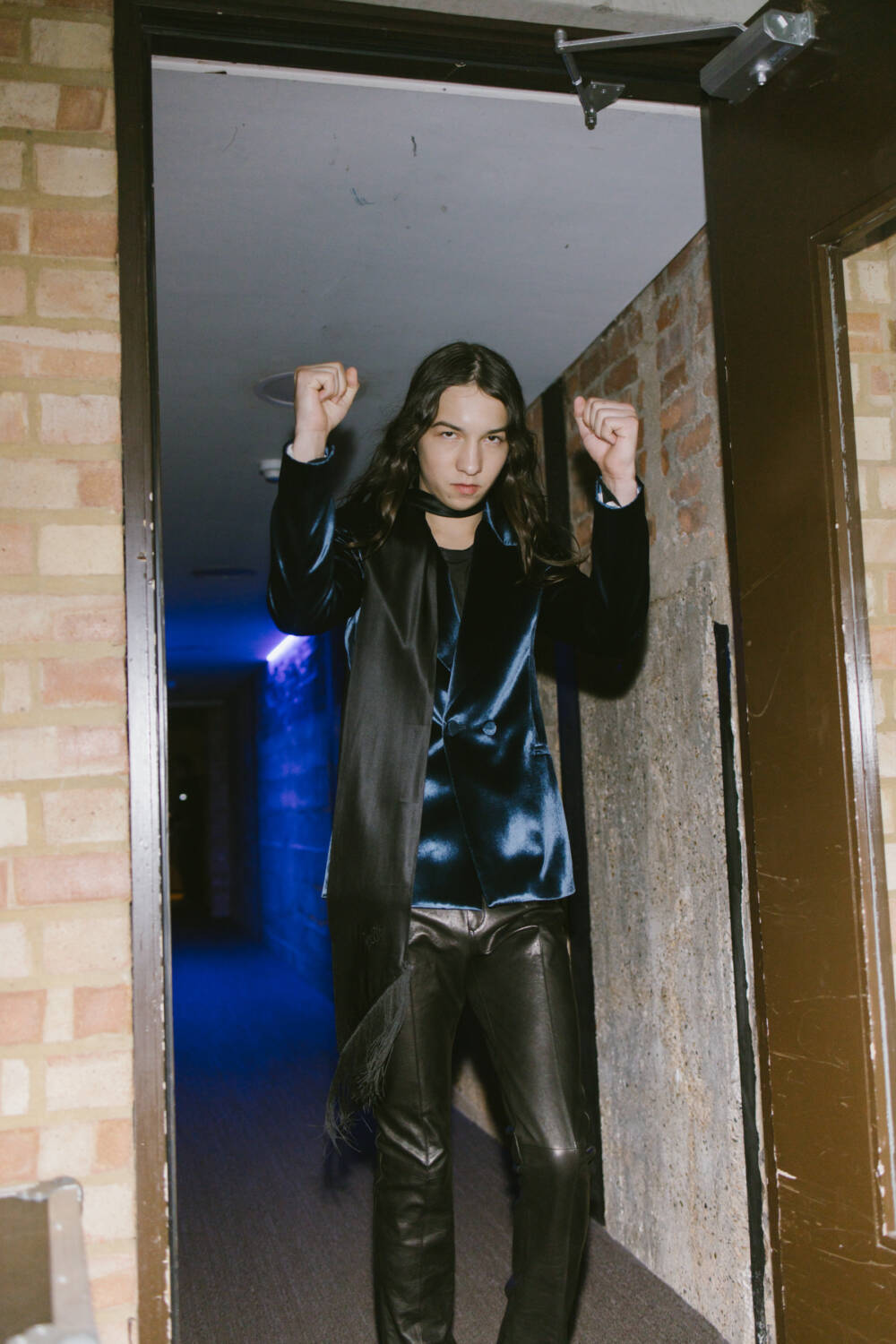 This sensibility was apparent in his SS25 collection, where models Jonas Glöer and Kiki Willems – who are also the designer’s neighbours – strutted down the runway wearing svelte leather trews, silky dinner jackets and gossamer satin lapels that caressed and flounced from evening gowns. Dressing upwards, if you will. “It’s not about Jonas and Kiki walking the show because they’re Jonas and Kiki,” says Aaron. “It’s because they were literally at the party we’re talking about conceptually.”