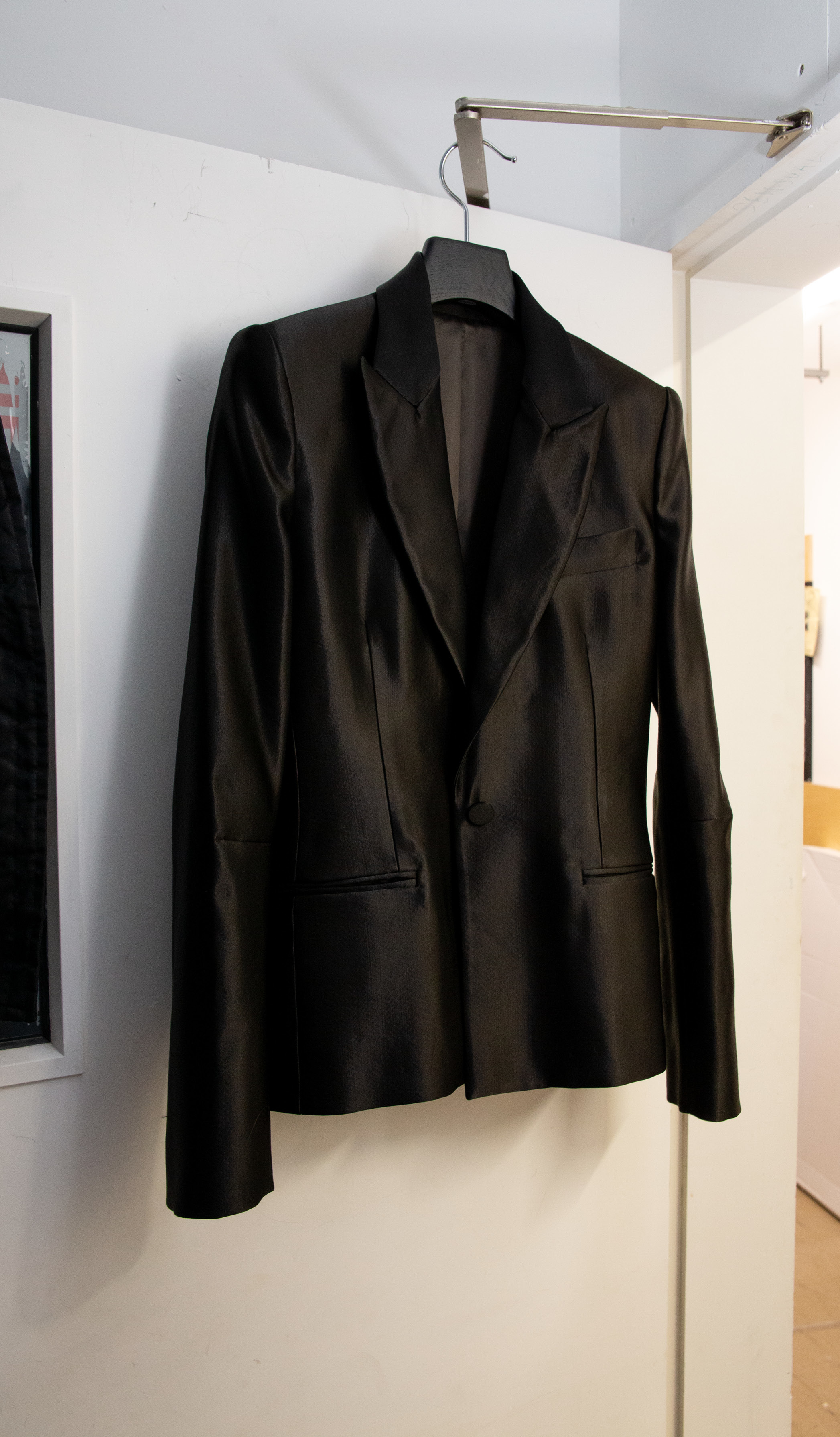 “If you ask me, ‘What does it mean for me to be British?’ – in blood, I’m not English at all [he’s Cypriot/Polish], but I was born in London – my Britishness is in Savile Row and British textiles. We’re not able to hand-felt, pad and canvas all the jackets, but we’ll add as many elements that nod to Savile Row as possible – such as having striped acetate sleeves. It’s such a small detail, but if you know your shit and you open your jacket, you’re like: ‘Oh, that’s a nice touch.’ This jacket [below] is women’s and has these arm darts. It’s got this peplum room at the back and is cut cross-grain, so you have this vertical weave that goes down. It’s lined in cupro and, you know, it’s a fucking nice jacket!”