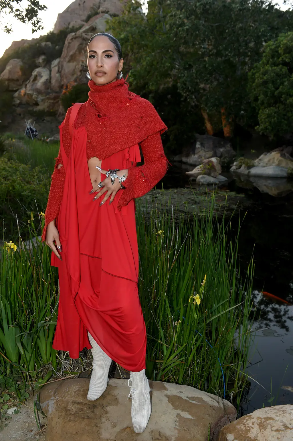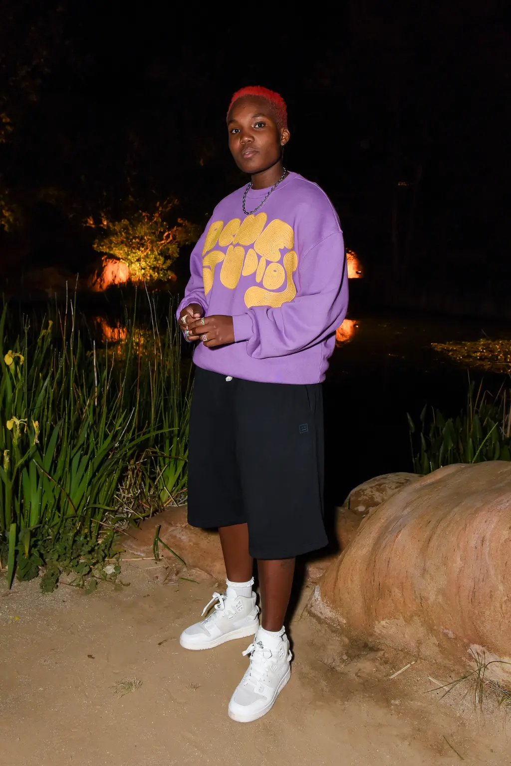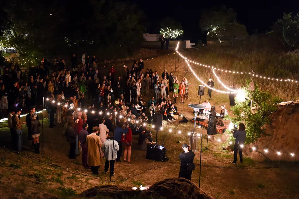 Hidden in the hills, high above cloud level, sits an unfinished house designed by American architect Eric Lloyd Wright, grandson of the esteemed Frank Lloyd Wright. As the sun set on the Wright Residence, overlooking Malibu’s rugged coastline, Acne-clad guests – including Snoh Aalegra, Arlo Parks, Nico Hiraga, Tommy Genesis, Lykke Li, Devon Ross and Kaytranada – enjoyed food, drinks, a live lantern-lit performance by Caroline Polachek, and a special sunset ceremony led by Plessas himself. Rituals are a huge part of his practice, so it was fitting, then, that the technoshaman took guests on a journey via a series of meditations that focussed on wellbeing, friendship, and generosity – toasted with an elixir of natural wine and herbs (naturally).