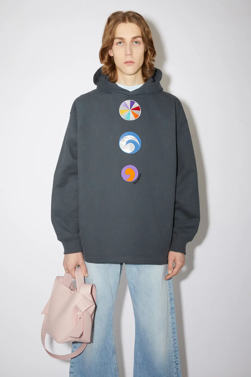 In it, you’ll find pastel and sand-hued tees stitched with circular badges, a maroon bomber jacket peppered with patches and a black hoodie with uncuffed hems. Elaborating on the symbols, Plessas explains: “There’s a fish that represents prosperity, a dragon for immortality and power, an ancient Greek symbol of progress and evolution, a horn that represents fertility, and a serpent-like symbol that centres around health and well-being.”