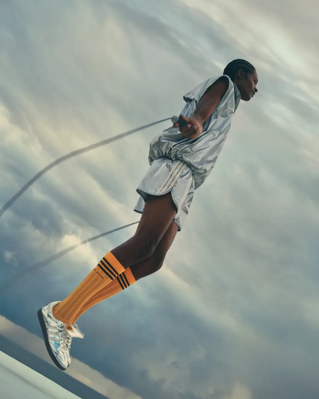 Elsewhere, green and yellow nod to Jamaica’s flag on a duo-tone ringer tee featuring adidas’ three stripes, while textures come via a towelling top and short combo, a geometric-pattern roll neck, knitted sweater vest and – perhaps the brightest, boldest stand-out of SS23 – a strikingly silver short-sleeve anorak with matching runner shorts.