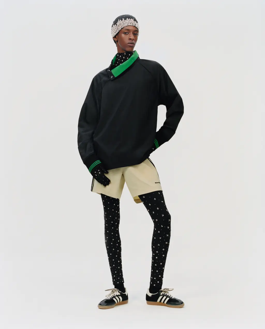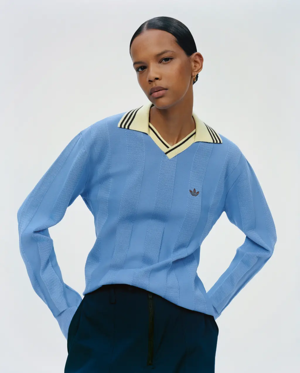As for the clothes, Wales Bonner is no stranger to taking cues from the sartorial history books, this time looking to ’70s and ’90s silhouettes with freeing flares on a pair of loose-legged navy trousers, lightweight nylon tracksuit bottoms and an icy blue tracksuit with reflective pipe detailing. She was inspired, too, by adidas’ long legacy on the football pitch, designing three-stripe football shorts, tube socks and a knitted, collared long-sleeve jersey that mirrors old-school British footie kits.