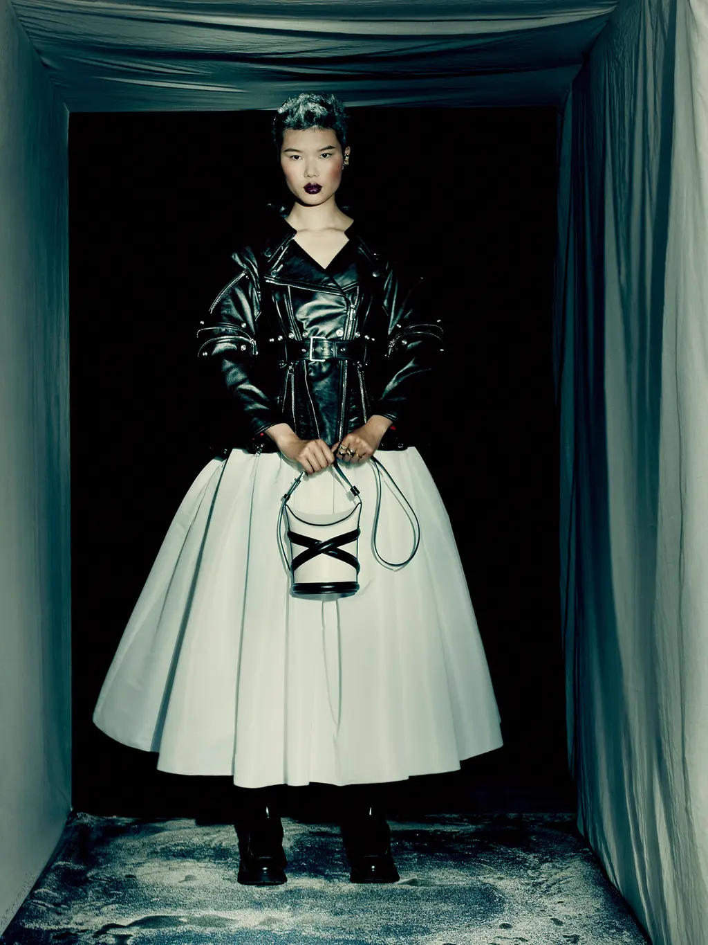 A white skirt voluminously blooms out under a hard leather jacket. The burst of another dress fans out from the waist, cut at the shoulders and embroidered with metal.