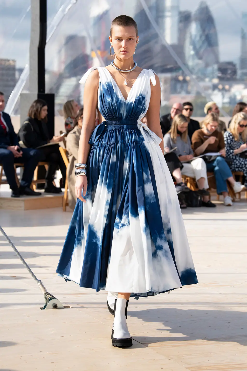Burton’s Londonisms came thick and fast in the collection, but not in the most obvious ways. There was a strong sense of balance, just how the city operates – hectic, slow traffic, warm weather, rainy downpour, polite OAPs, screaming babies. Here, there was a hard and soft approach, like a tough leather trench coat worn over a graceful dress printed with clouds, which were photographed from the rooftops of McQueen HQ and superimposed onto the fabric.